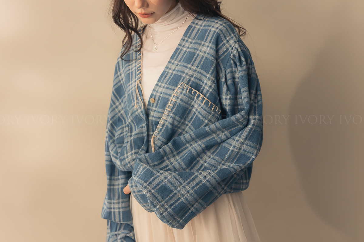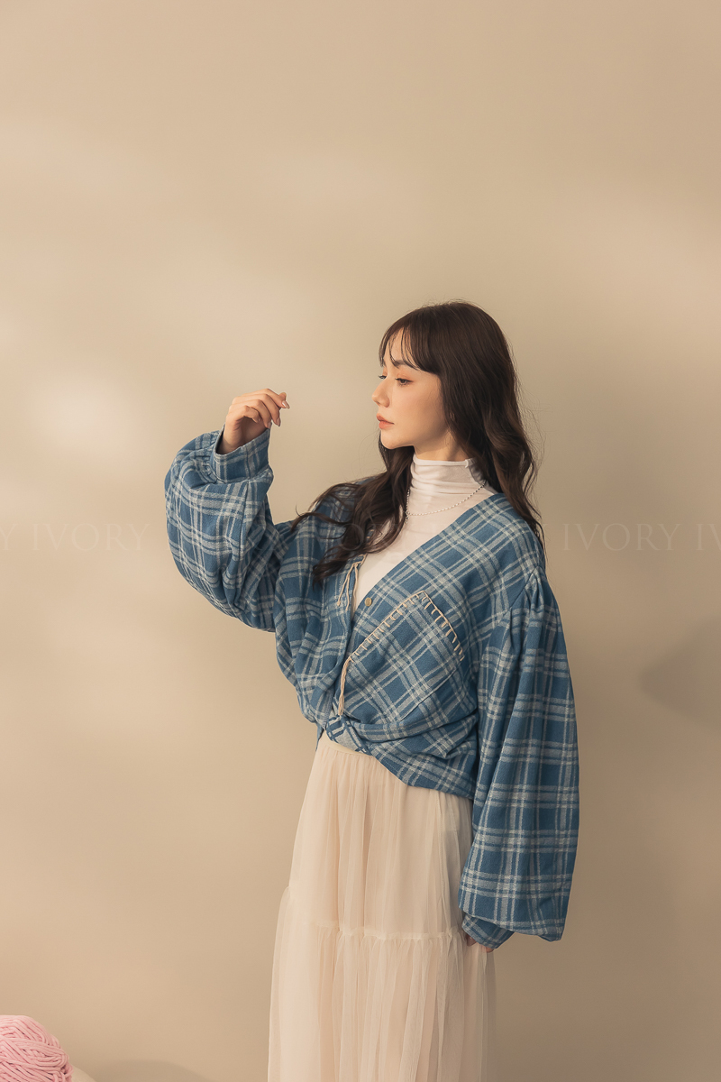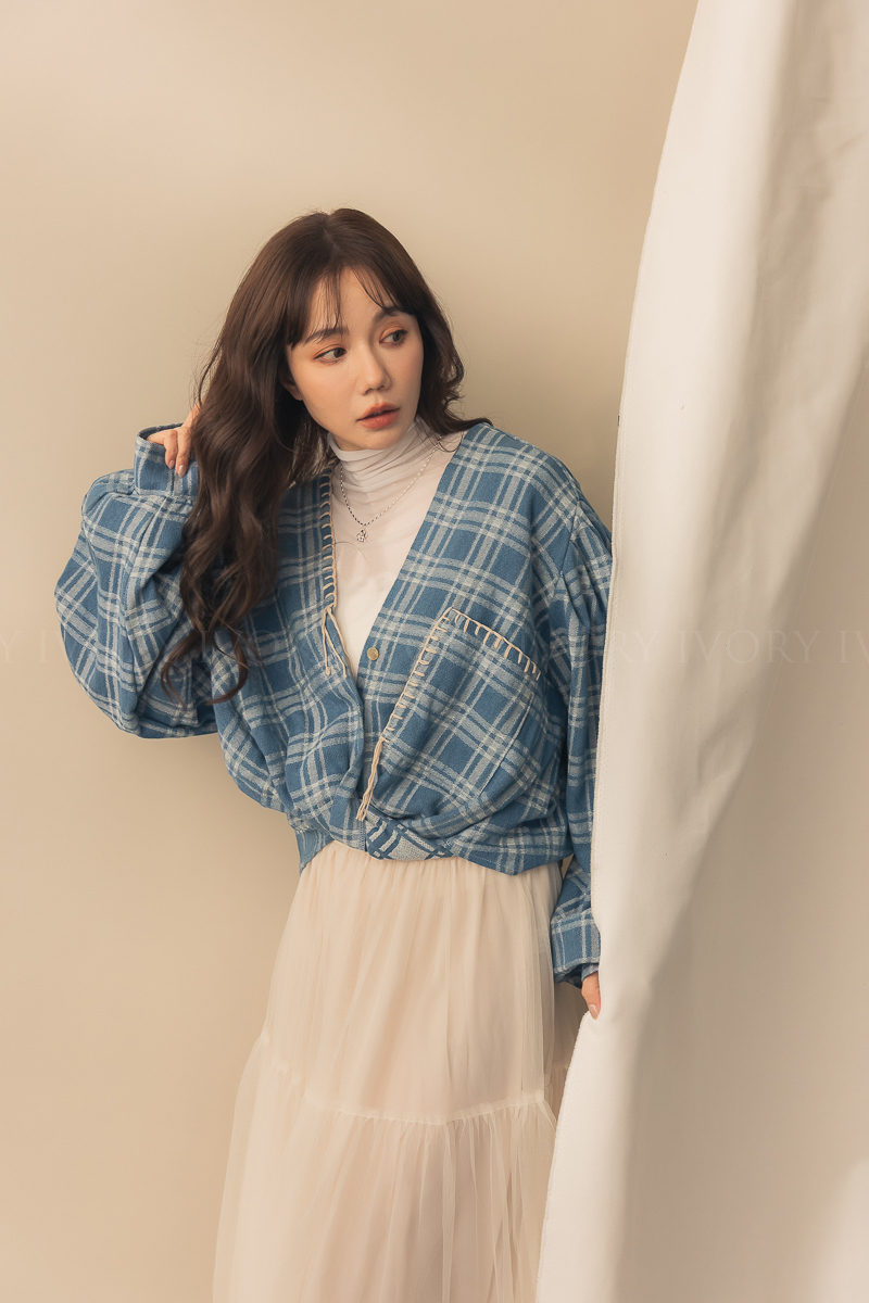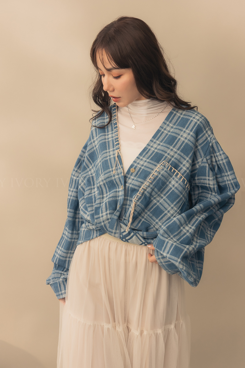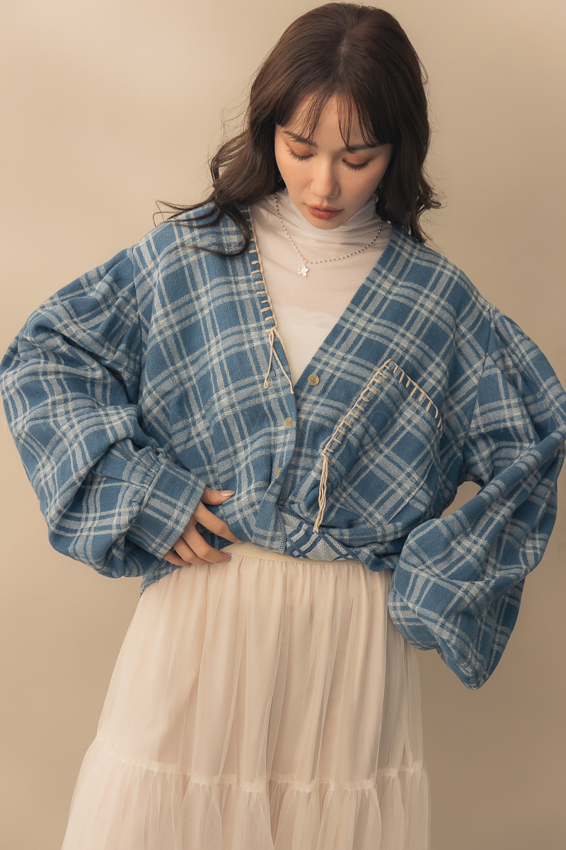 N51023毛線滾邊流蘇格紋扭結上衣< 琦琦清單>