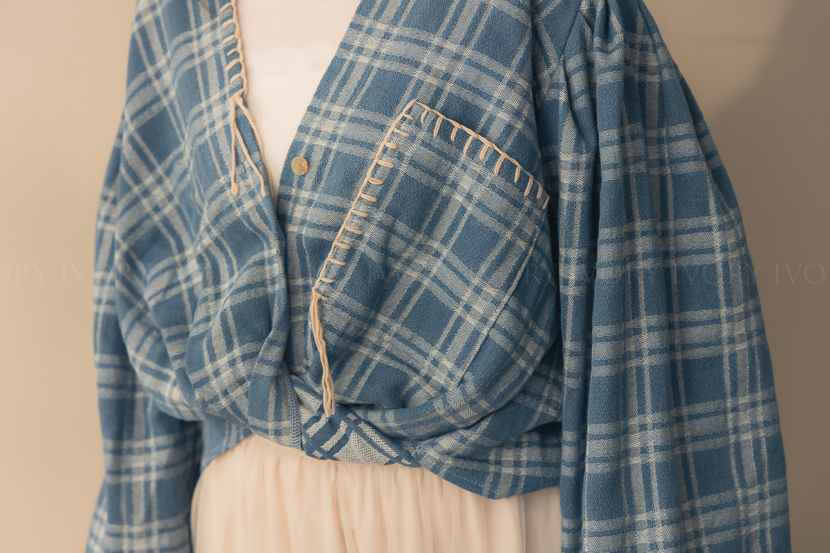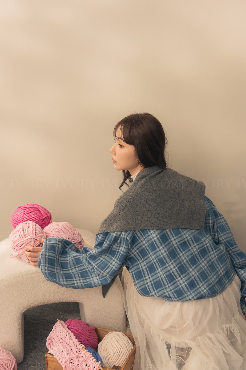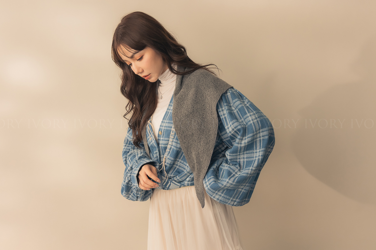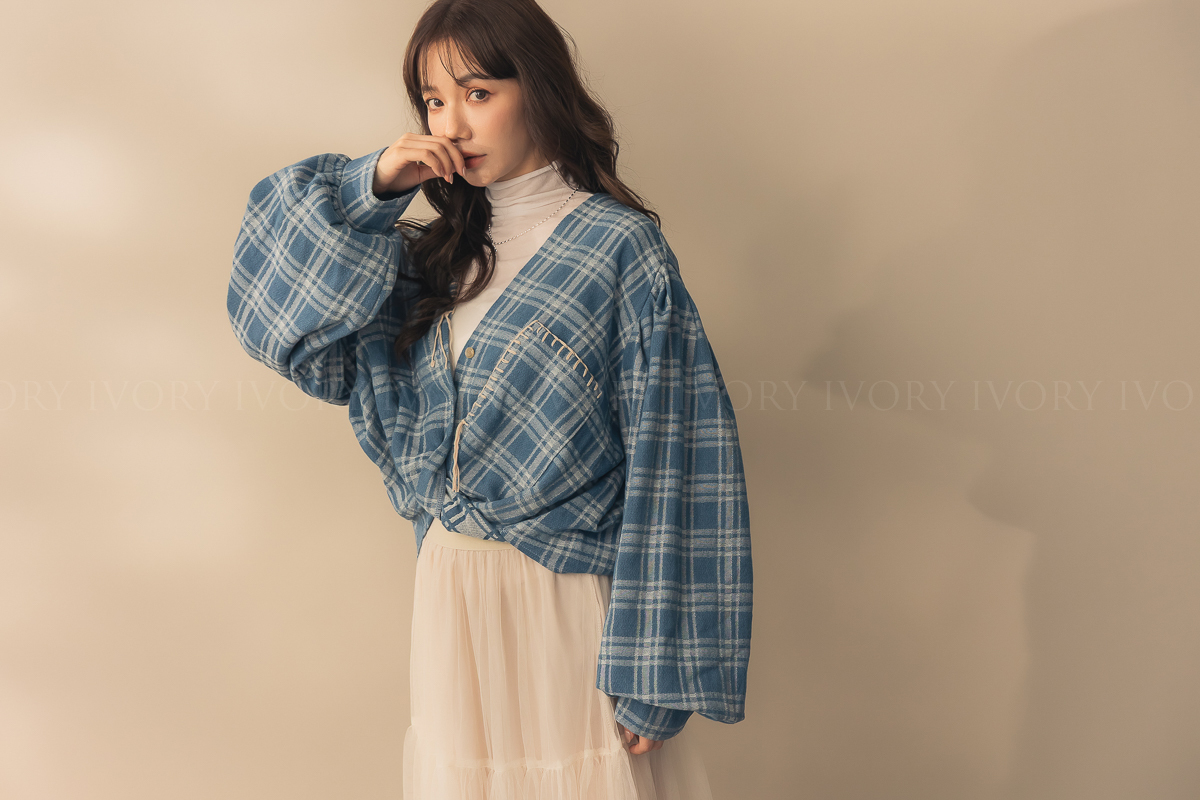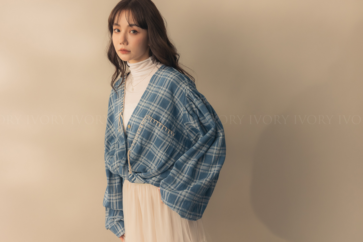 N51023毛線滾邊流蘇格紋扭結上衣< 琦琦清單>