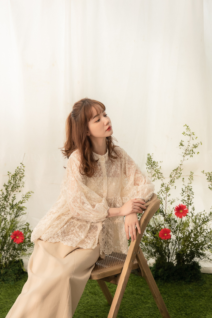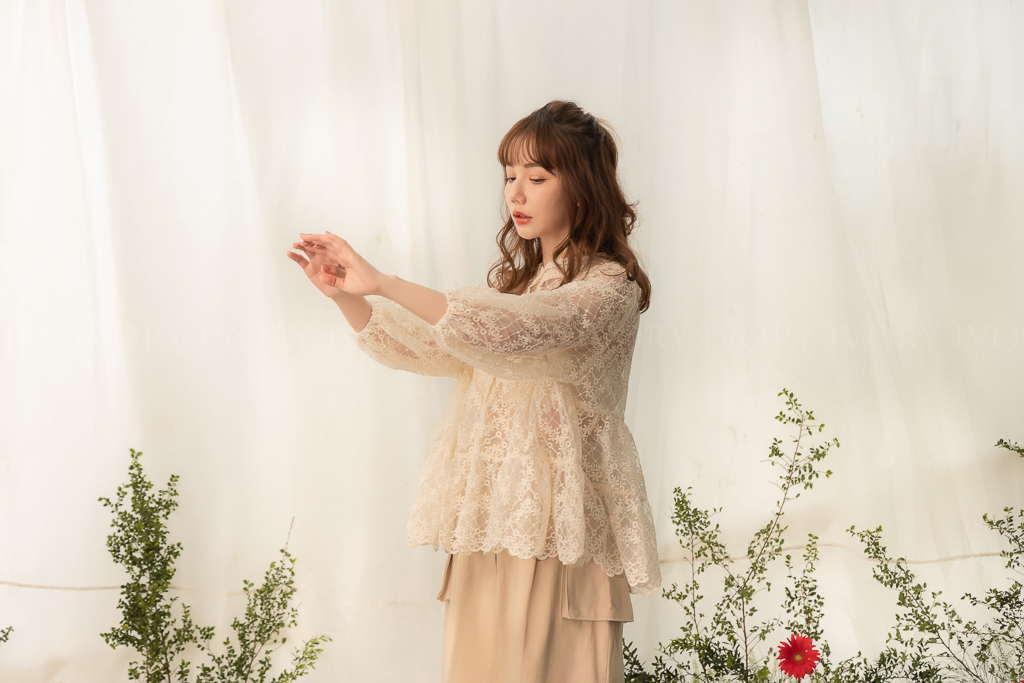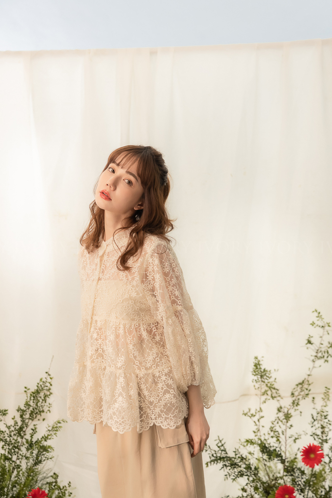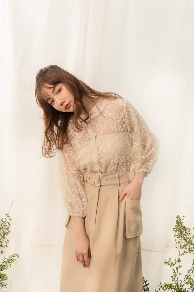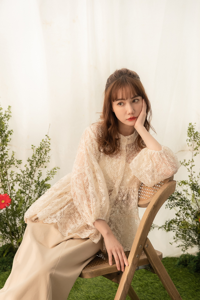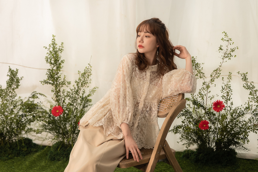 A44026高質感刺繡小花透紗澎袖娃娃上衣