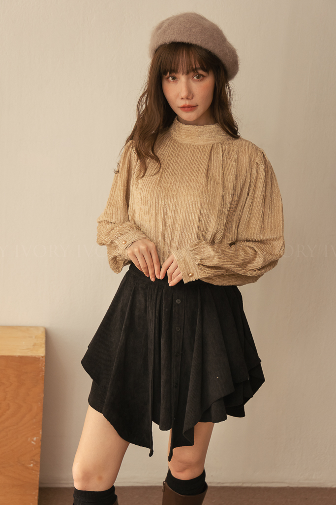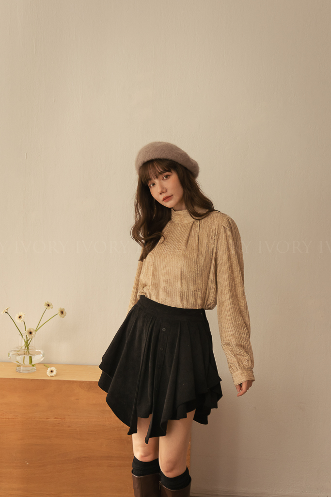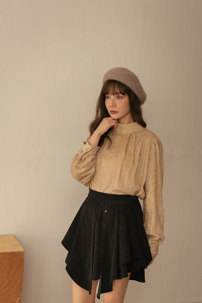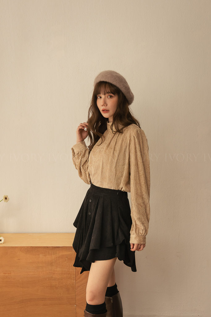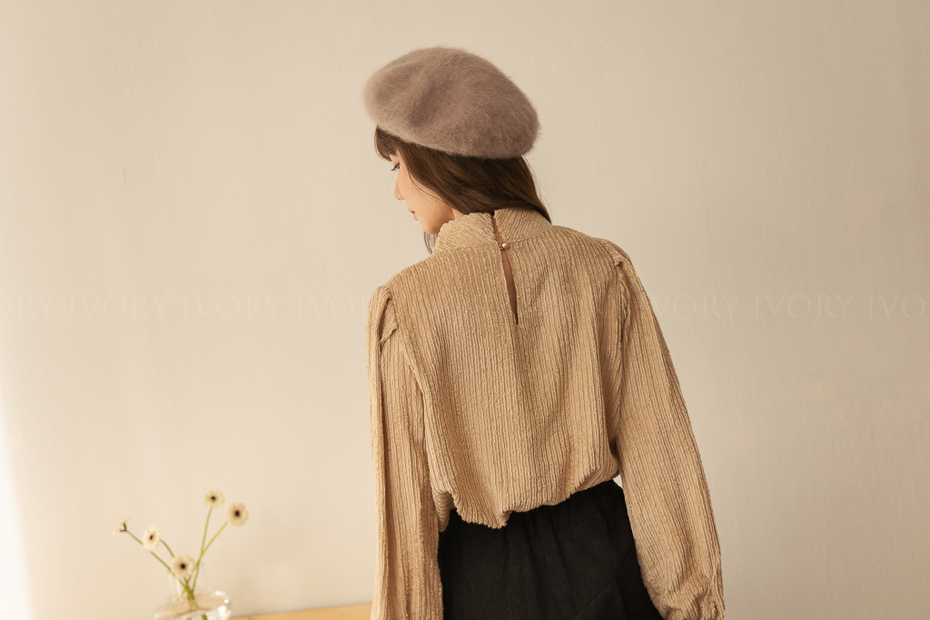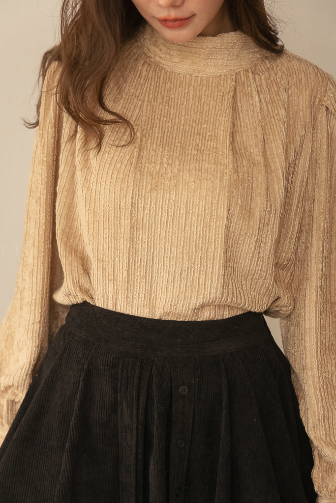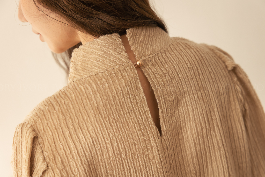 J51015氣質毛毛感直壓紋立領澎袖上衣