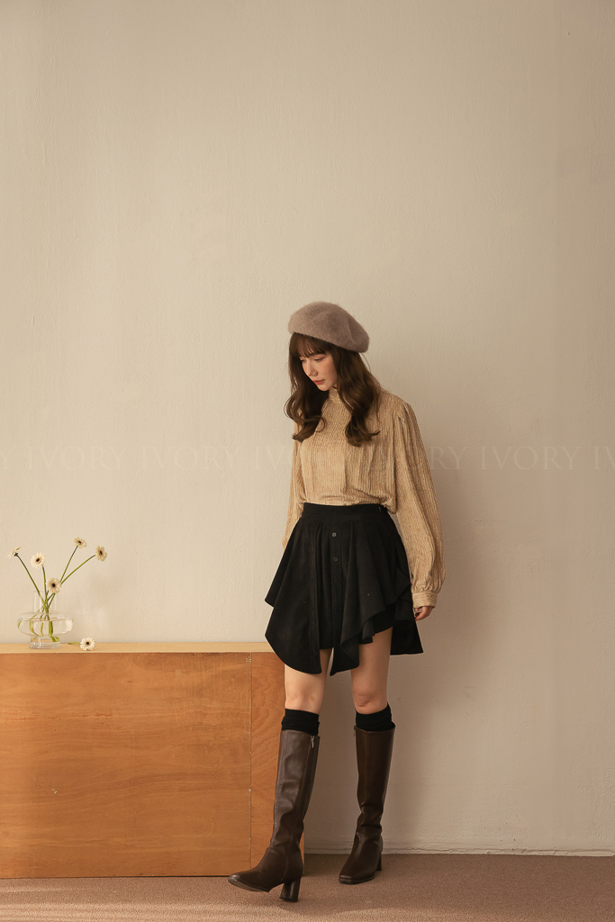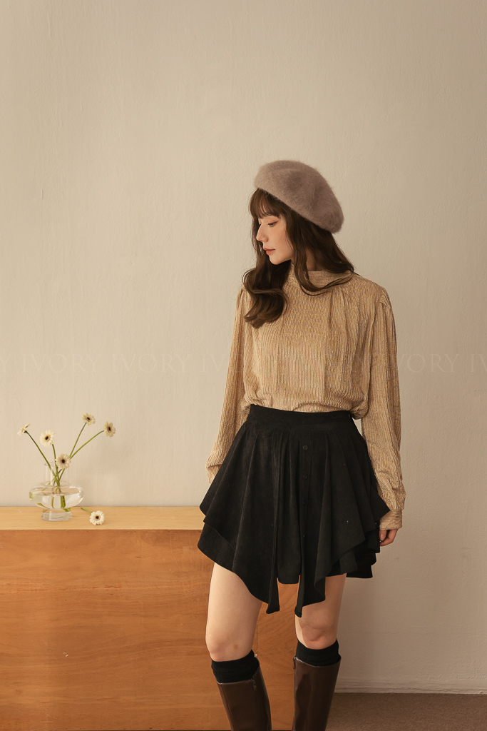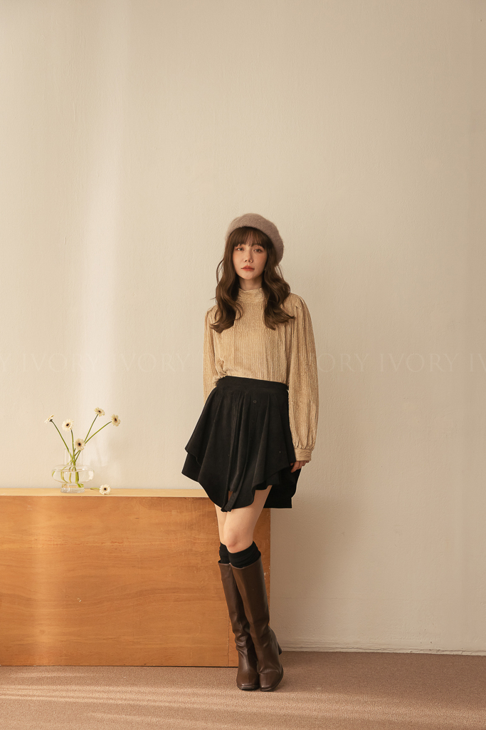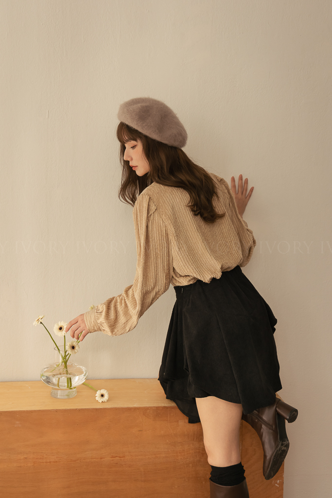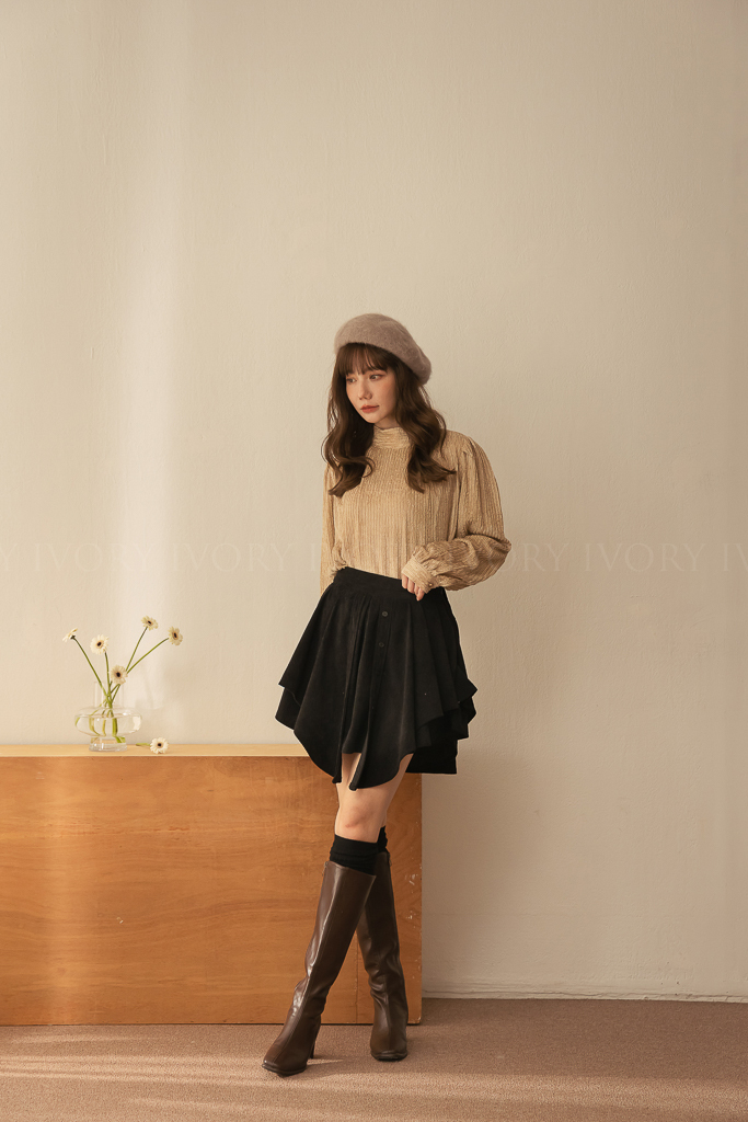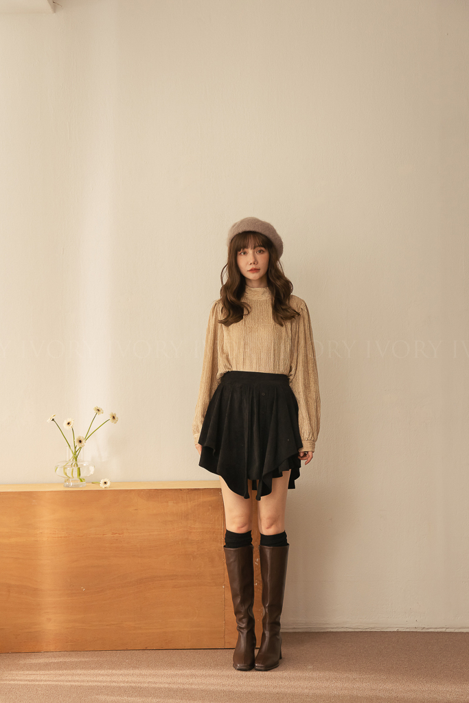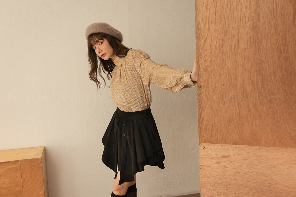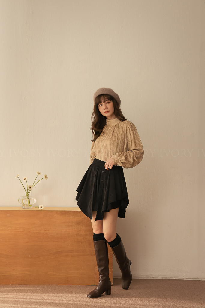 J51015氣質毛毛感直壓紋立領澎袖上衣