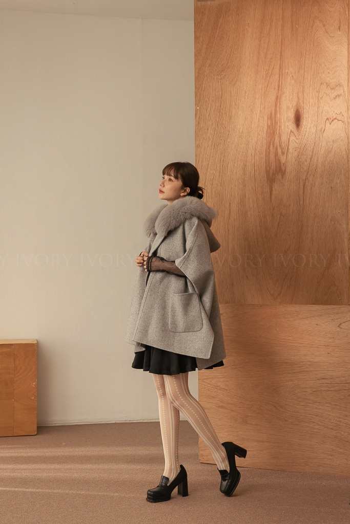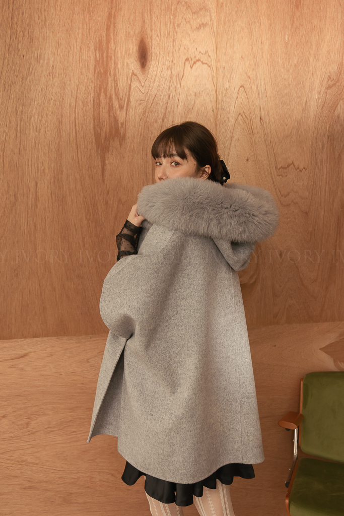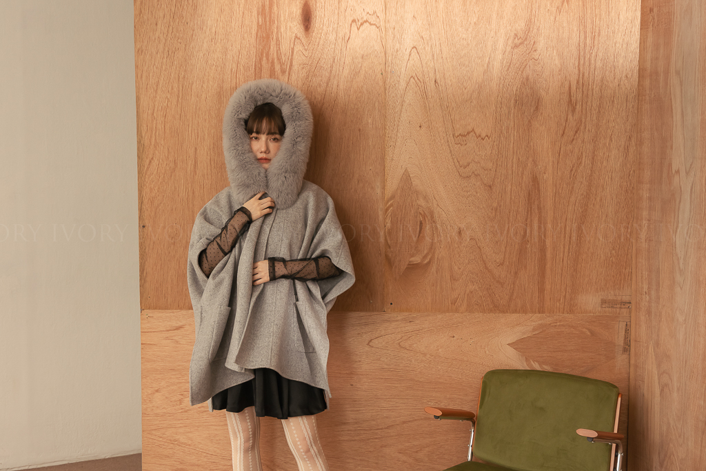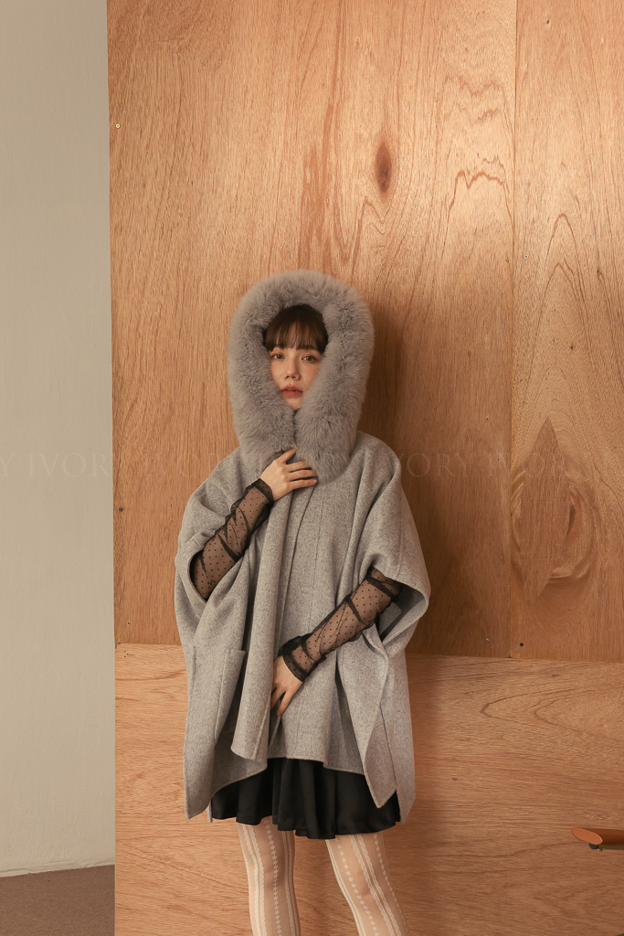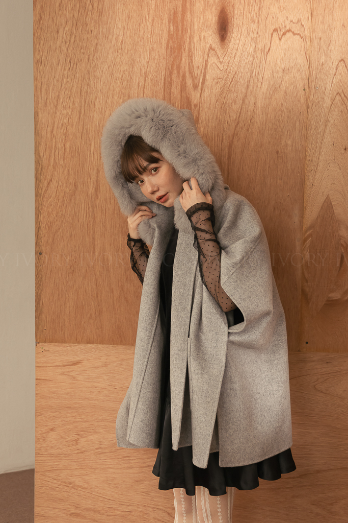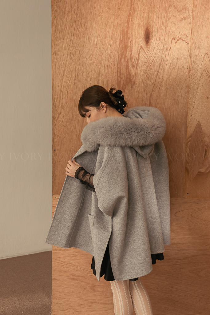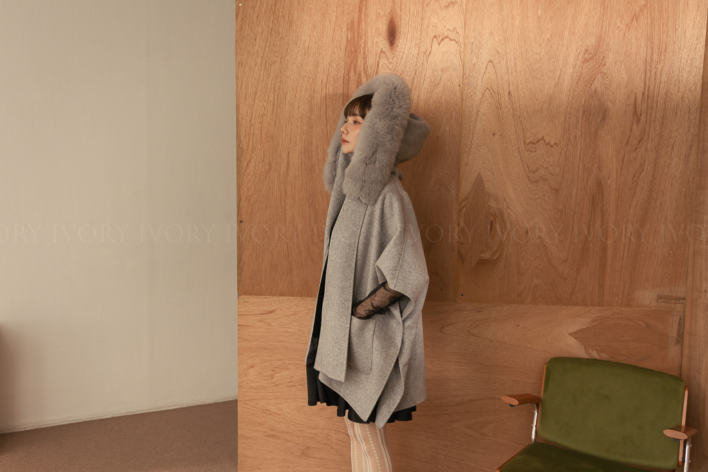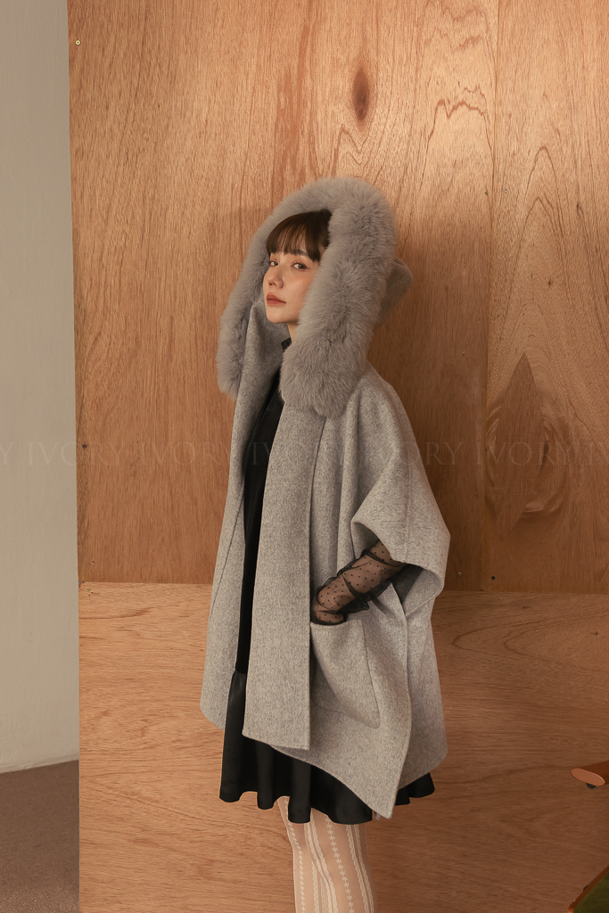 J51049超美高質感澎澎毛連帽羊毛斗篷大衣