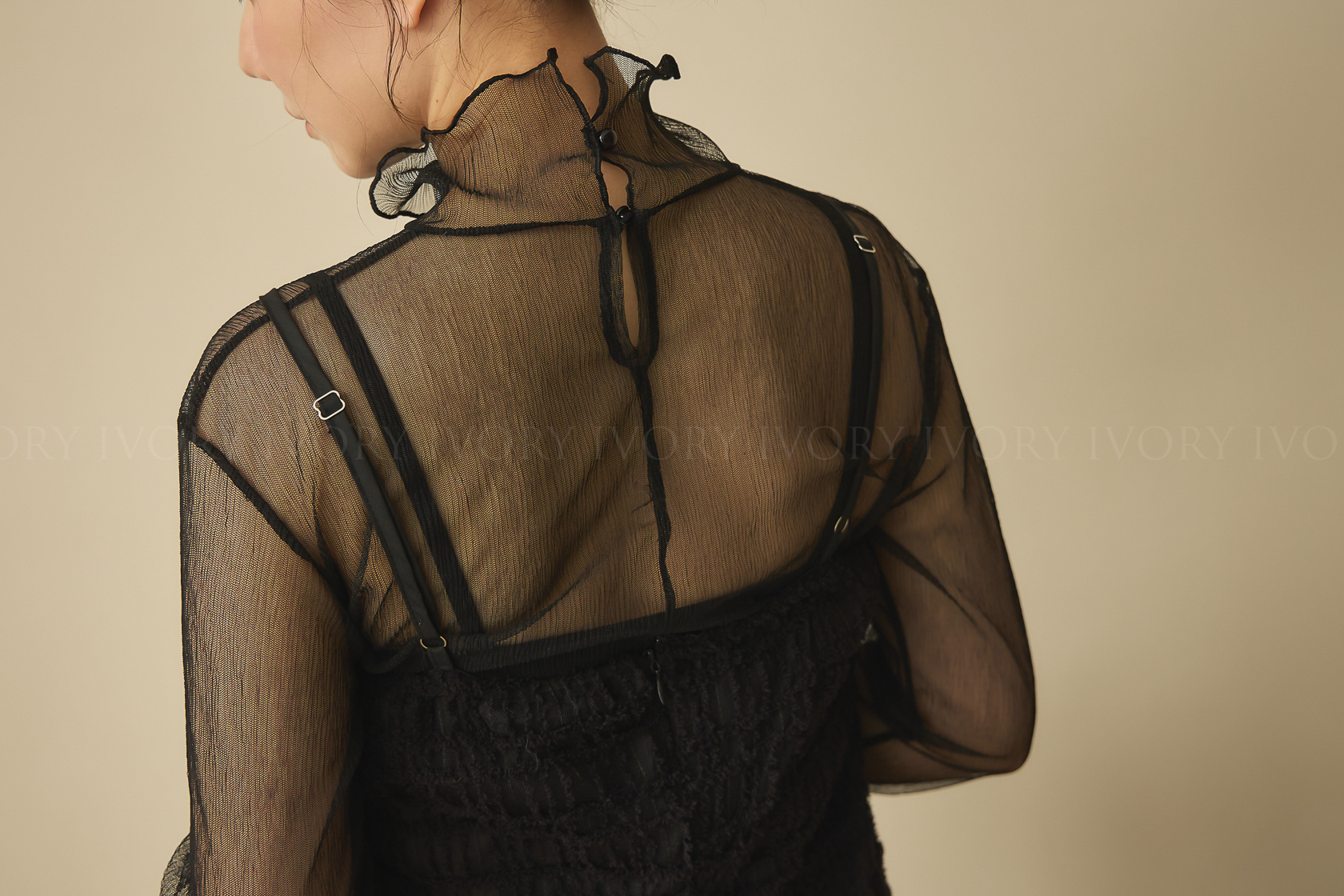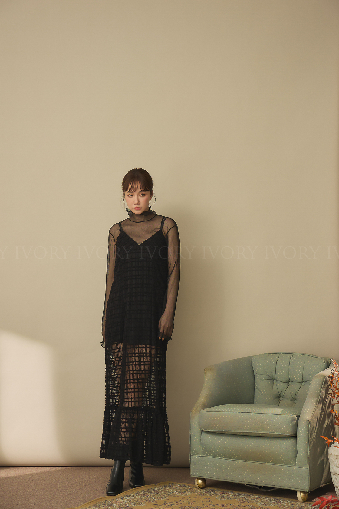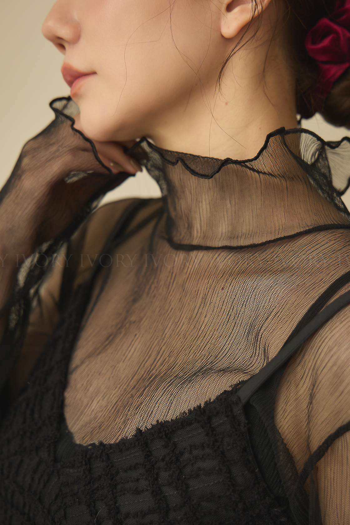 J60117小滾邊坑條透紗布立領上衣