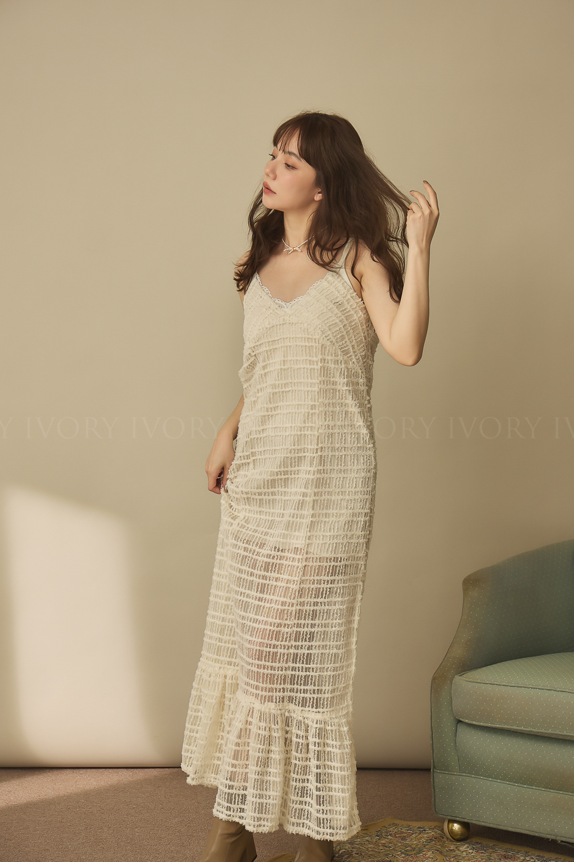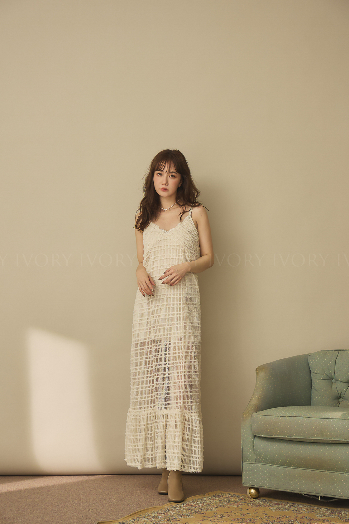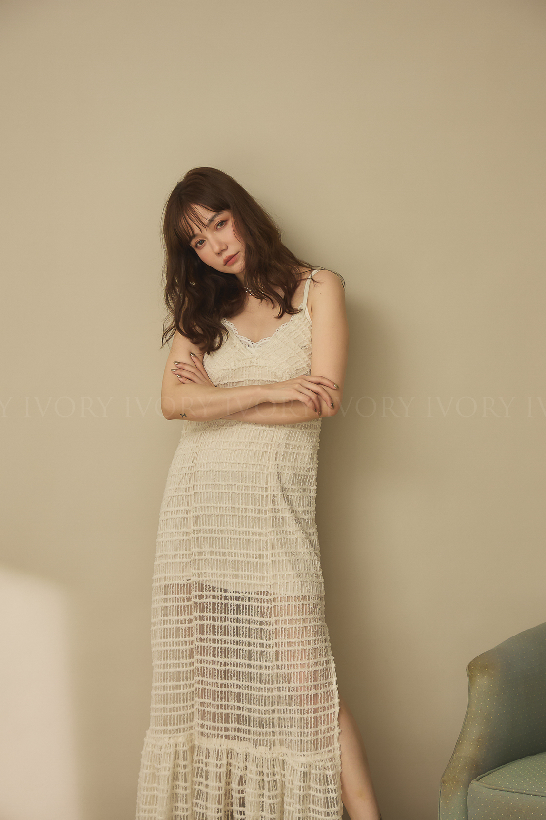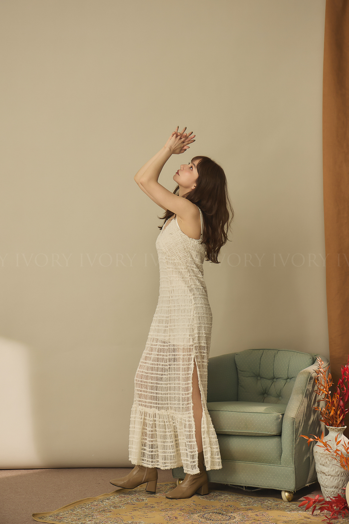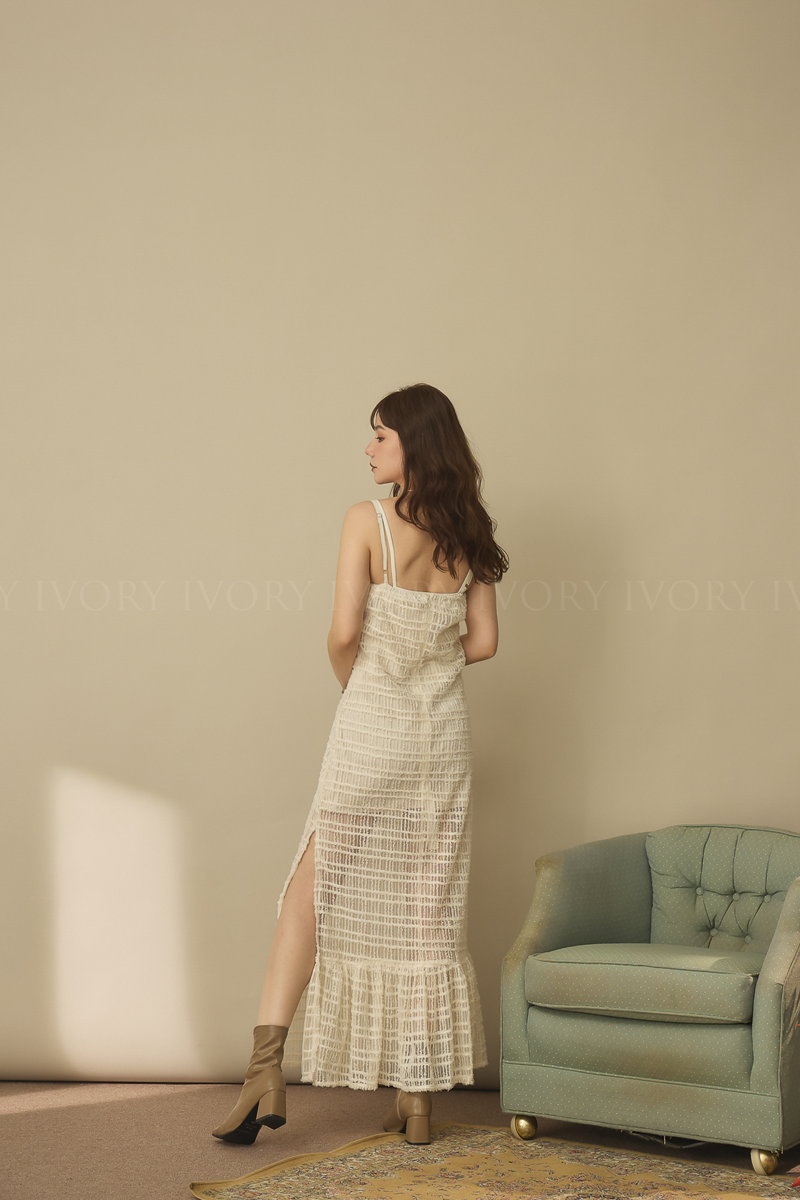 J60134鬆餅小方格透紗側開衩細肩長洋