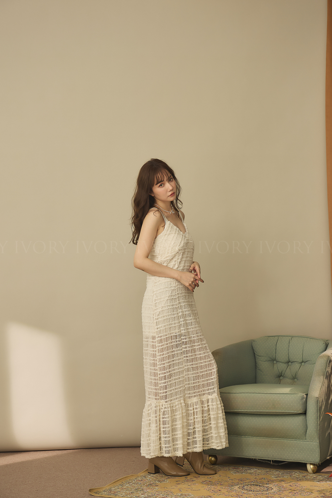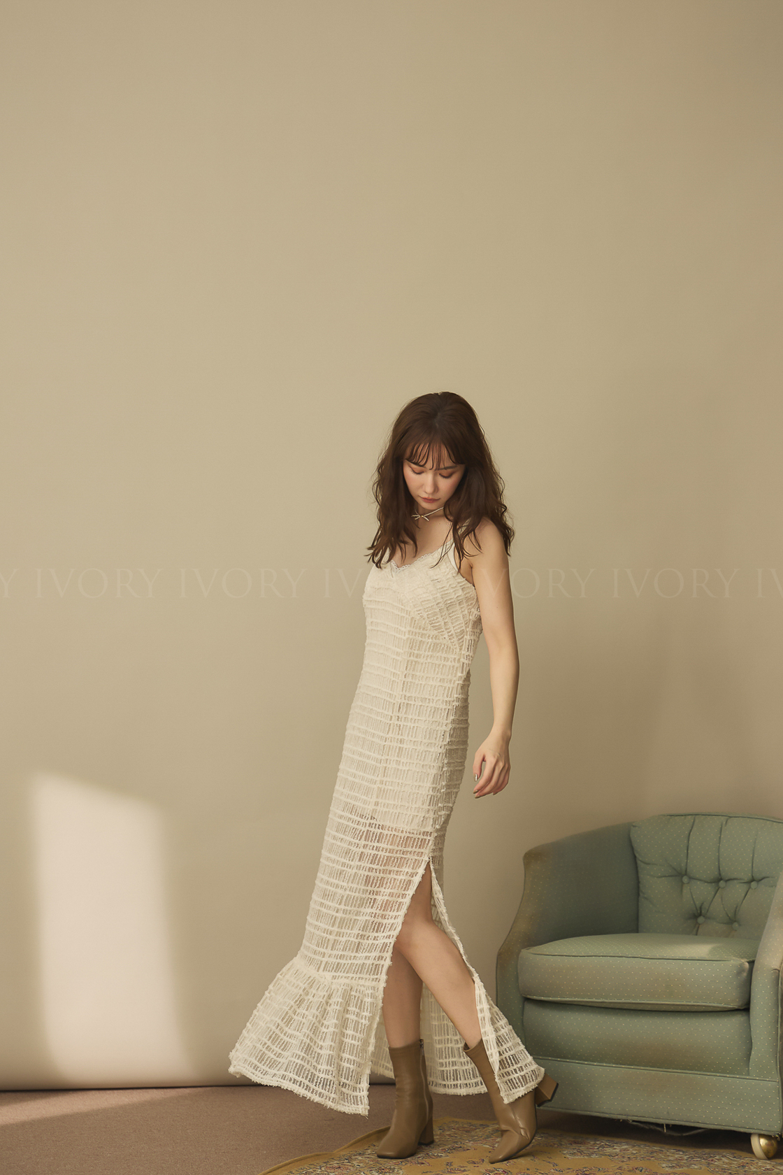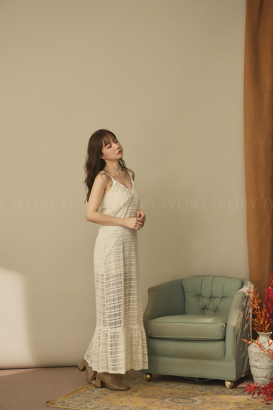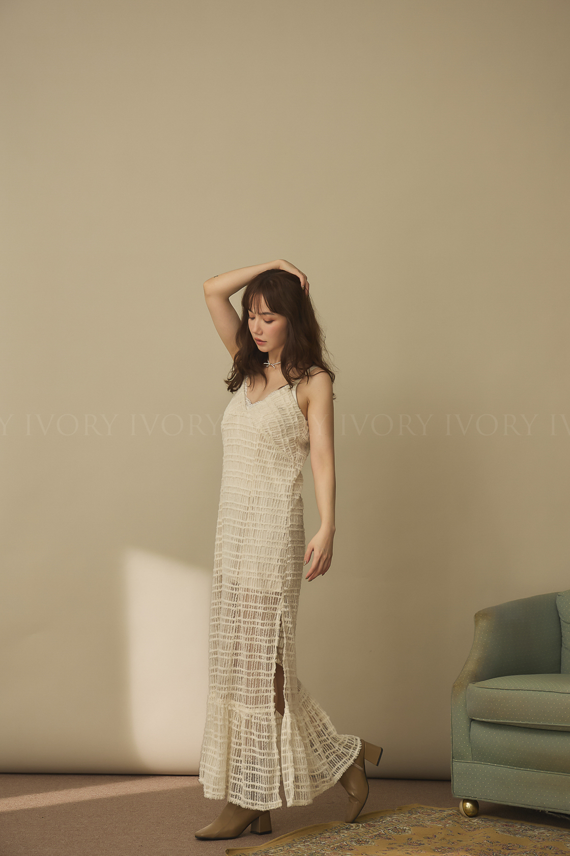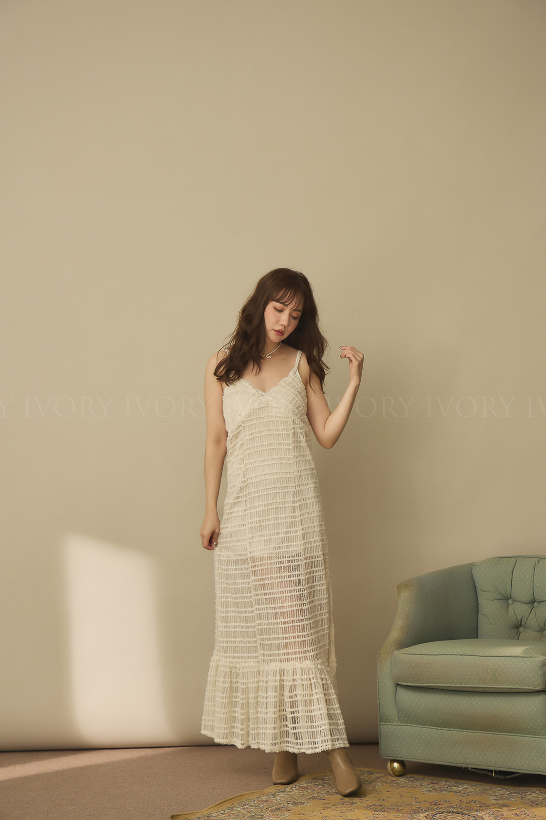 J60134鬆餅小方格透紗側開衩細肩長洋
