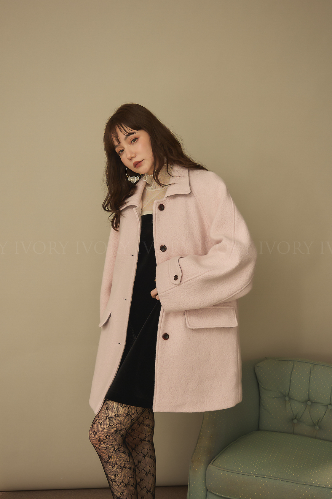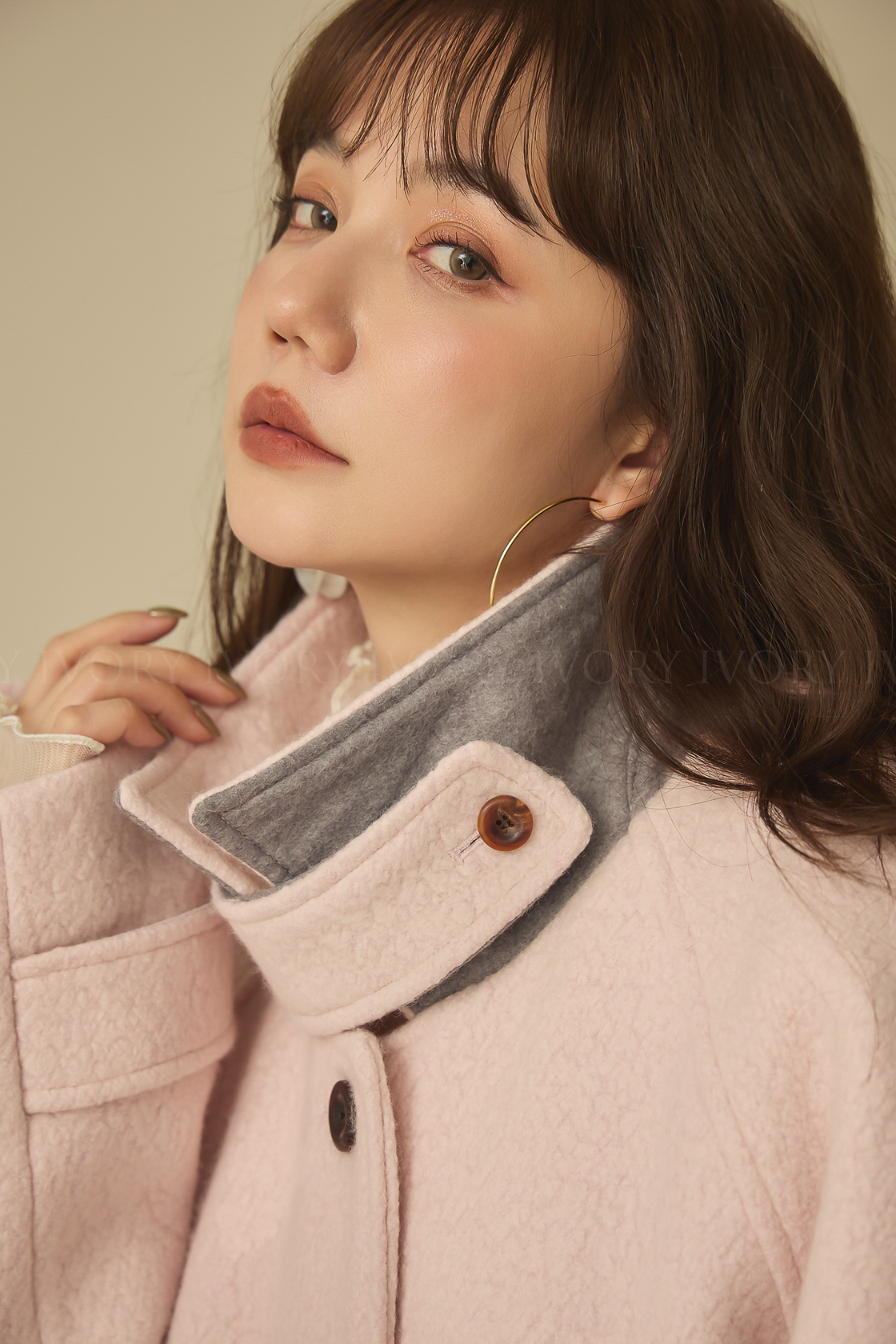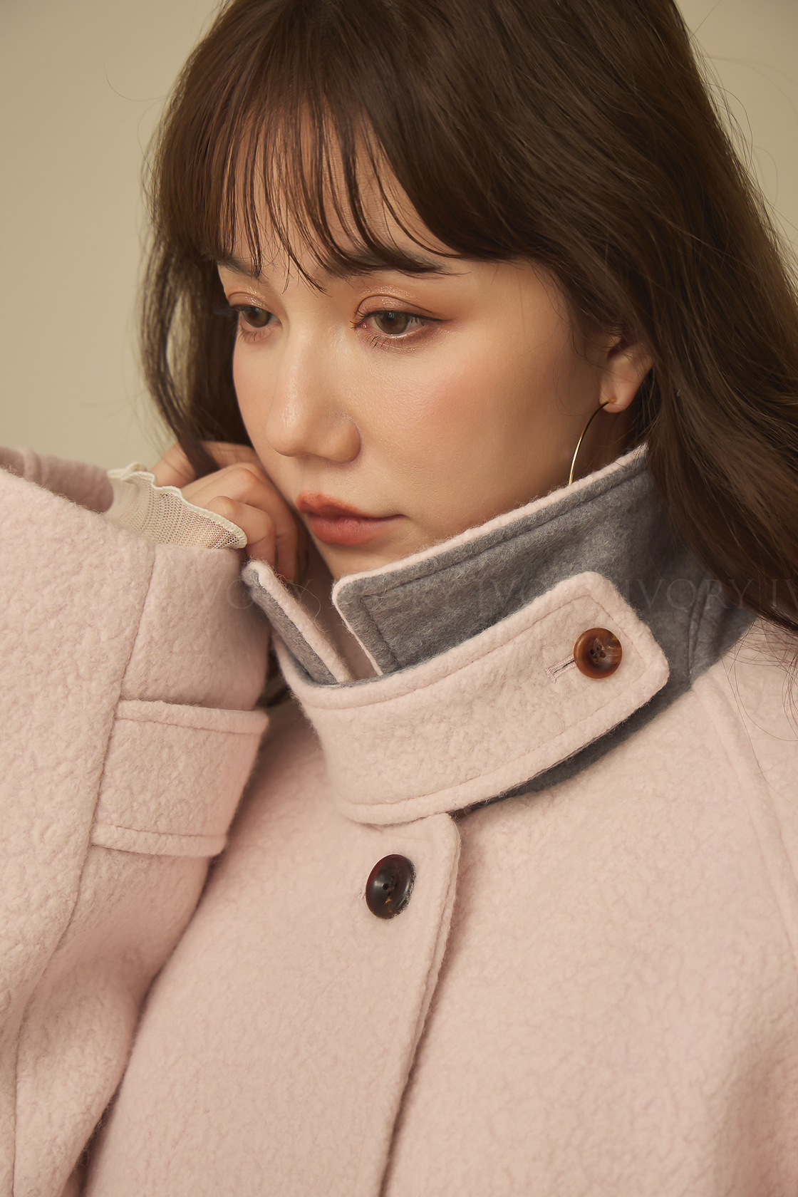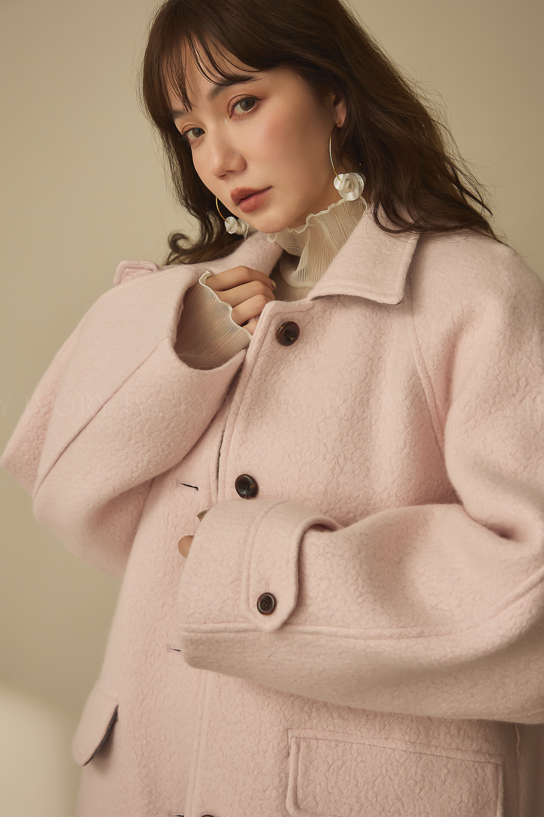 J60158草莓奶昔領邊撞色顆粒羊毛大衣