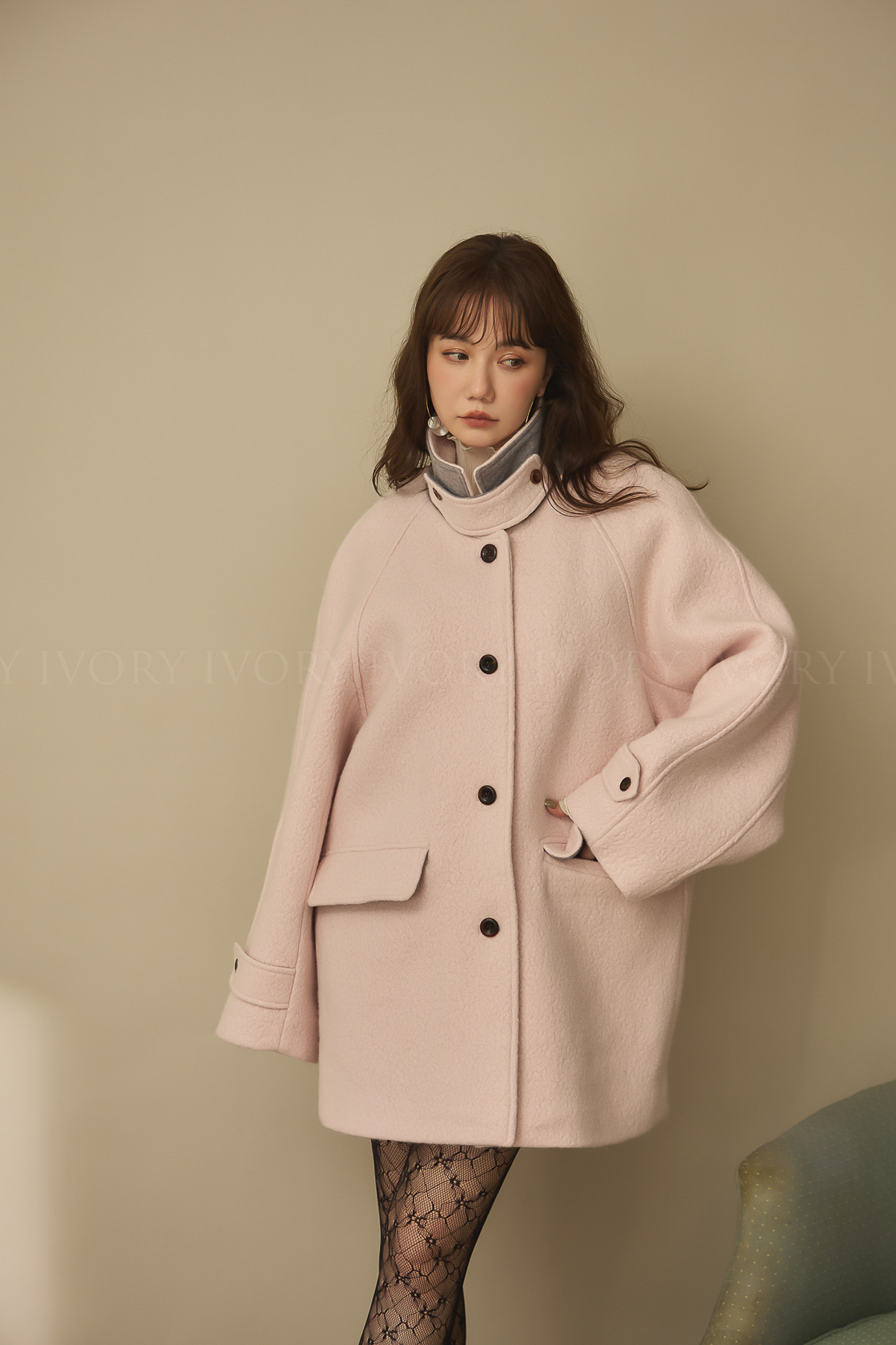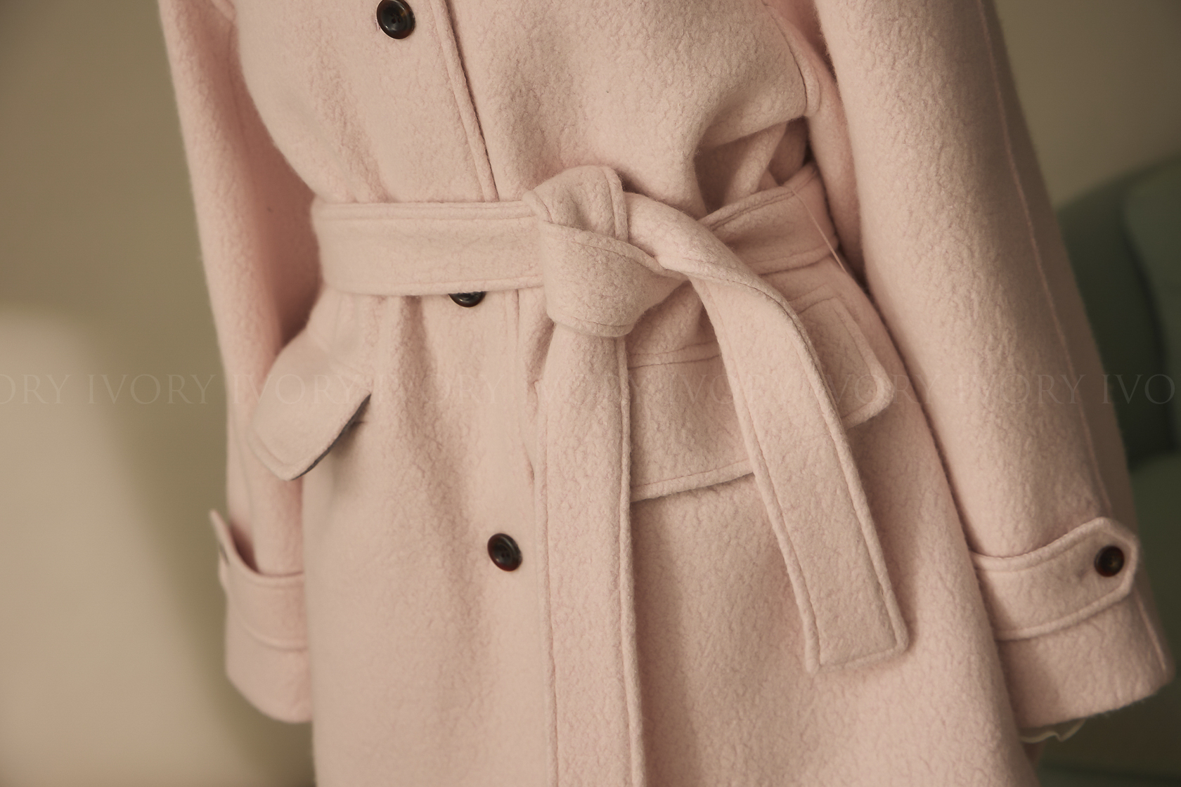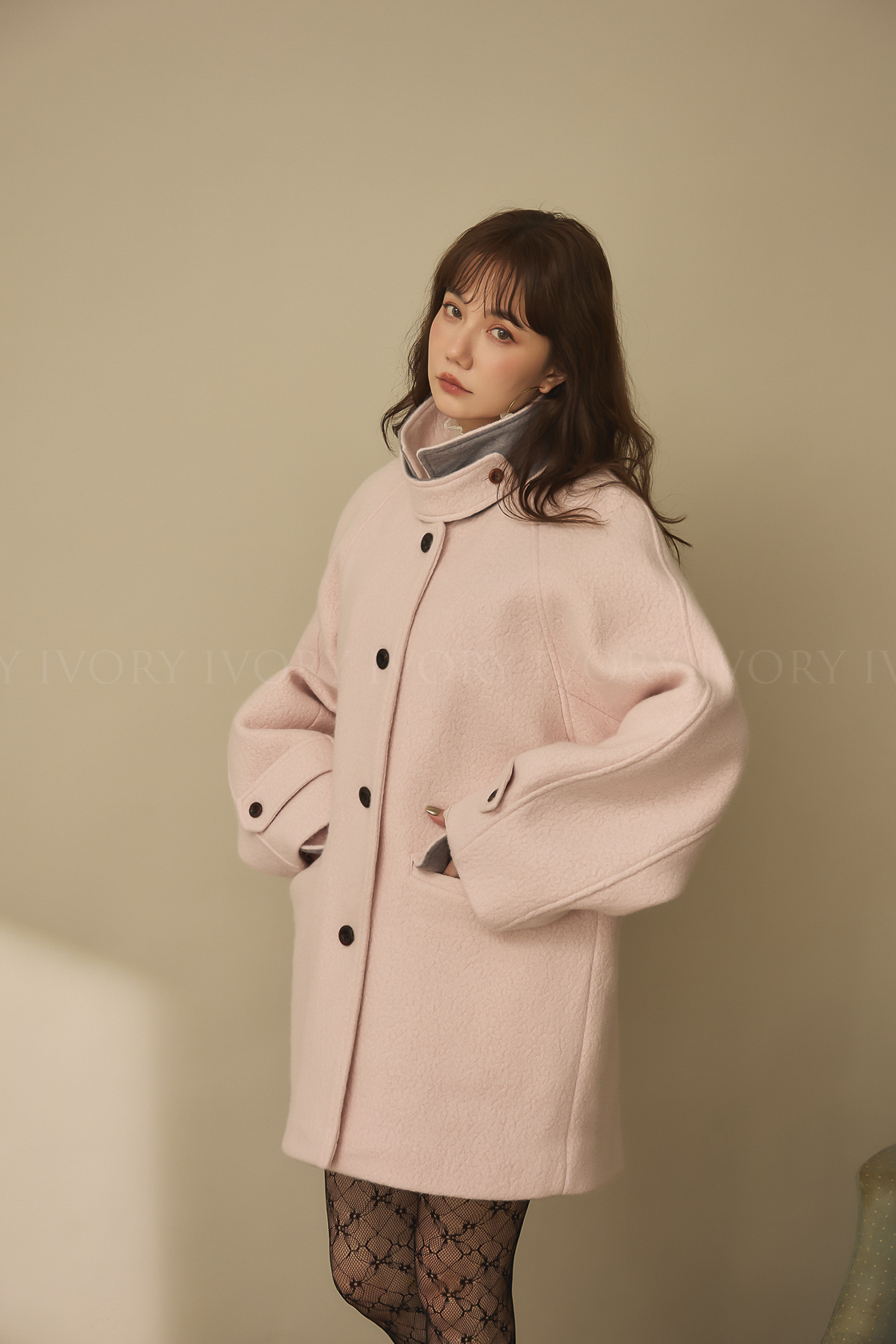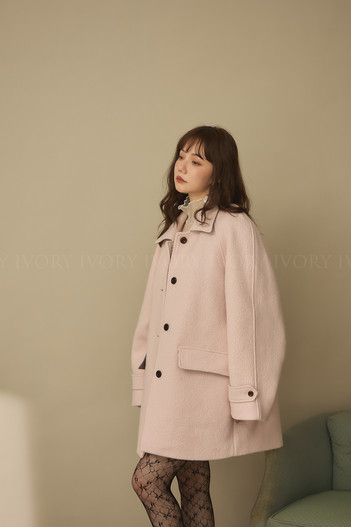 J60158草莓奶昔領邊撞色顆粒羊毛大衣