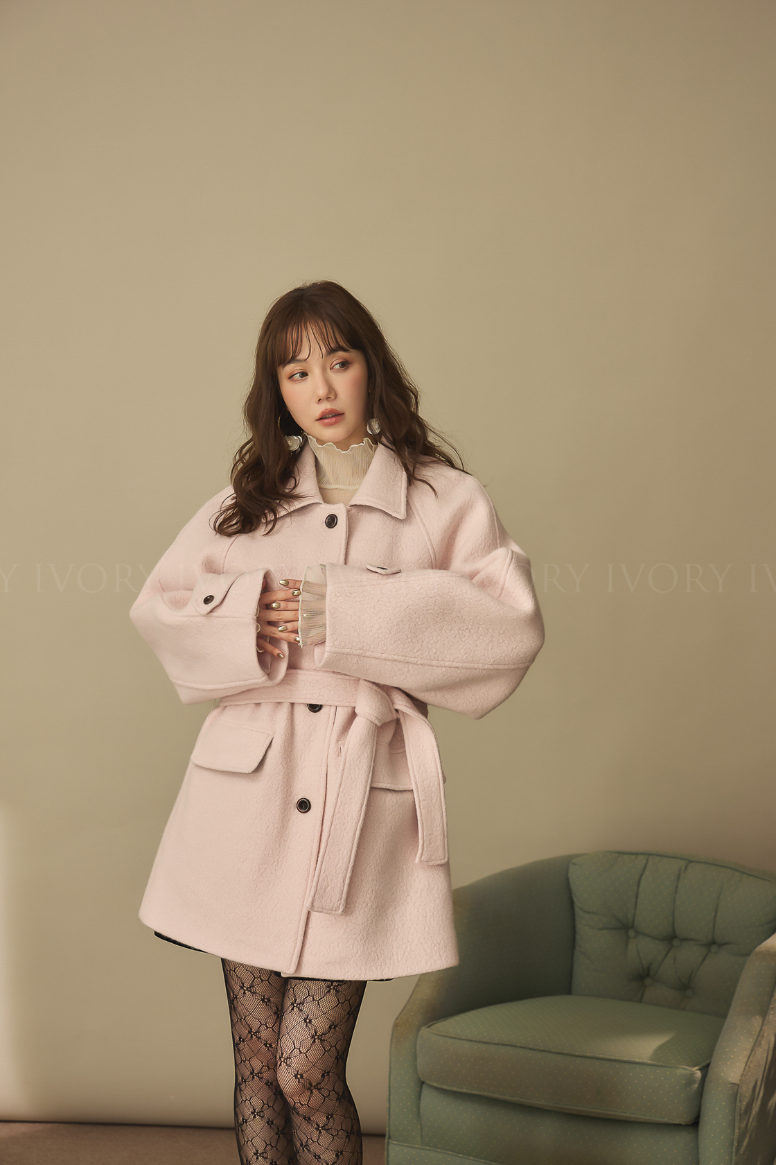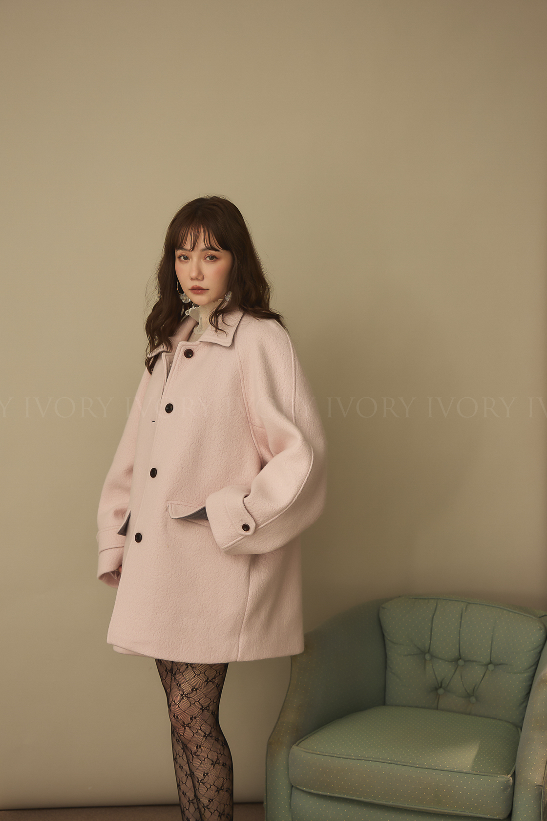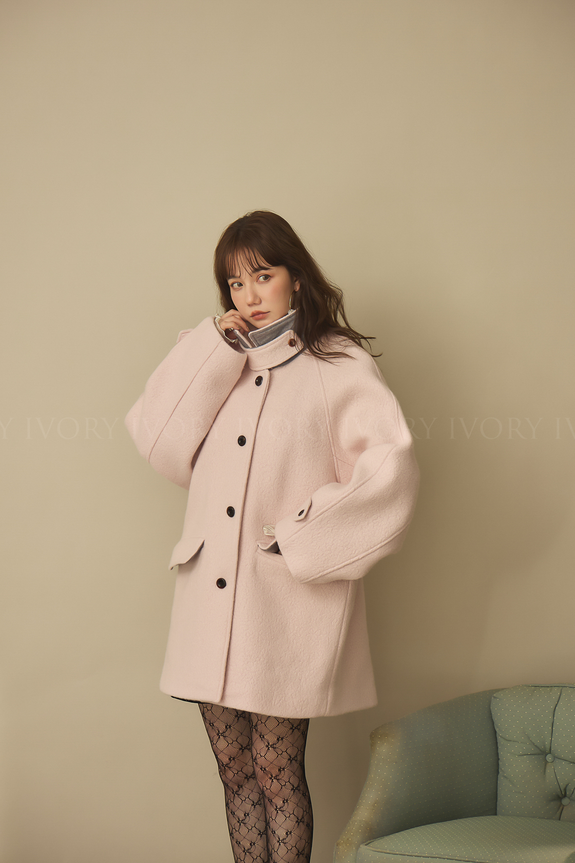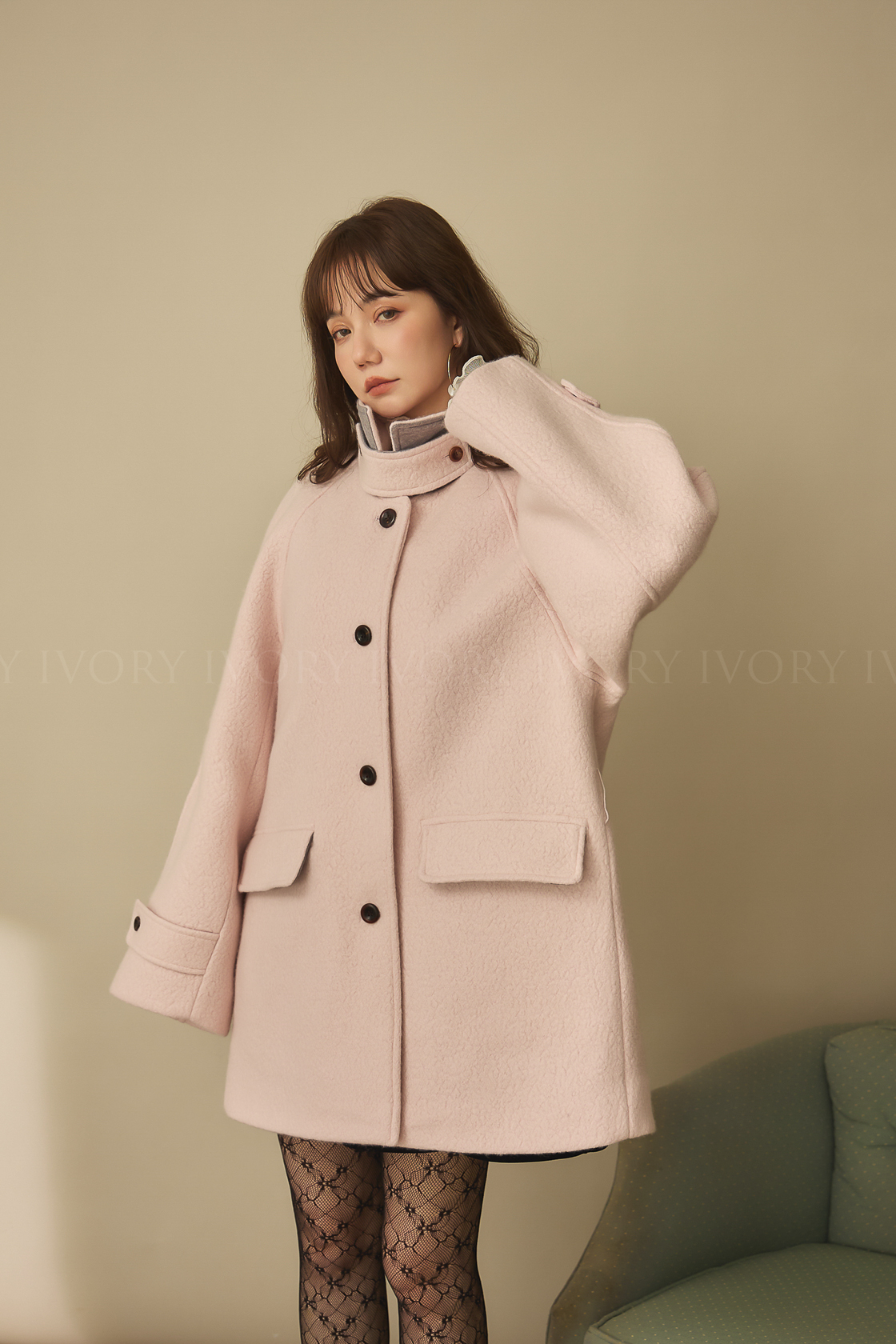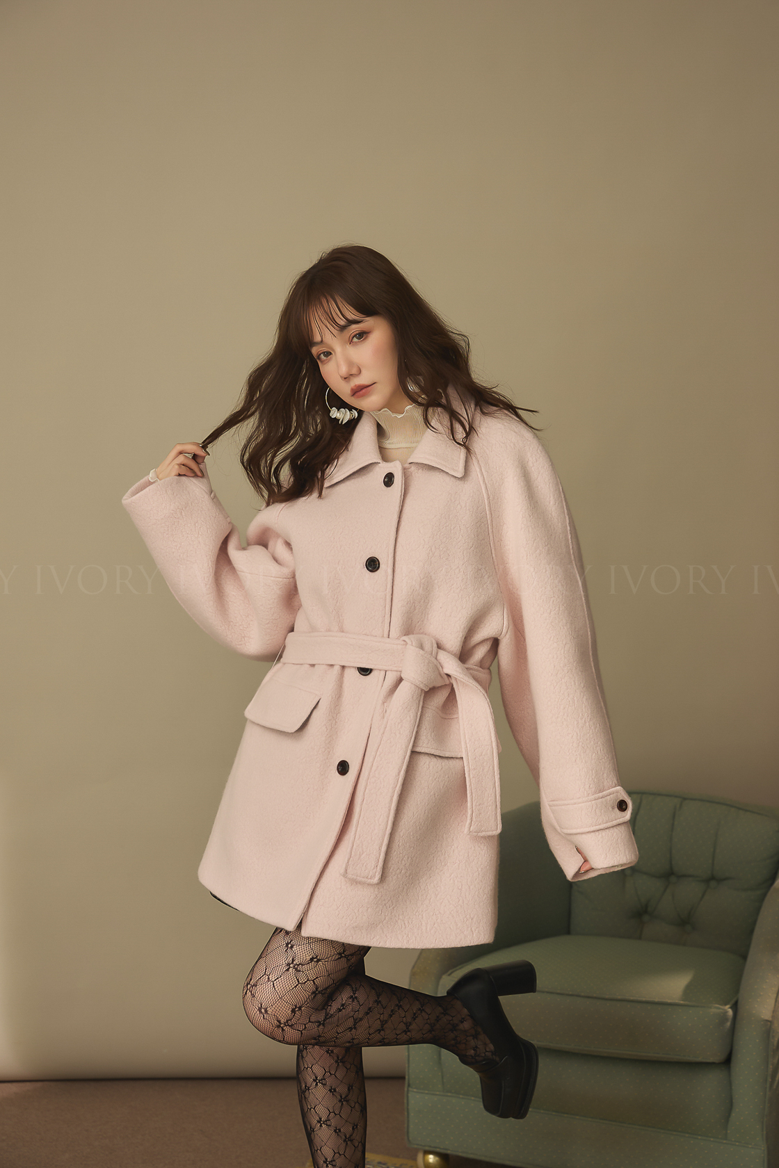J60158草莓奶昔領邊撞色顆粒羊毛大衣