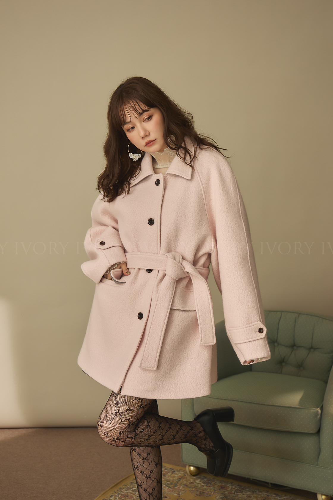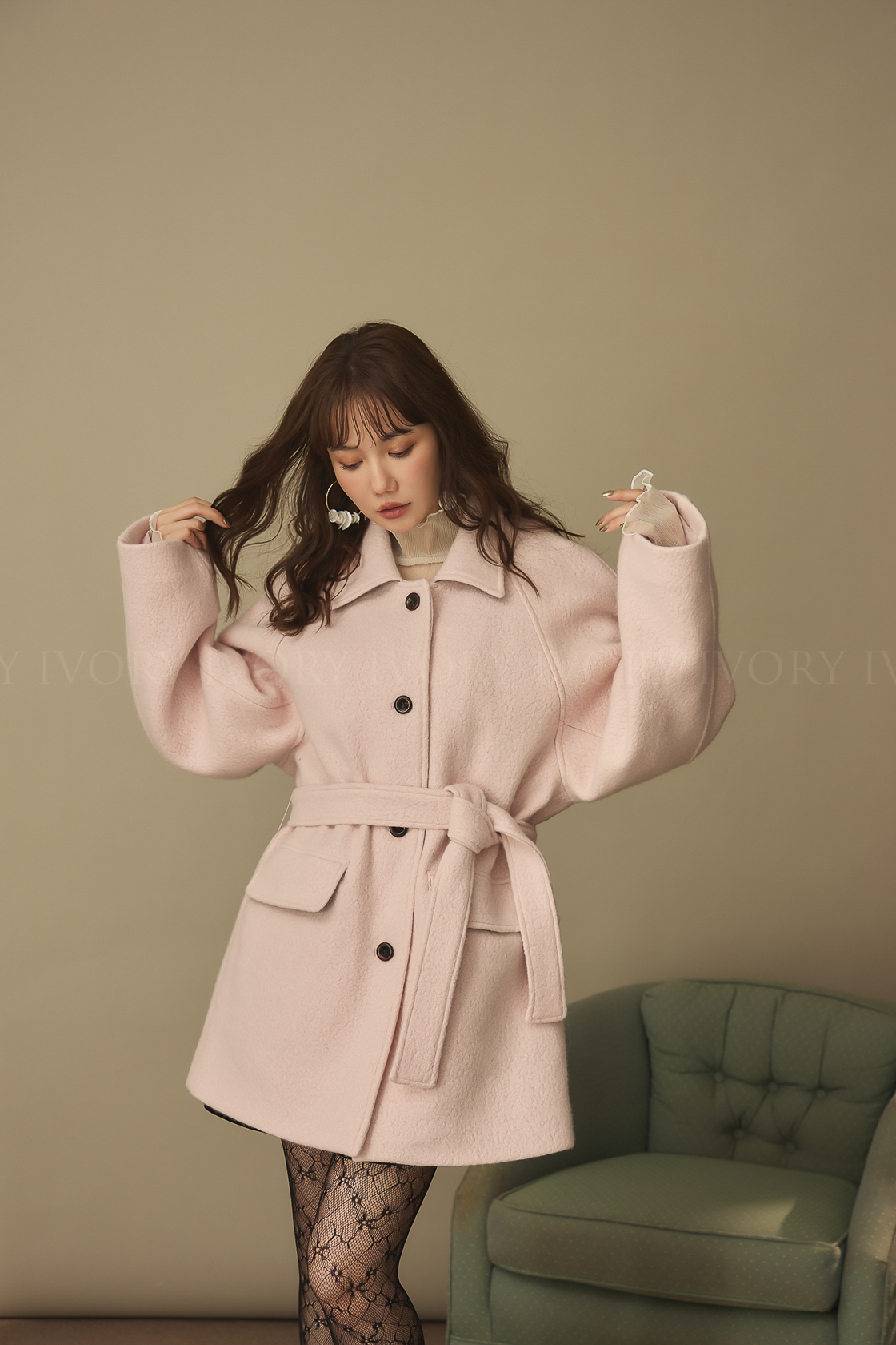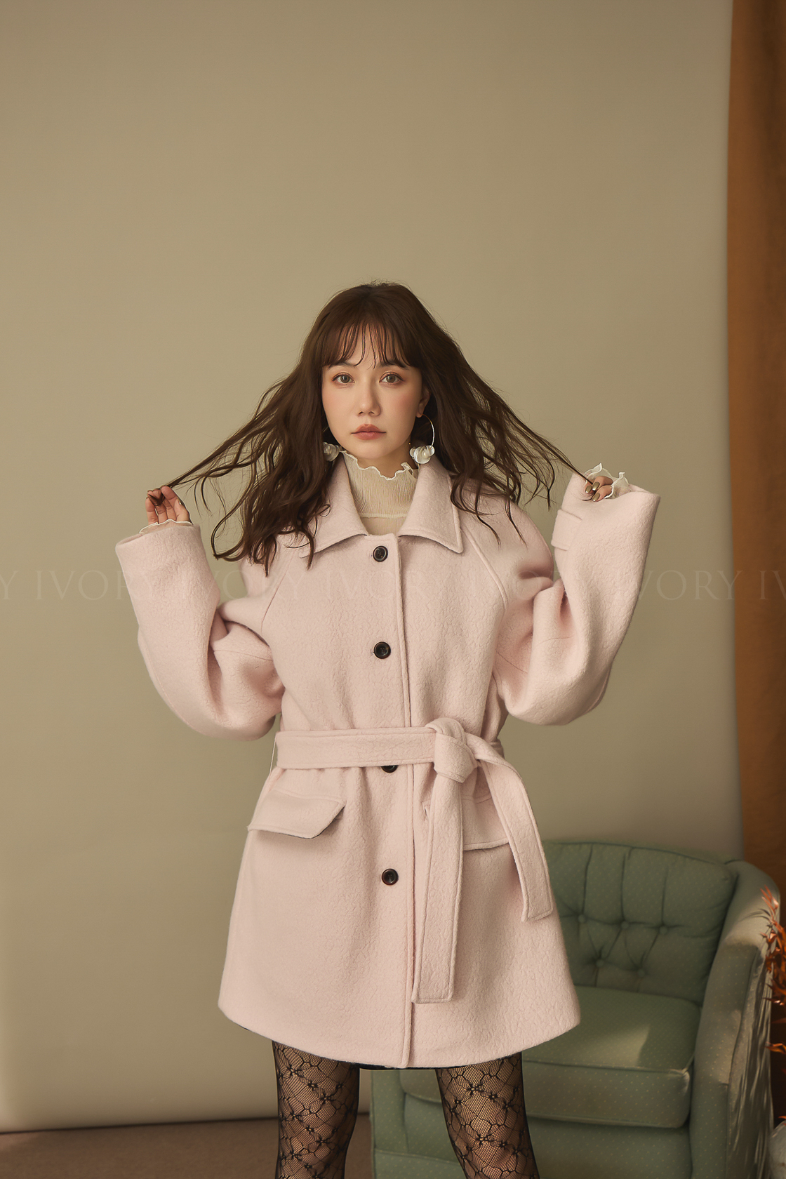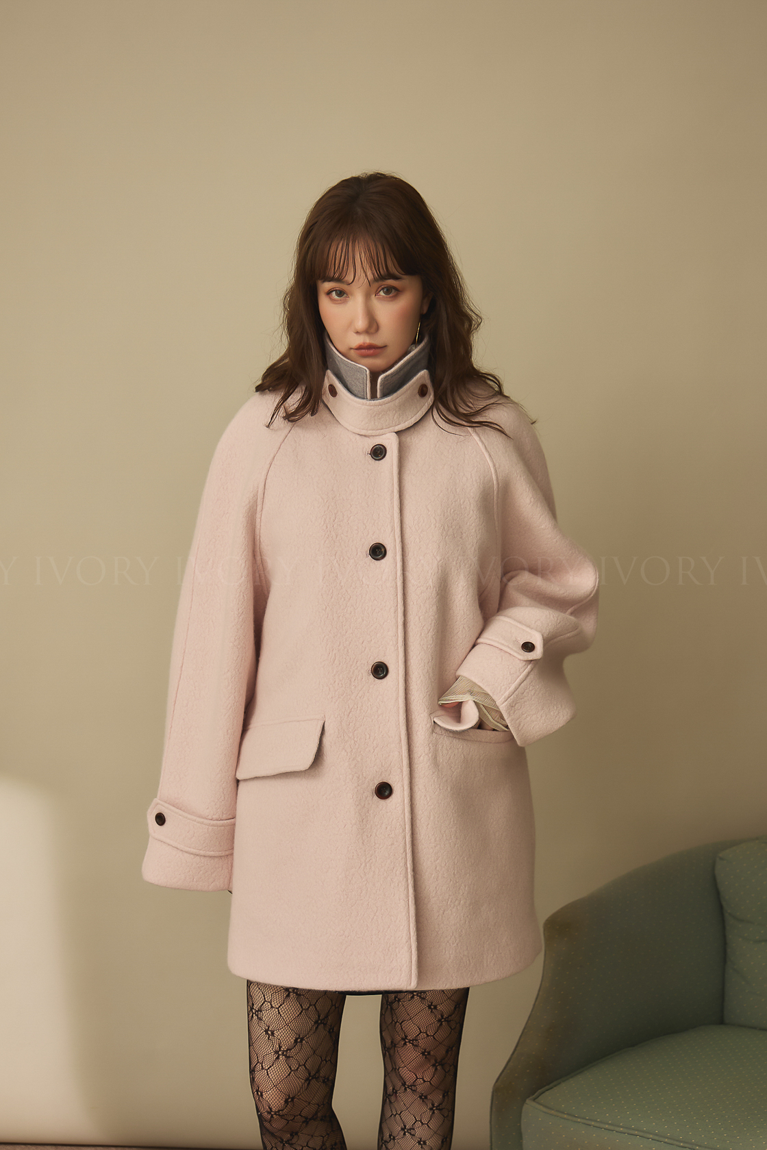 J60158草莓奶昔領邊撞色顆粒羊毛大衣