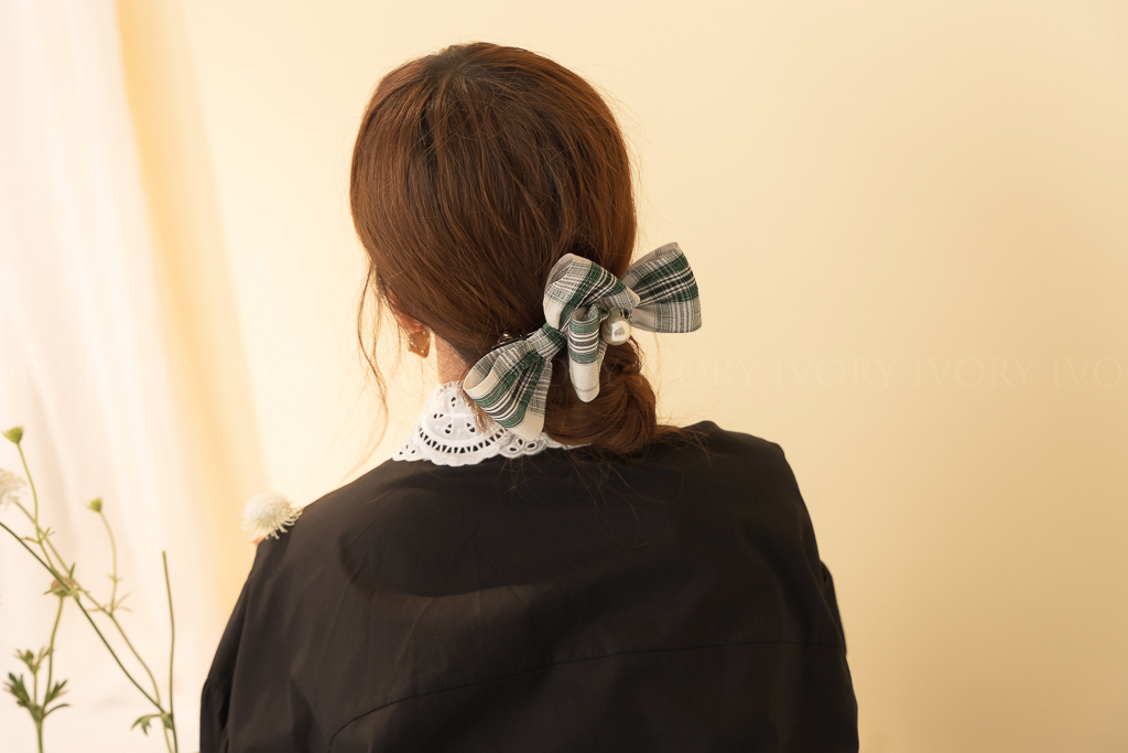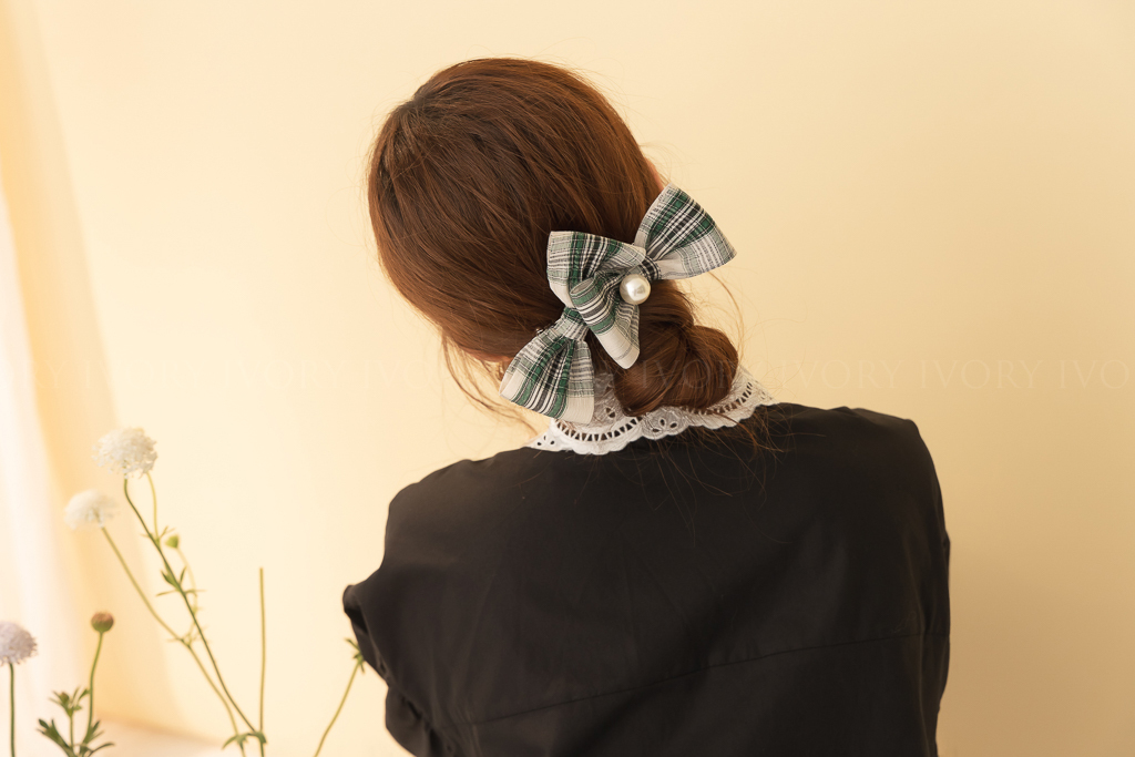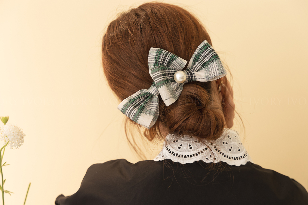 M53052復古格紋大珍珠雙蝴蝶結髮夾