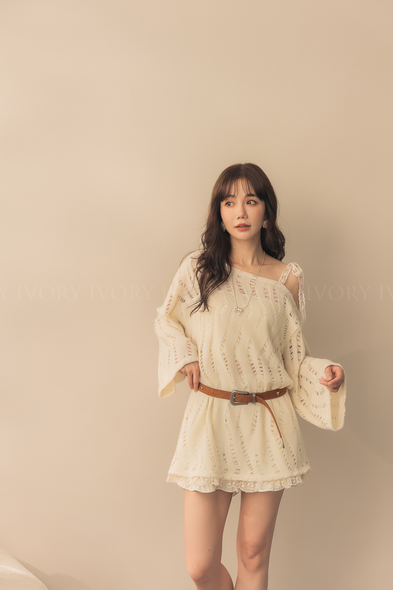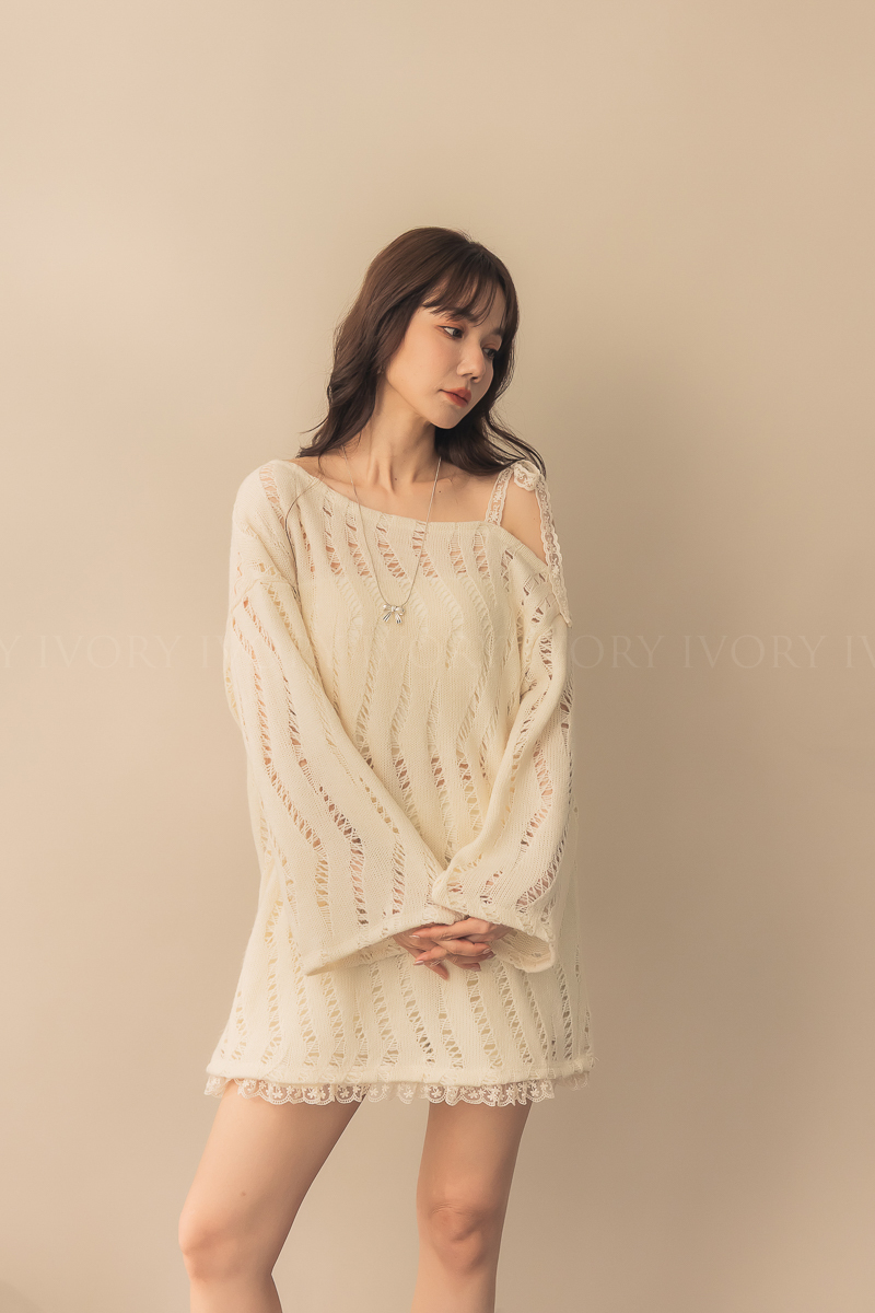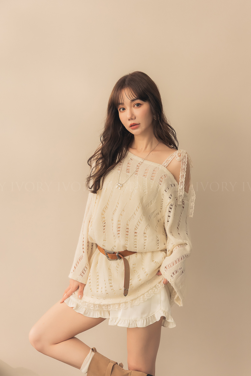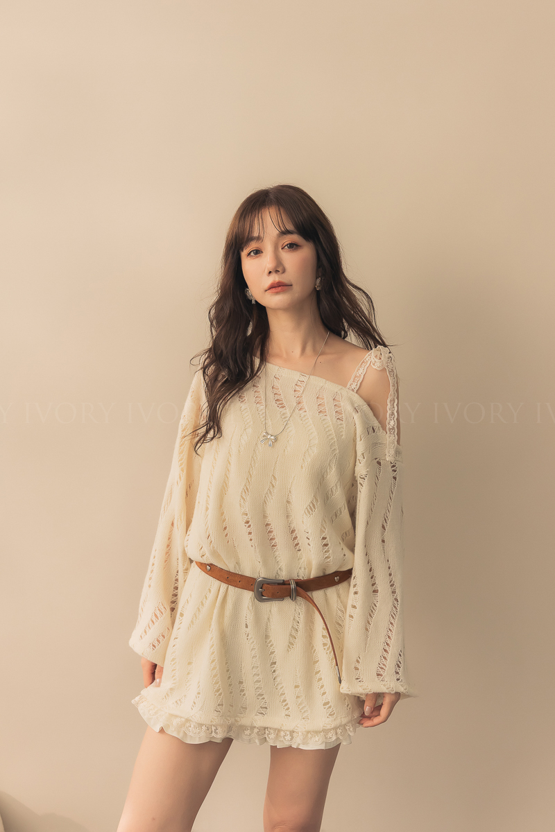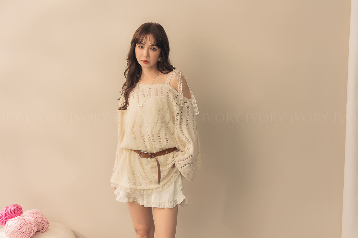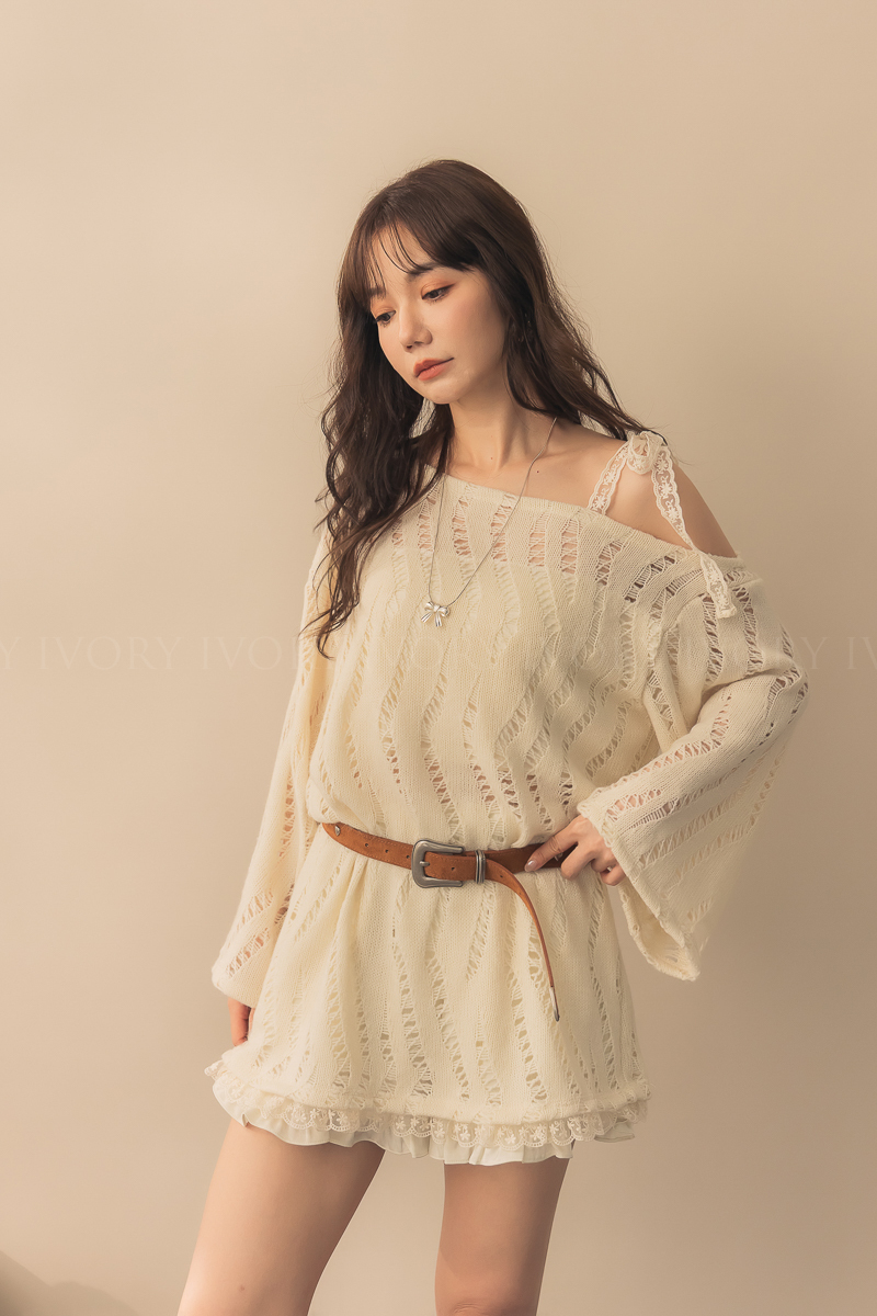 N51020縷空波浪蕾絲斜肩長版上衣< 小貓清單>