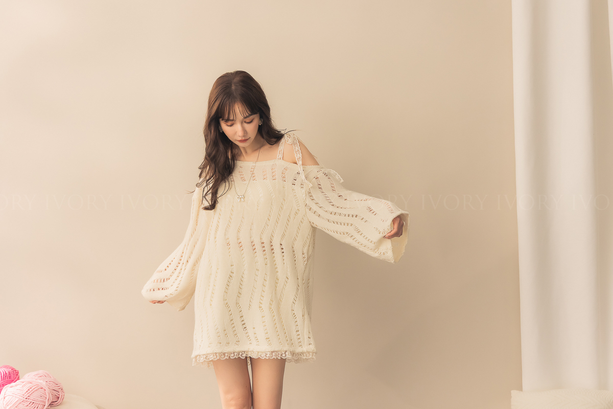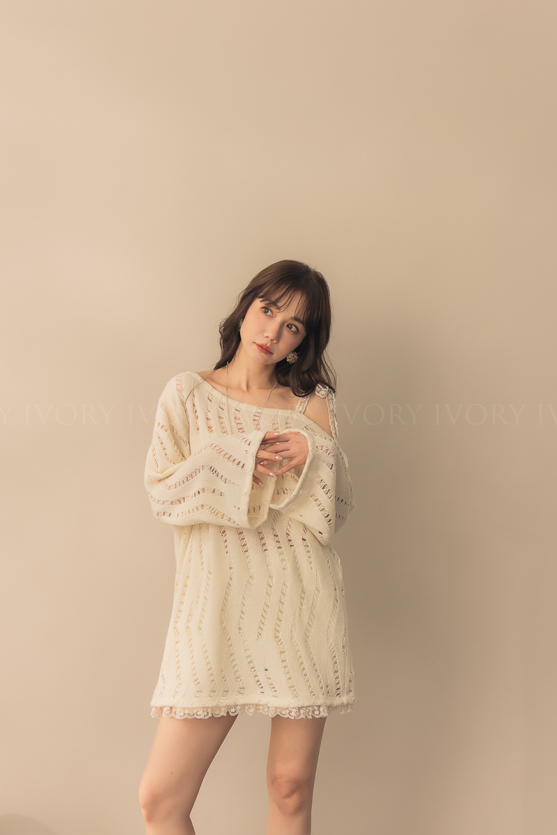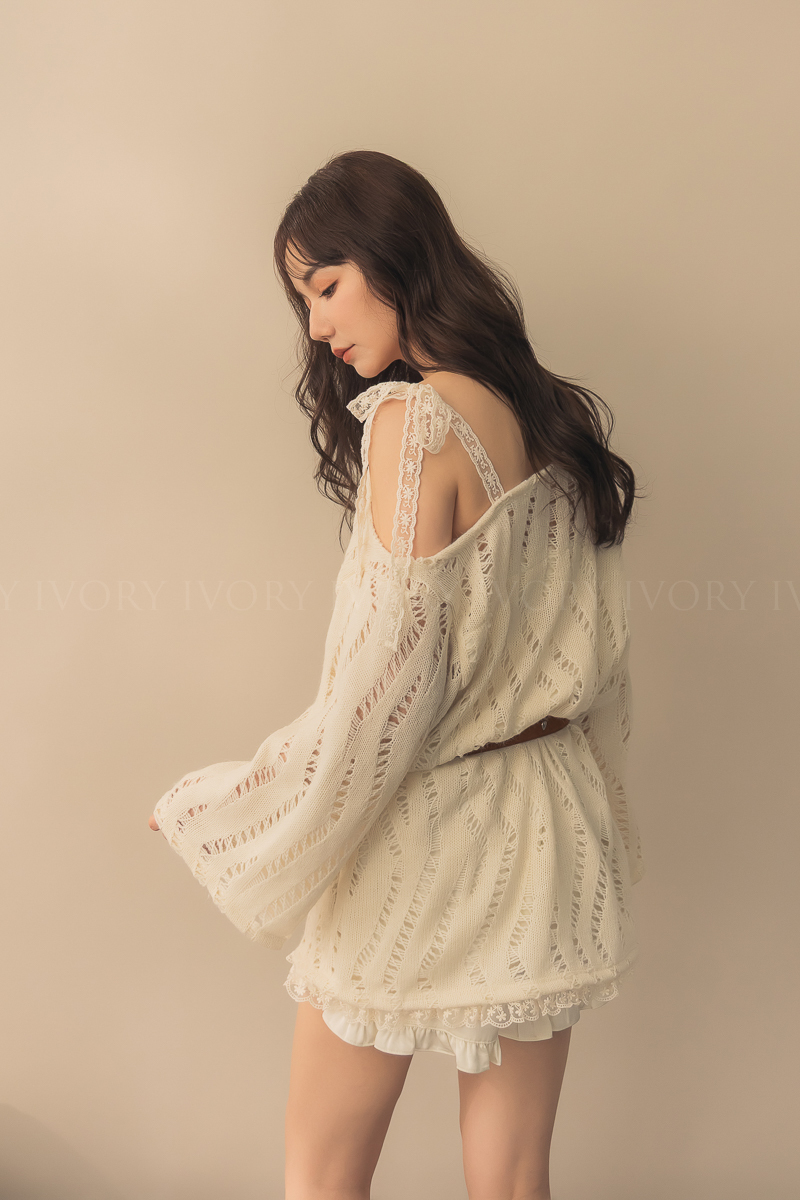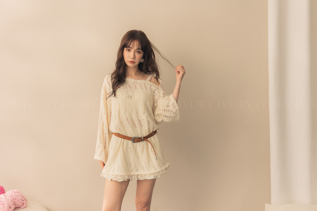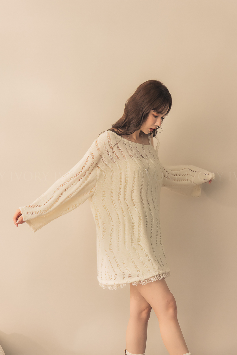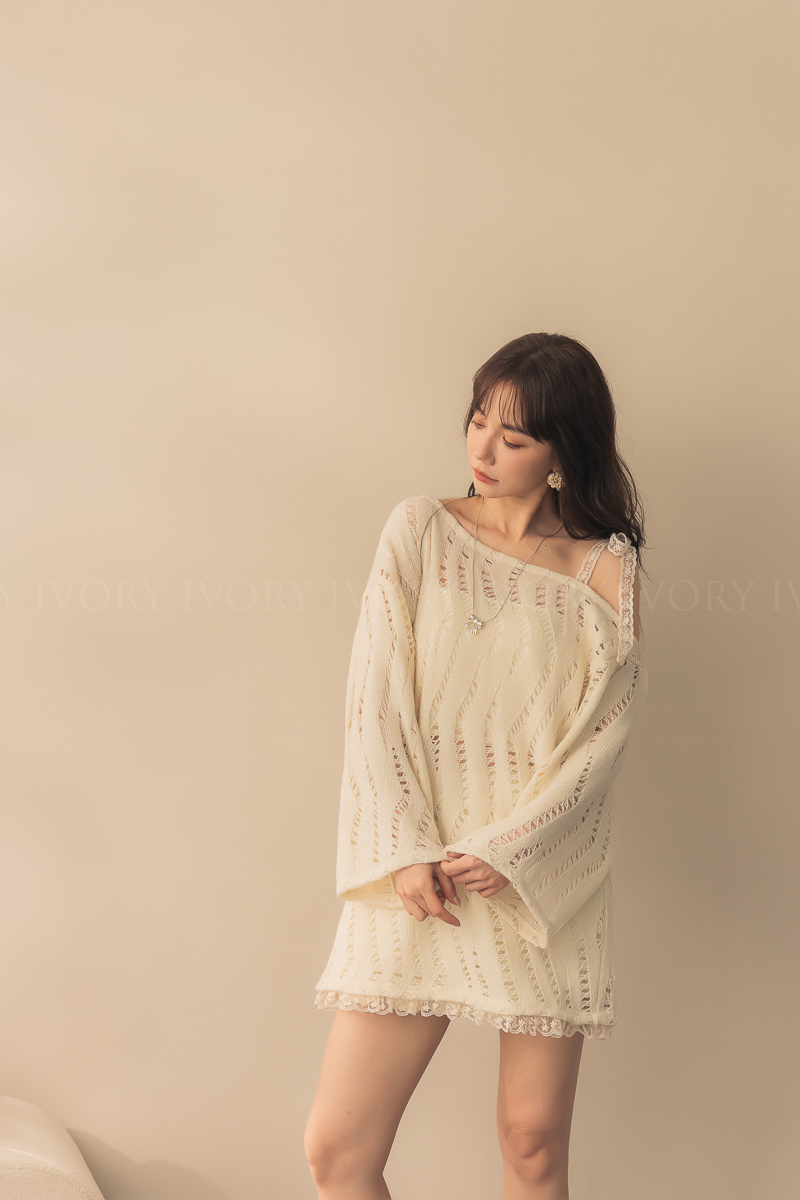 N51020縷空波浪蕾絲斜肩長版上衣< 小貓清單>