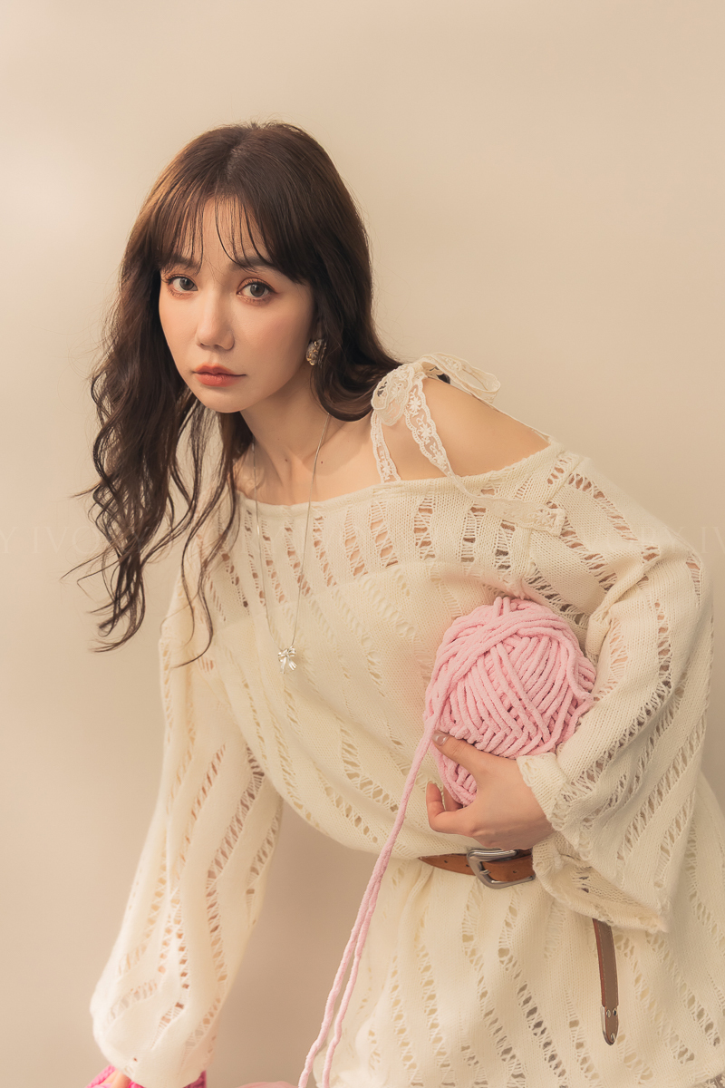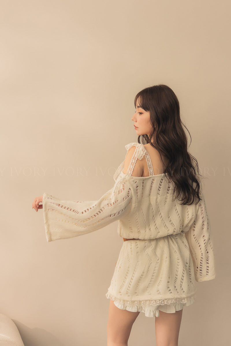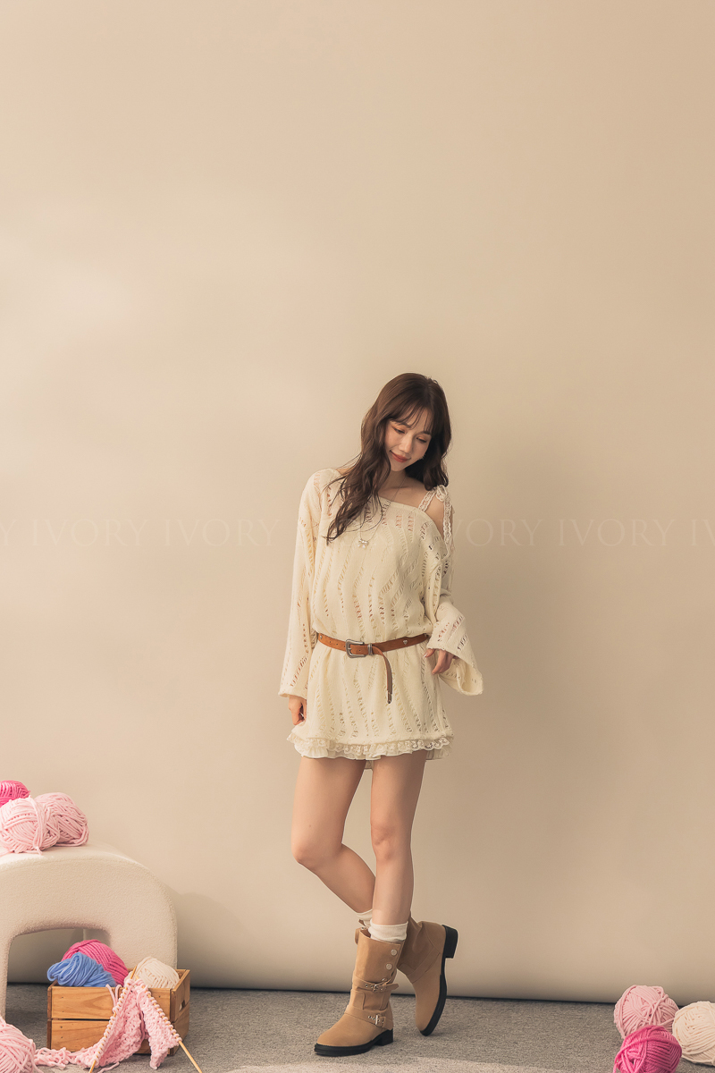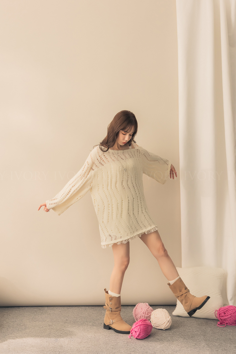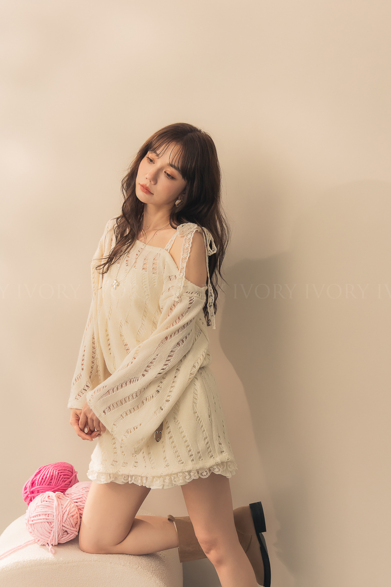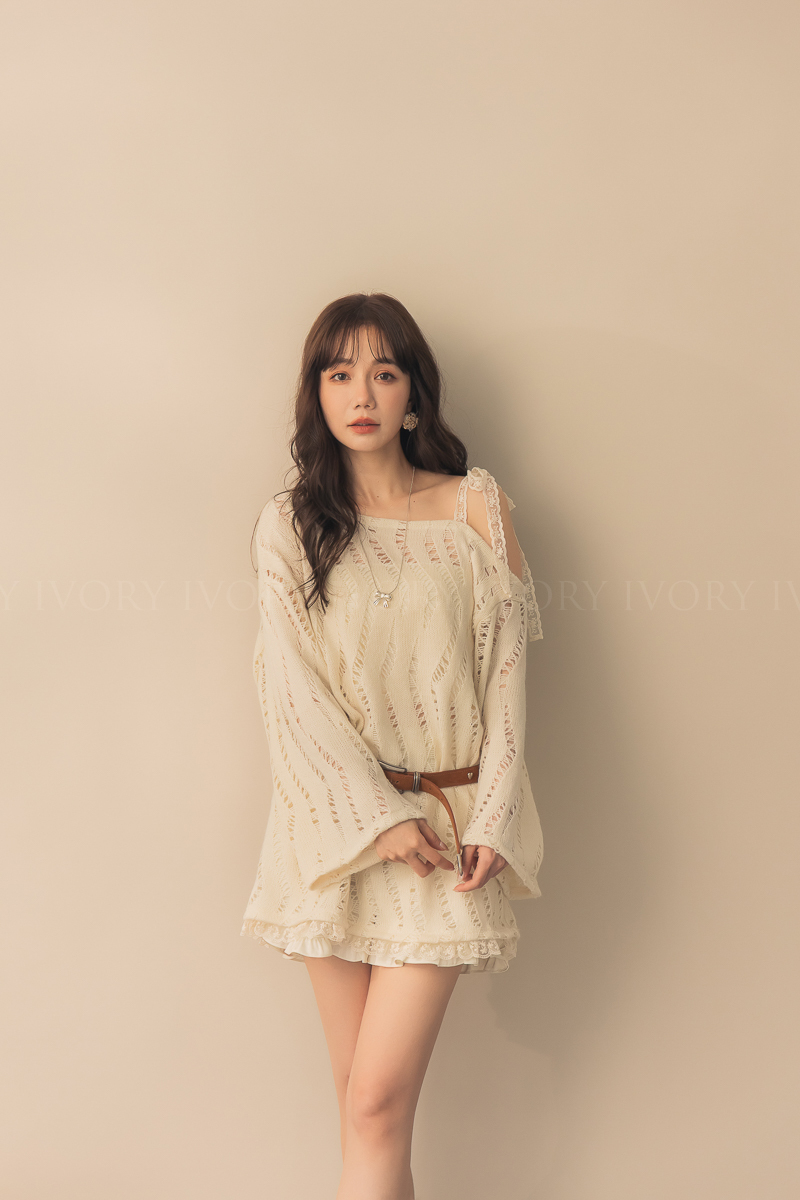 N51020縷空波浪蕾絲斜肩長版上衣< 小貓清單>