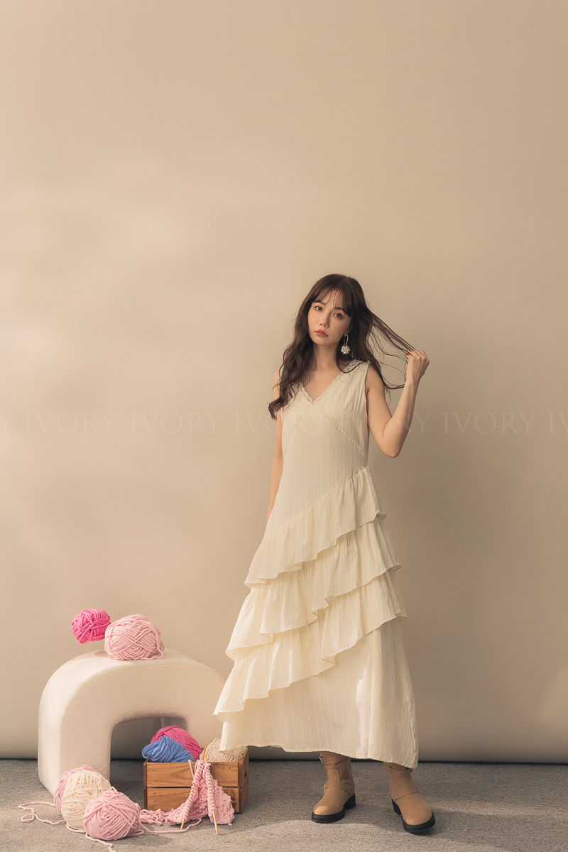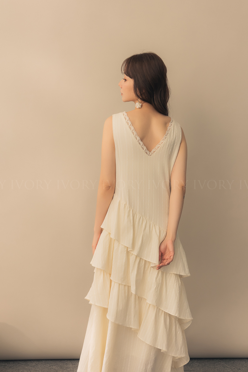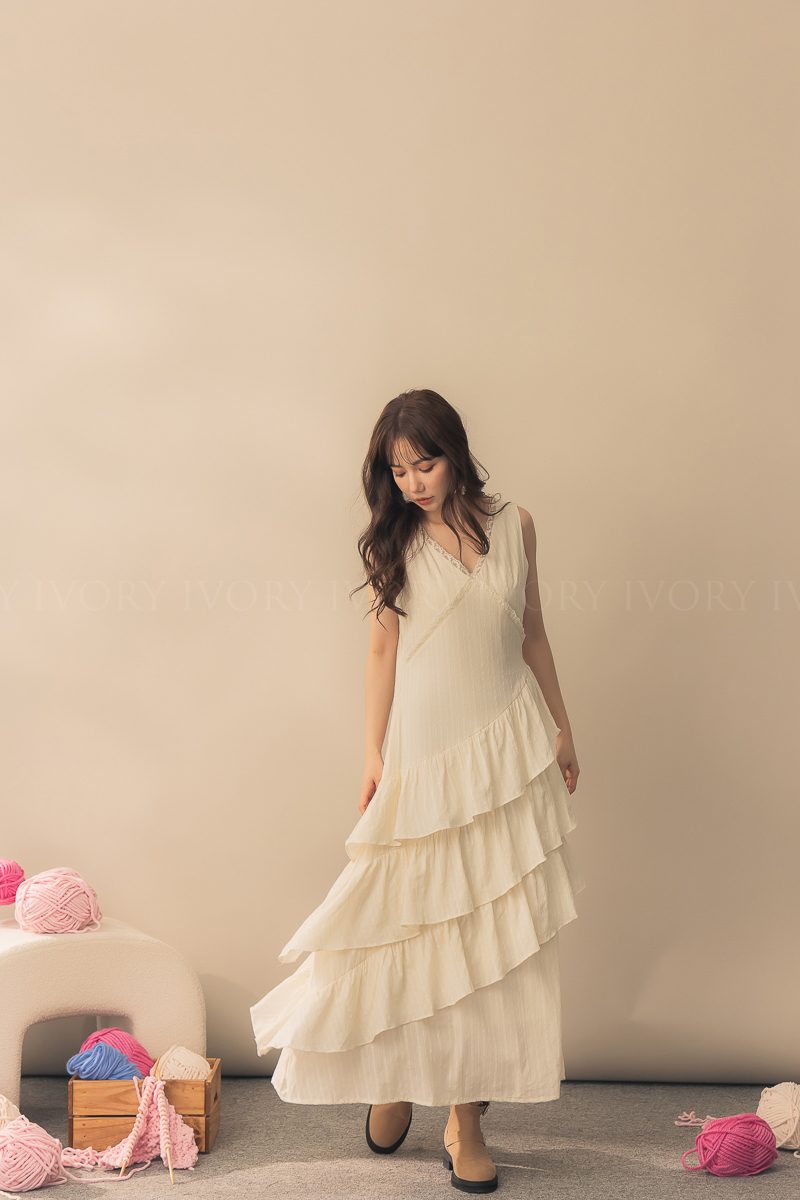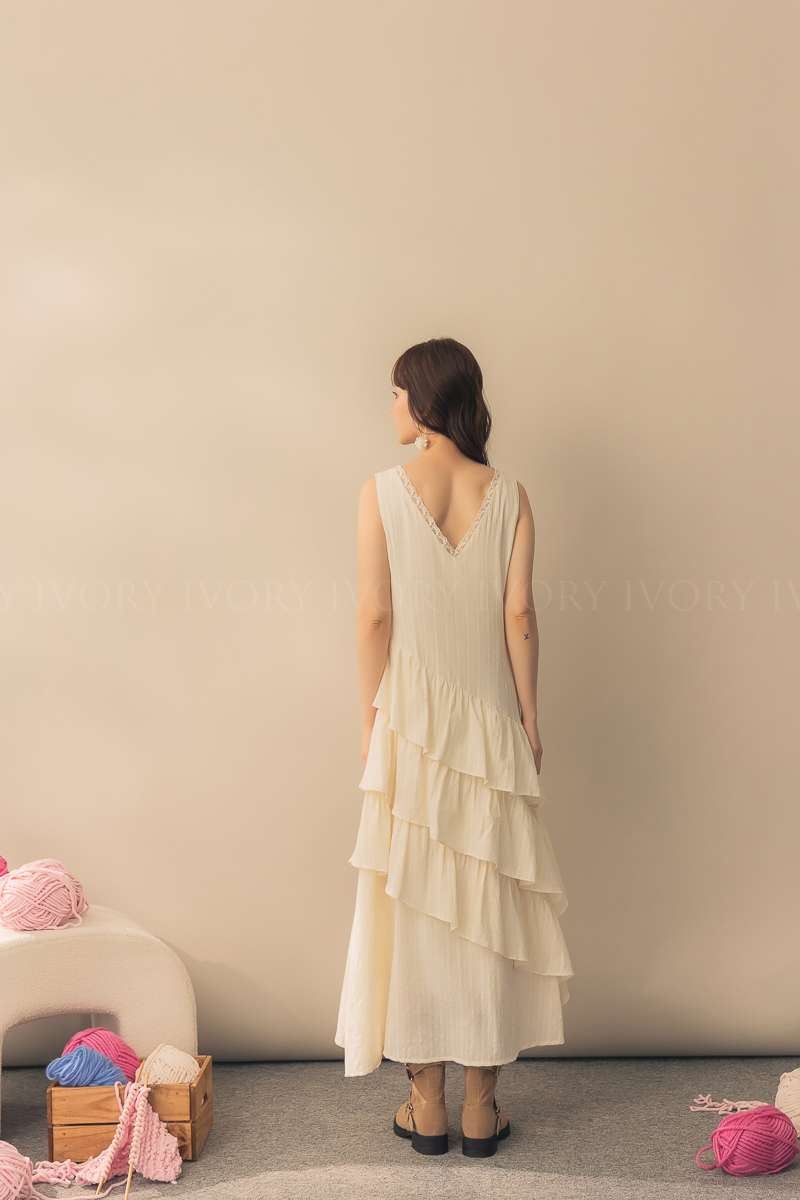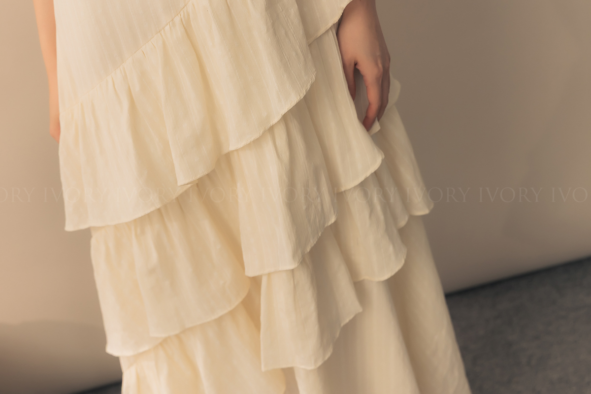 N51028小花圖騰刺繡斜襬荷葉長洋