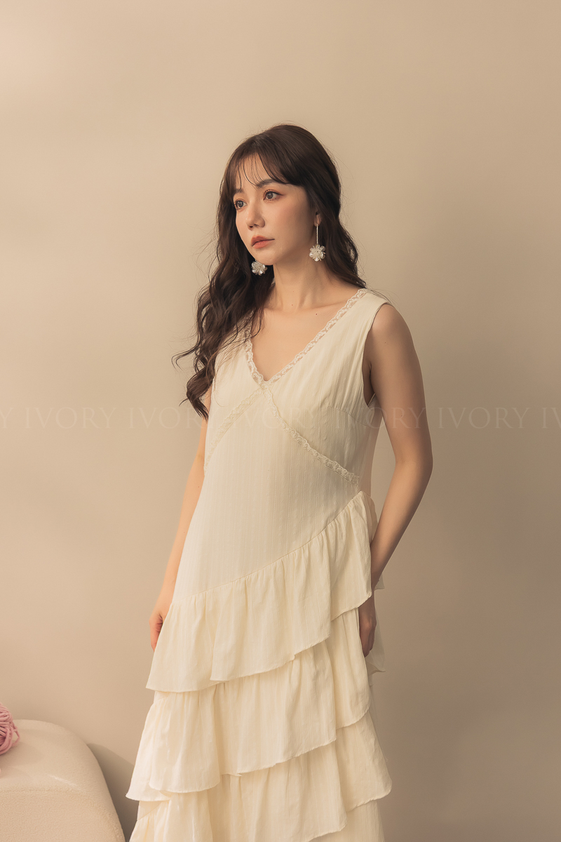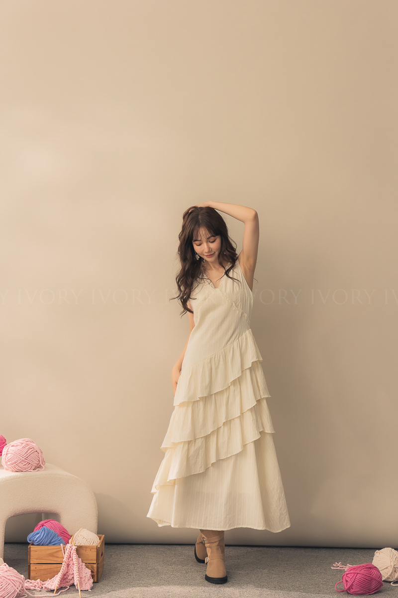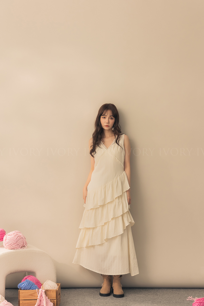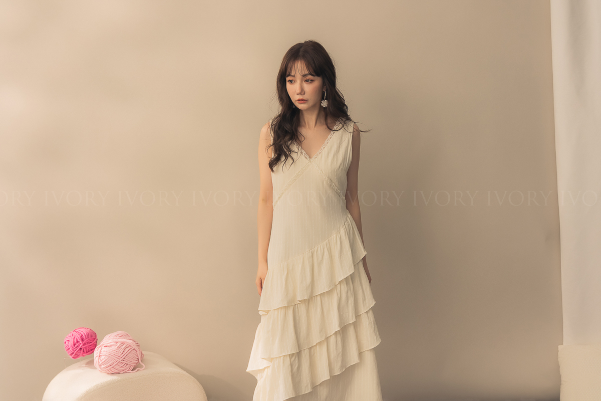 N51028小花圖騰刺繡斜襬荷葉長洋