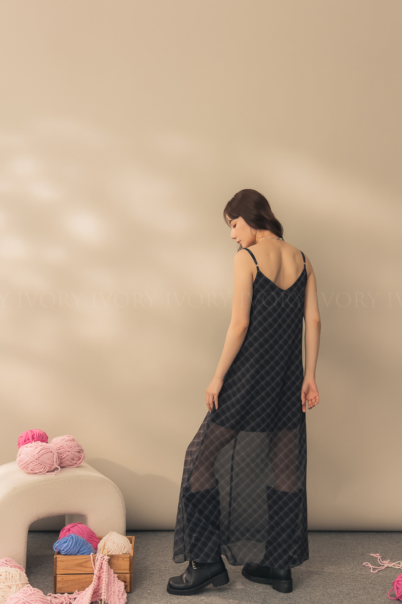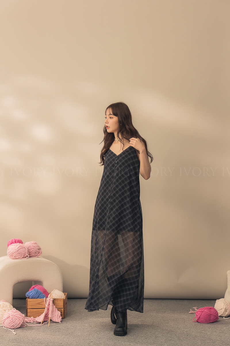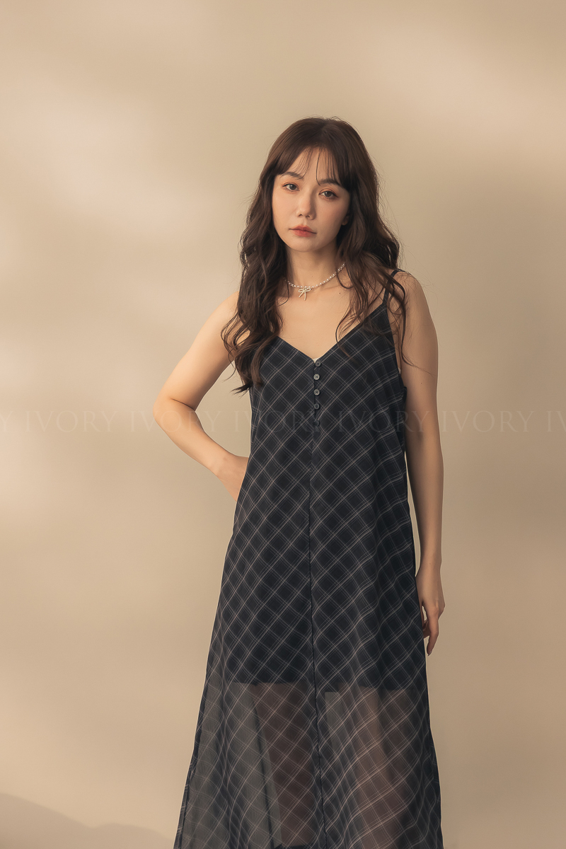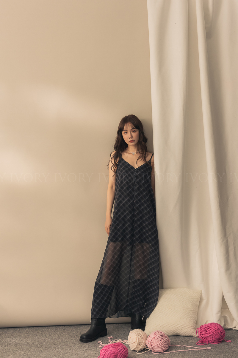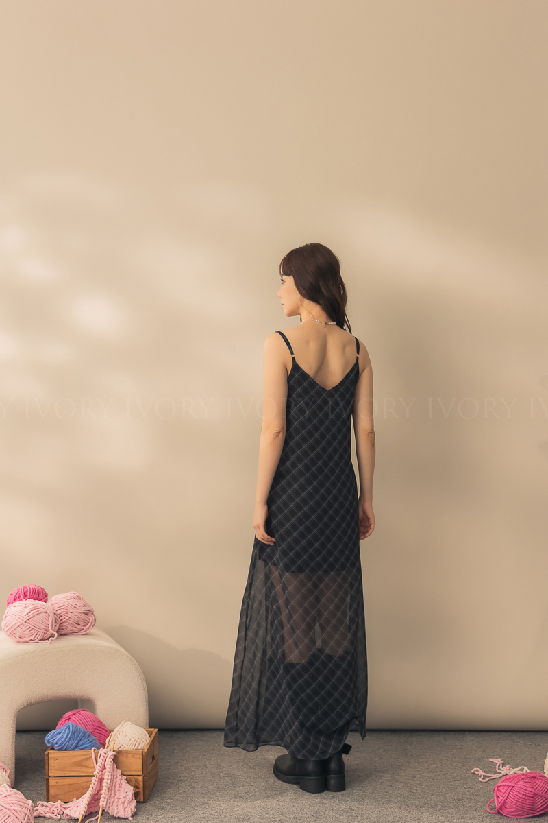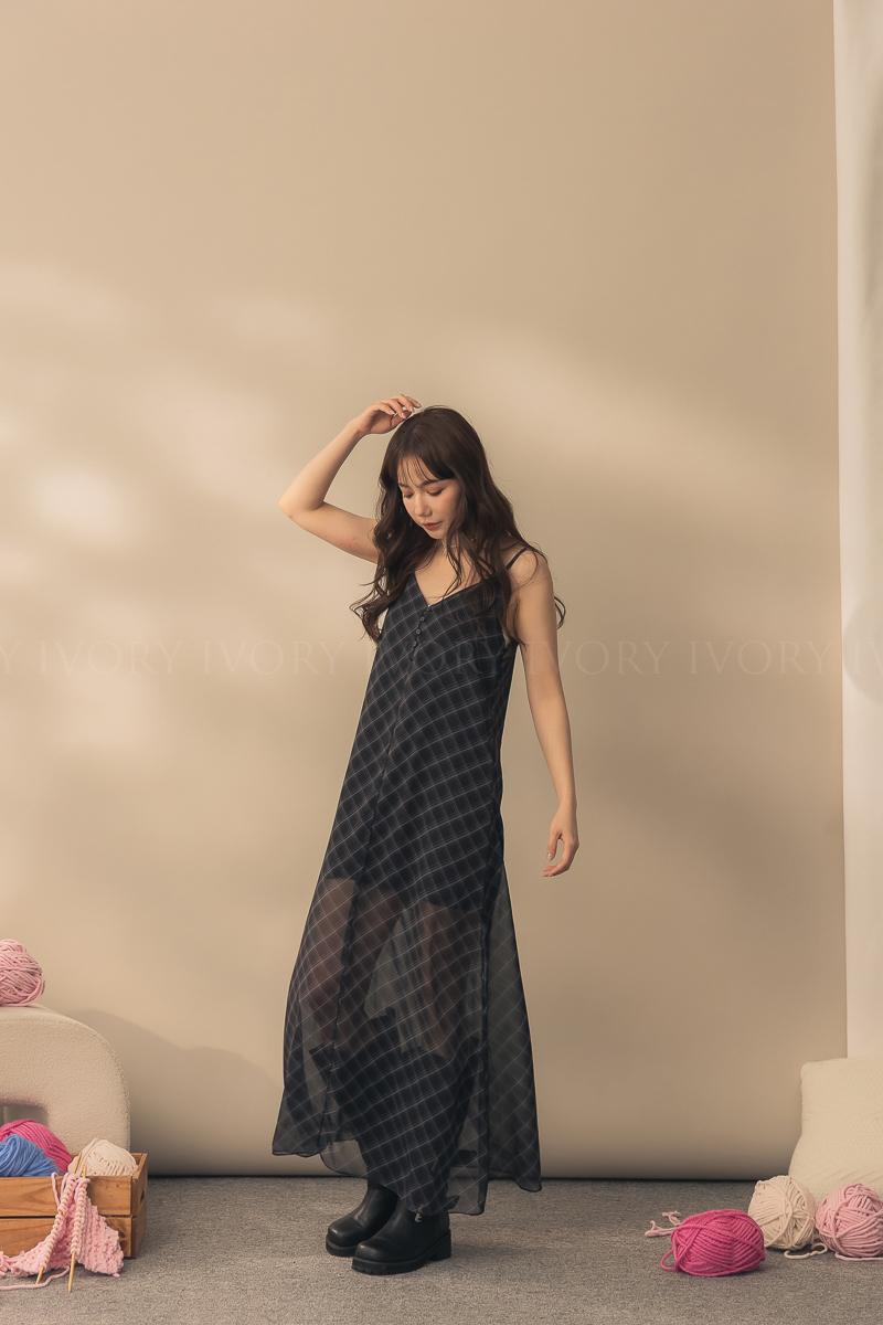 N51029時髦姐姐透紗格紋細肩長洋