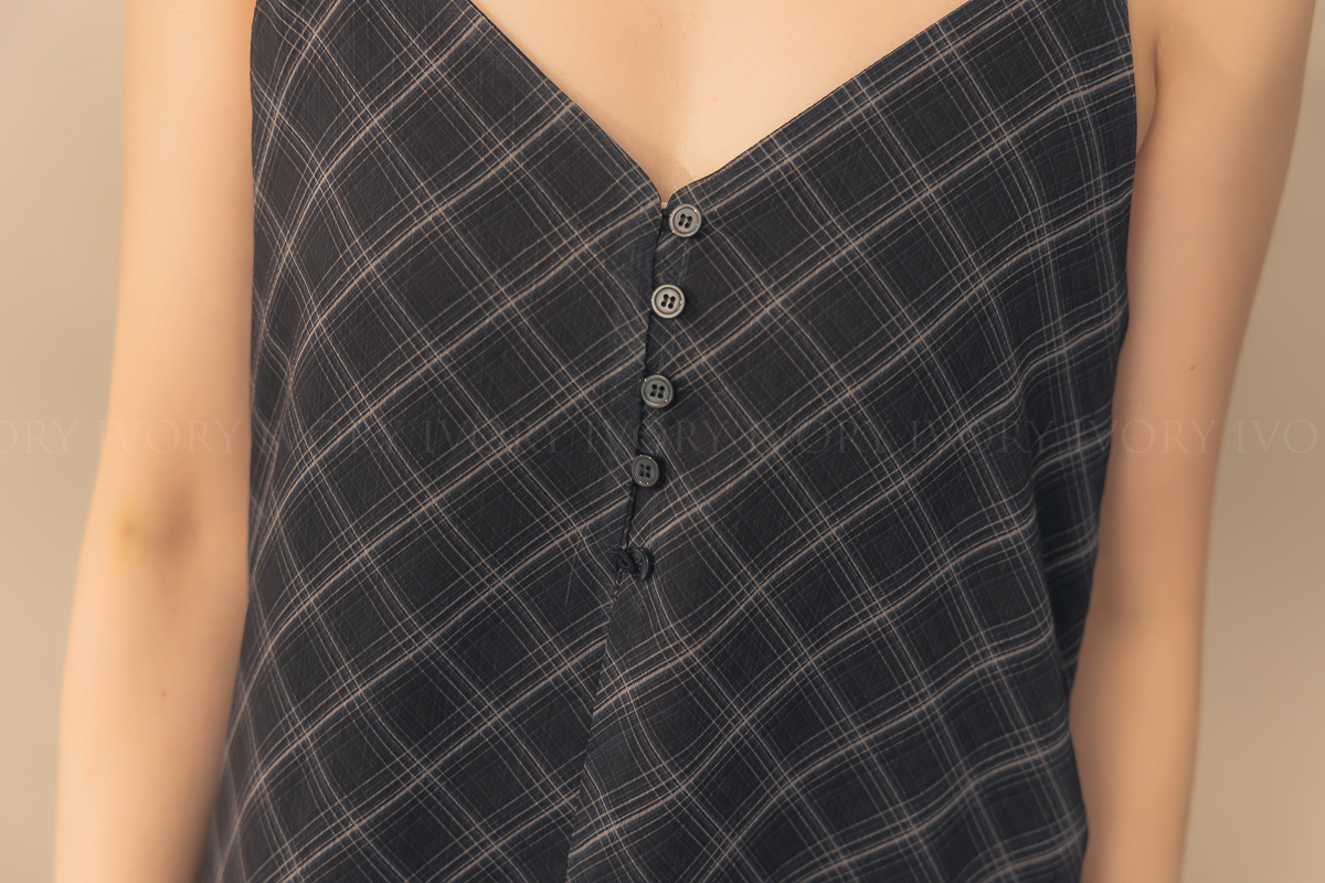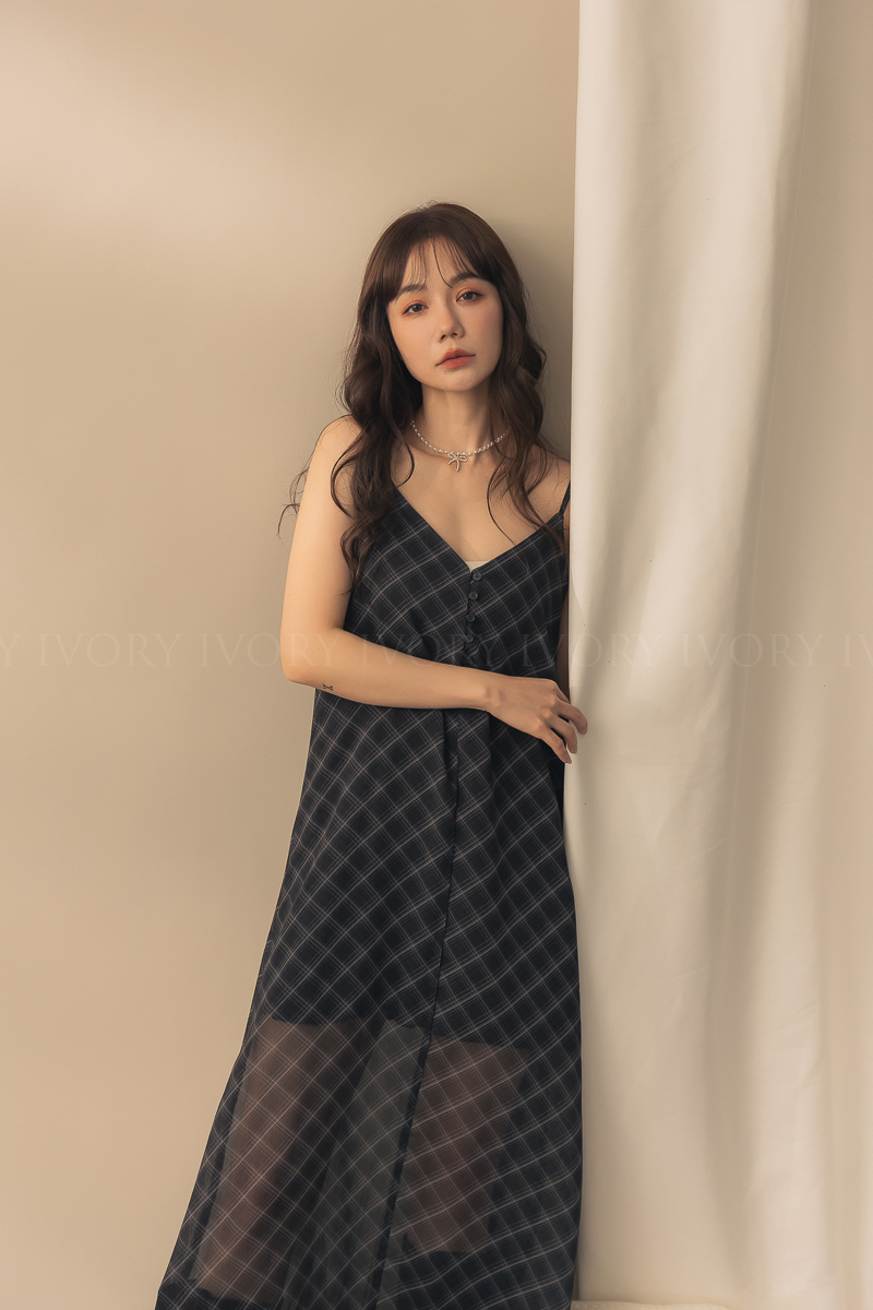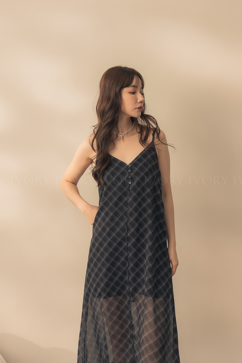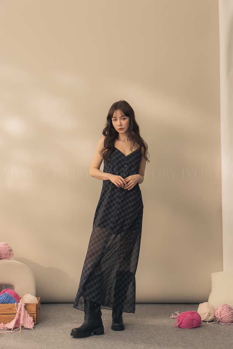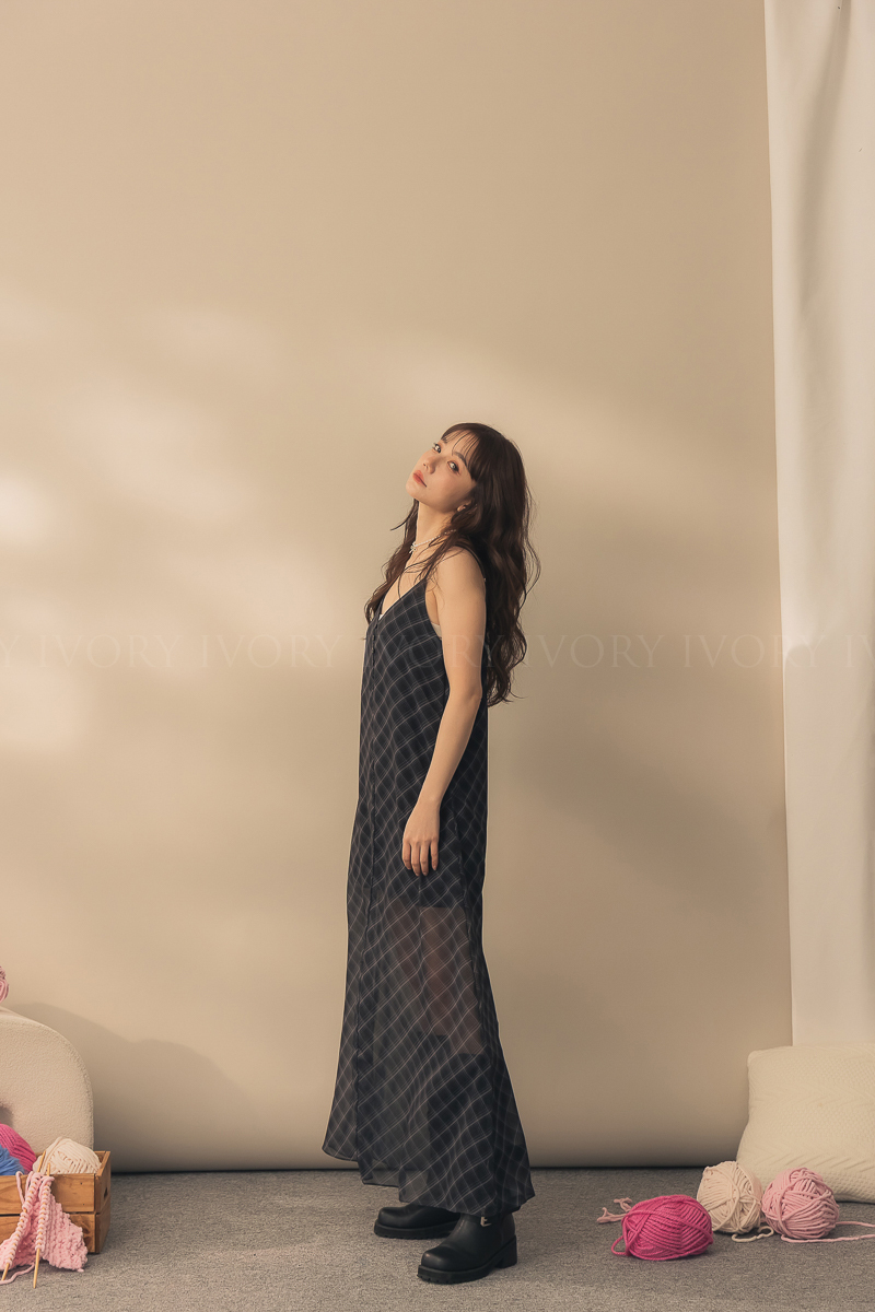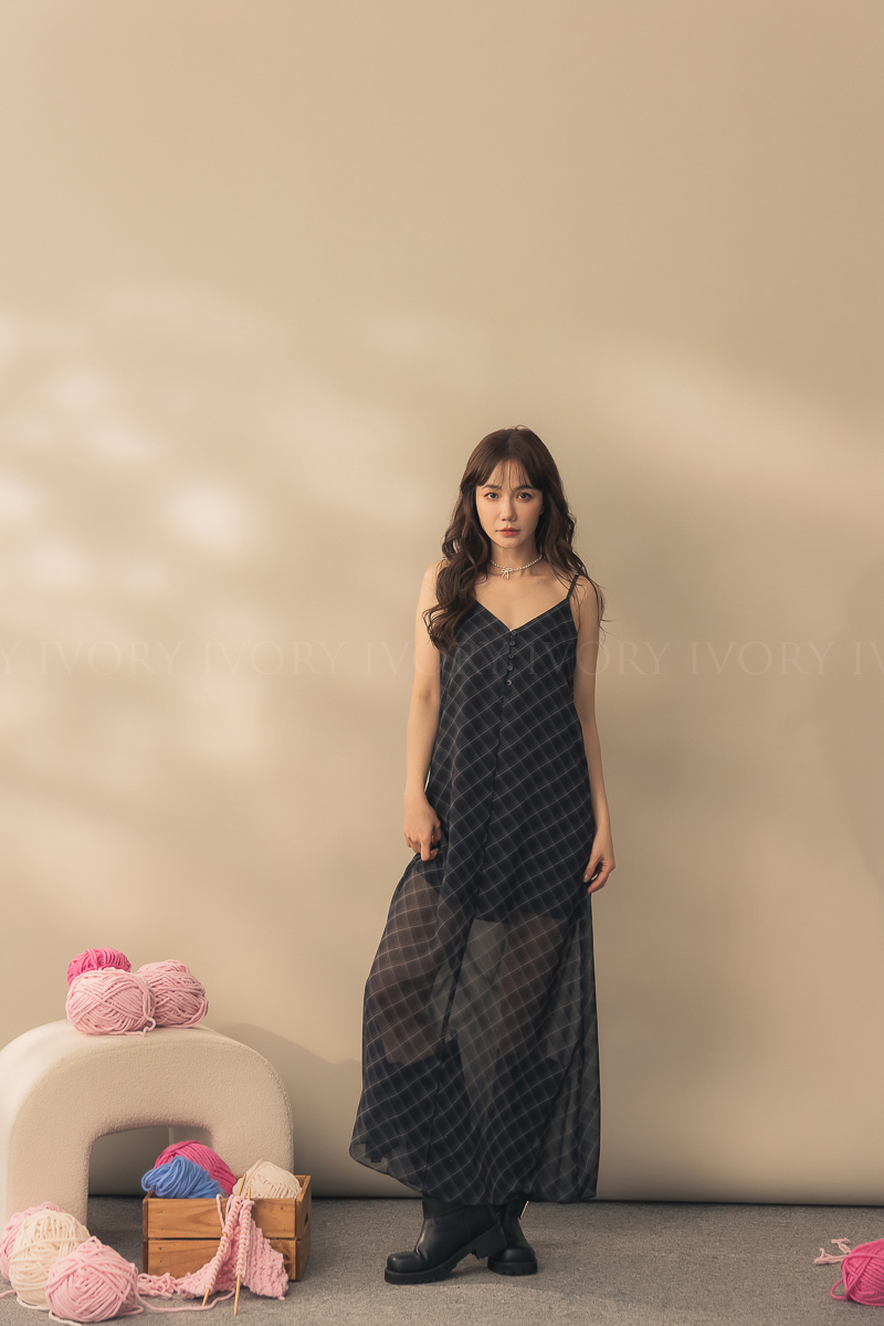 N51029時髦姐姐透紗格紋細肩長洋