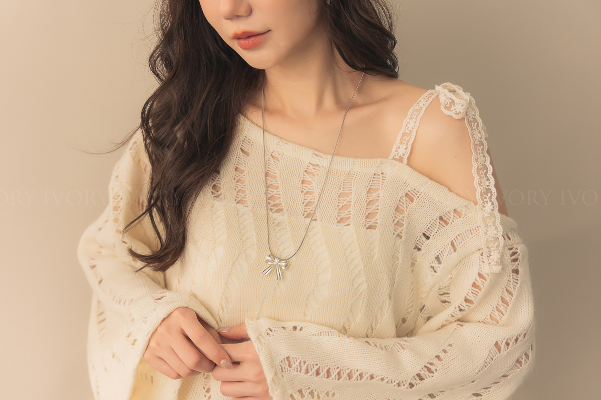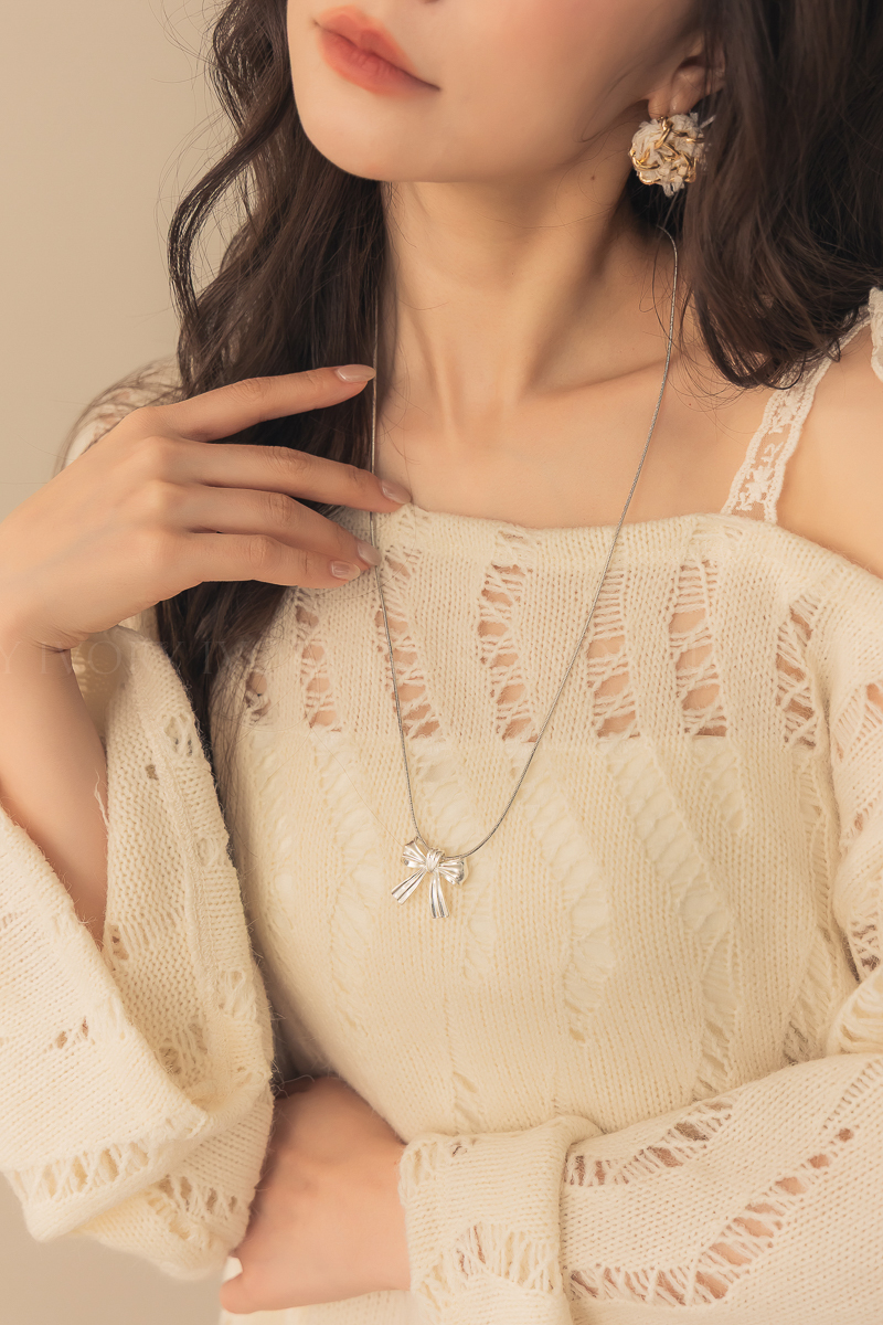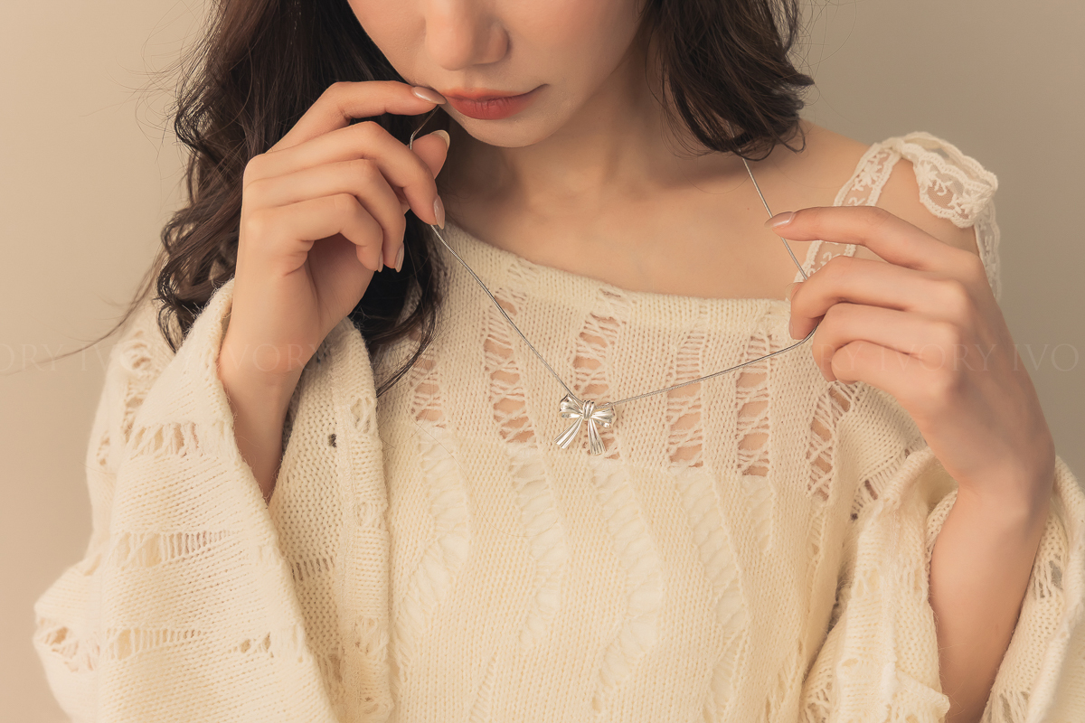 N51074緞帶感銀色大蝴蝶結可調式項鍊