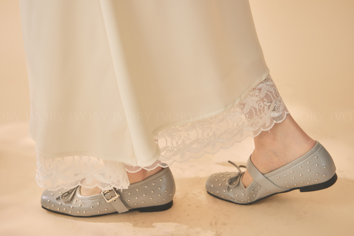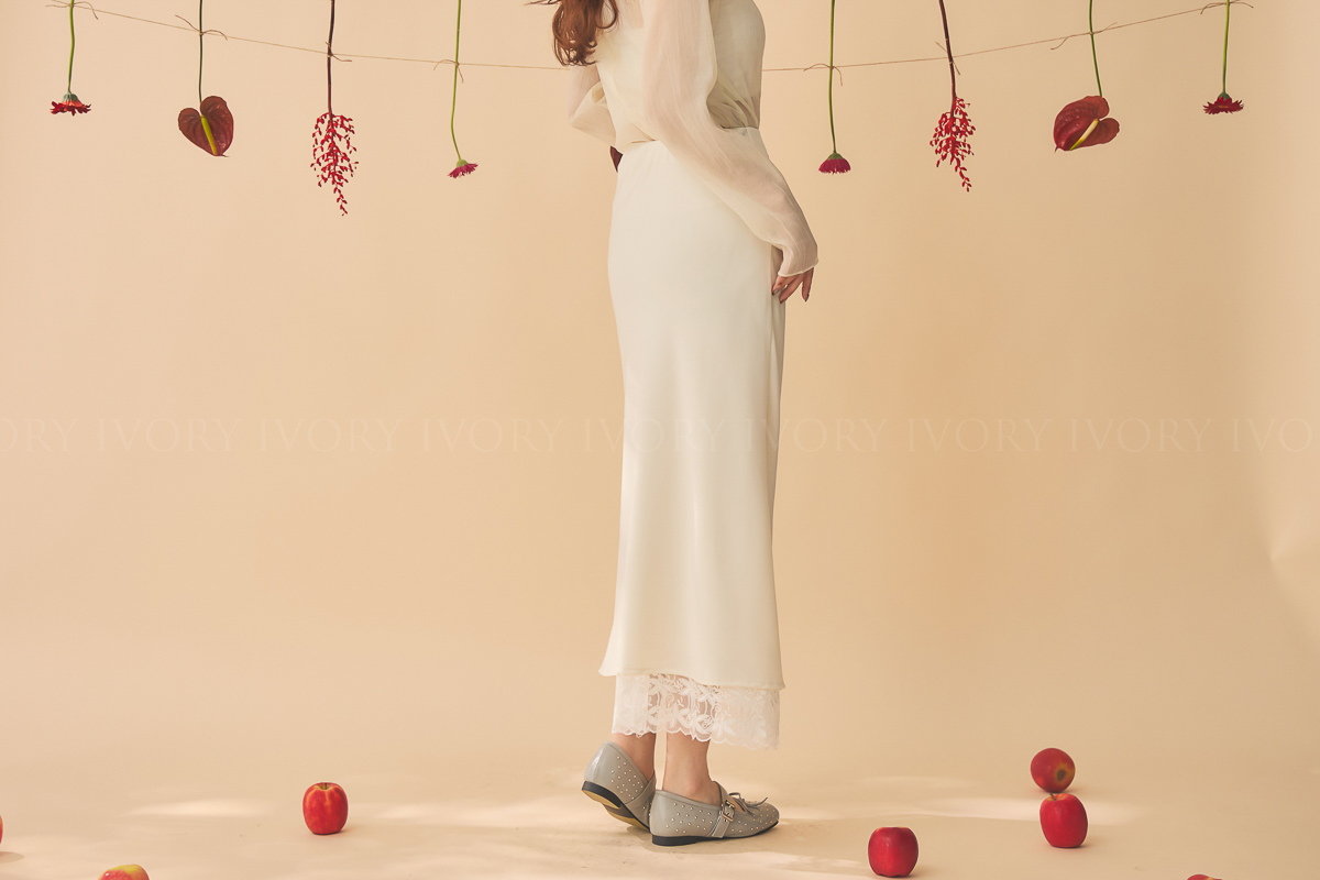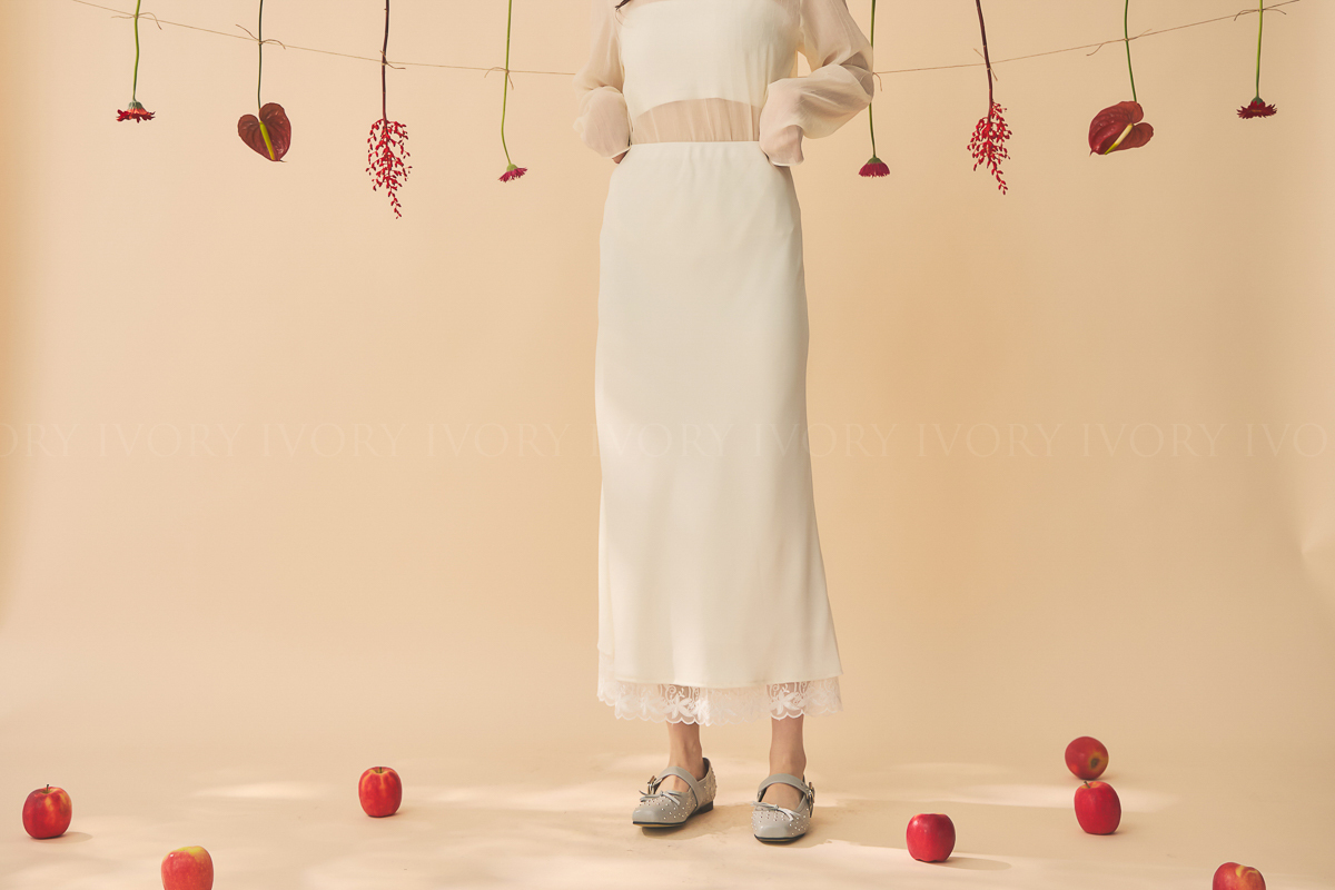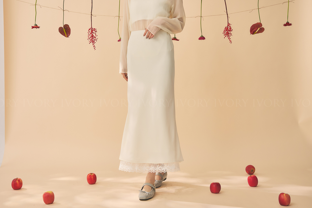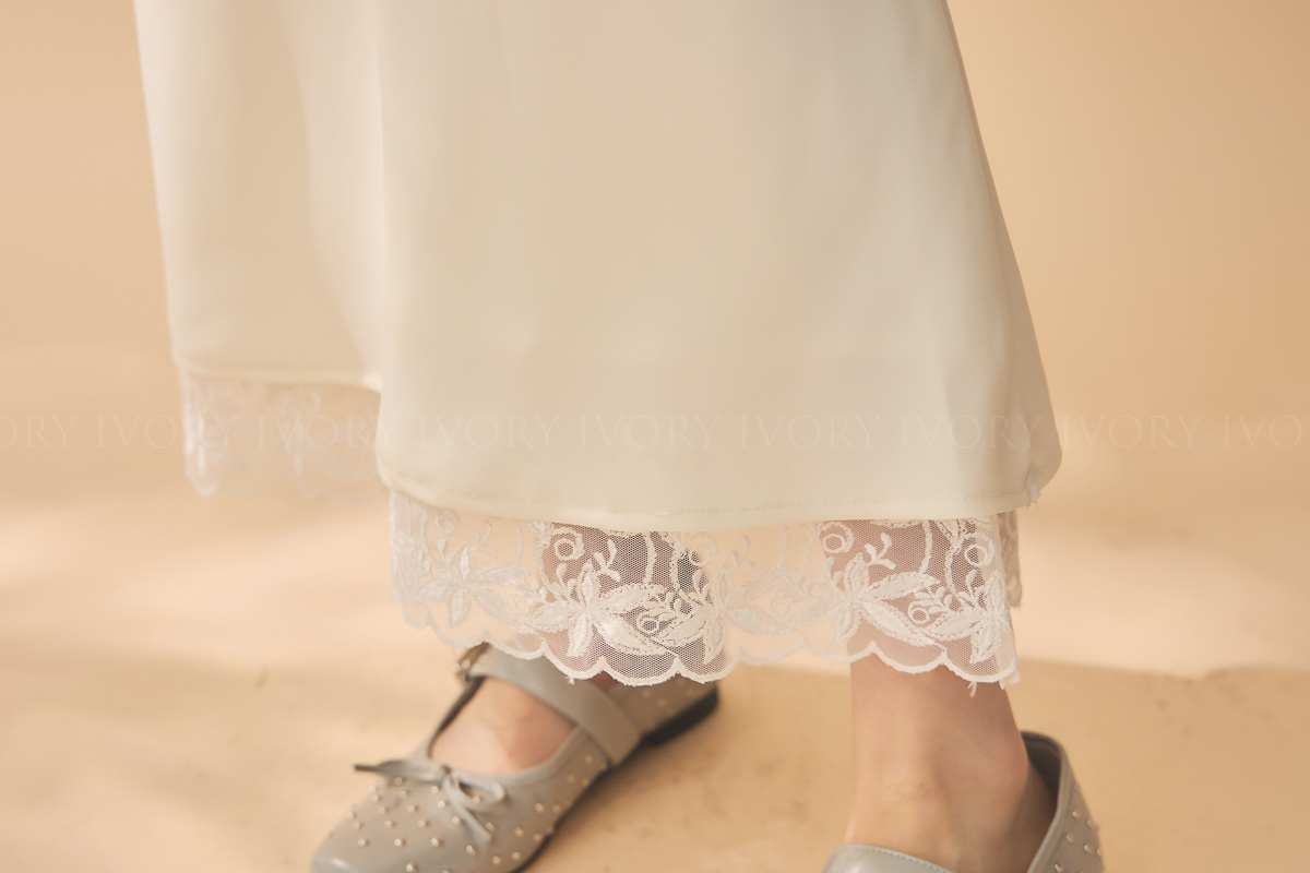 Q51011霧面絲光澤拼接蕾絲光朵紗長裙
