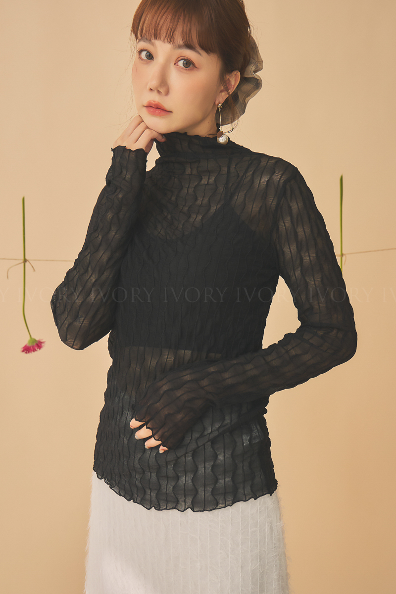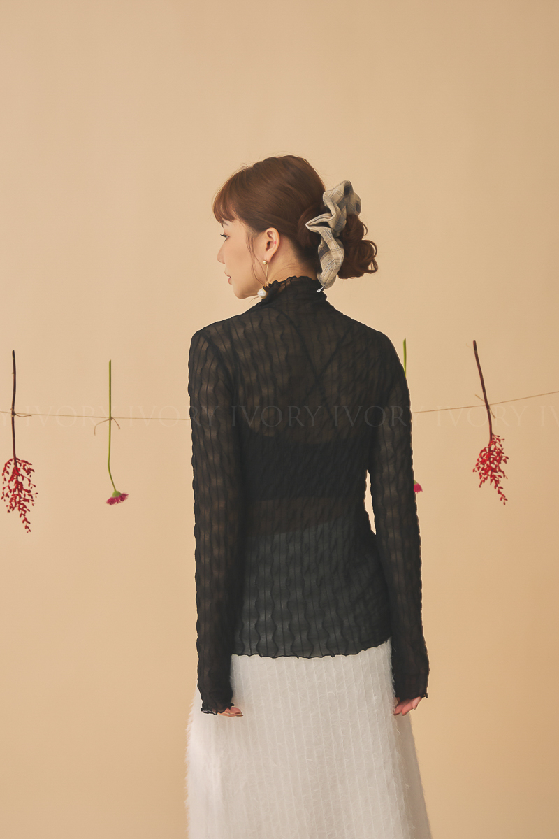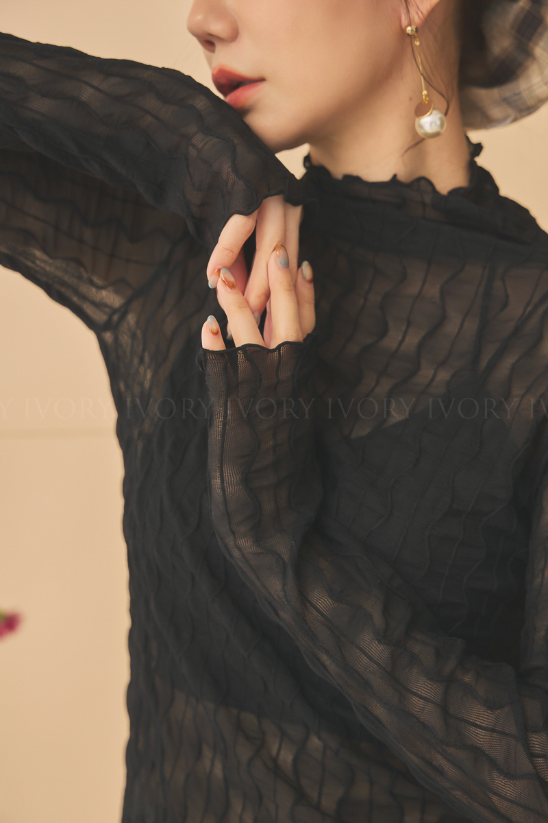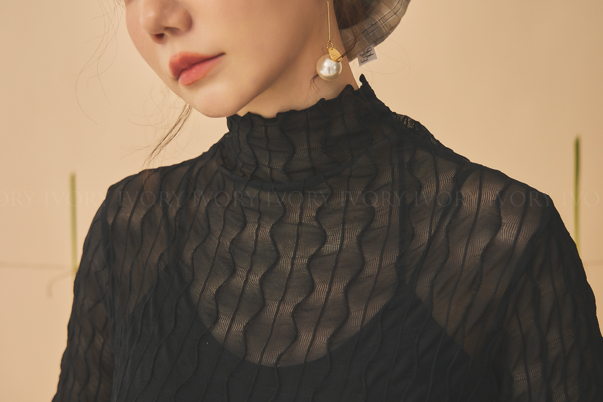 Q51023波浪透紗彈力小立領打底上衣