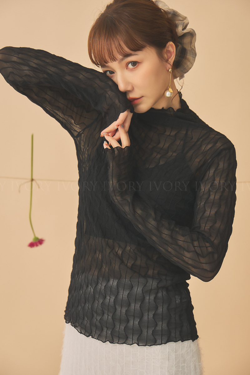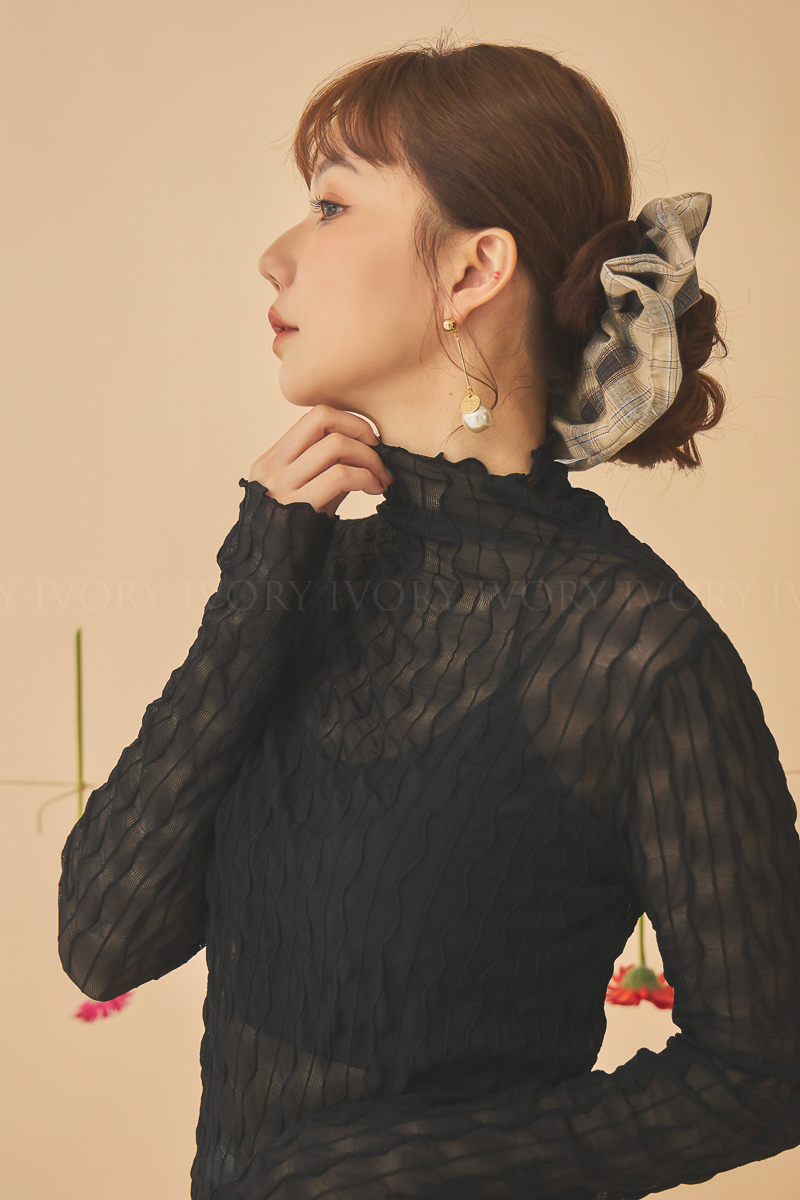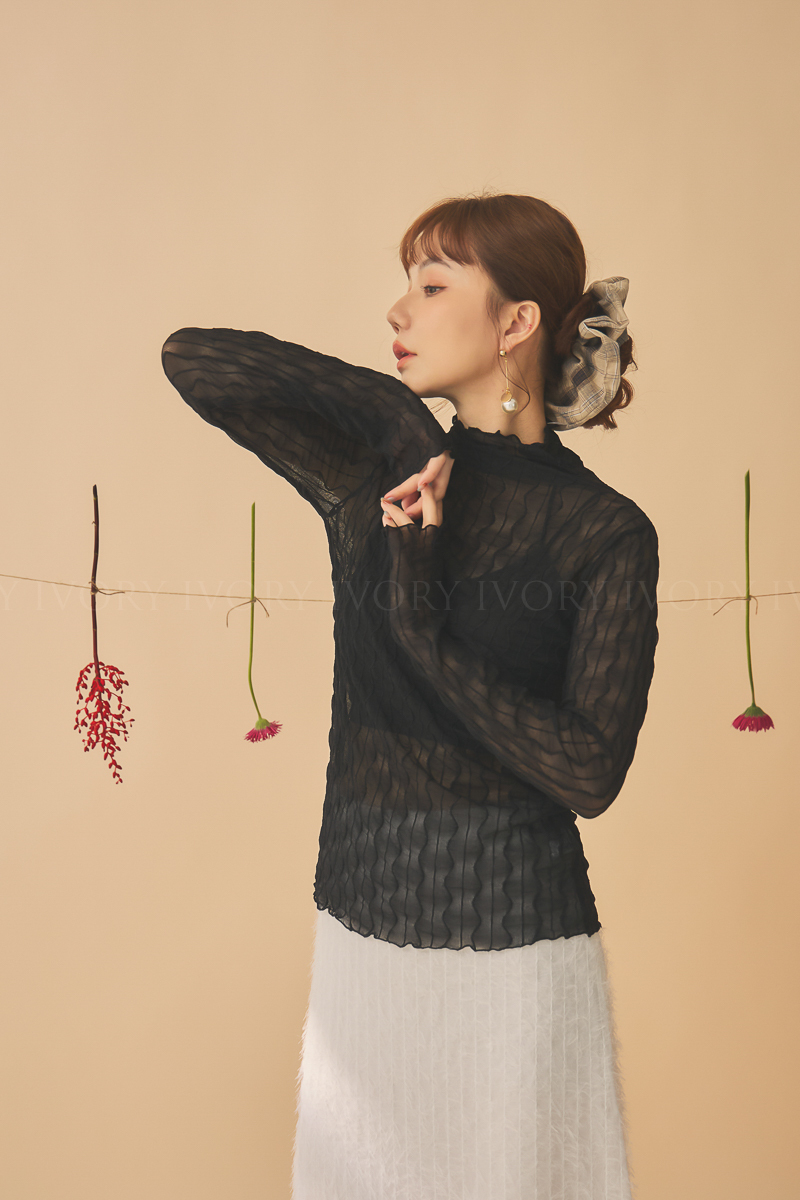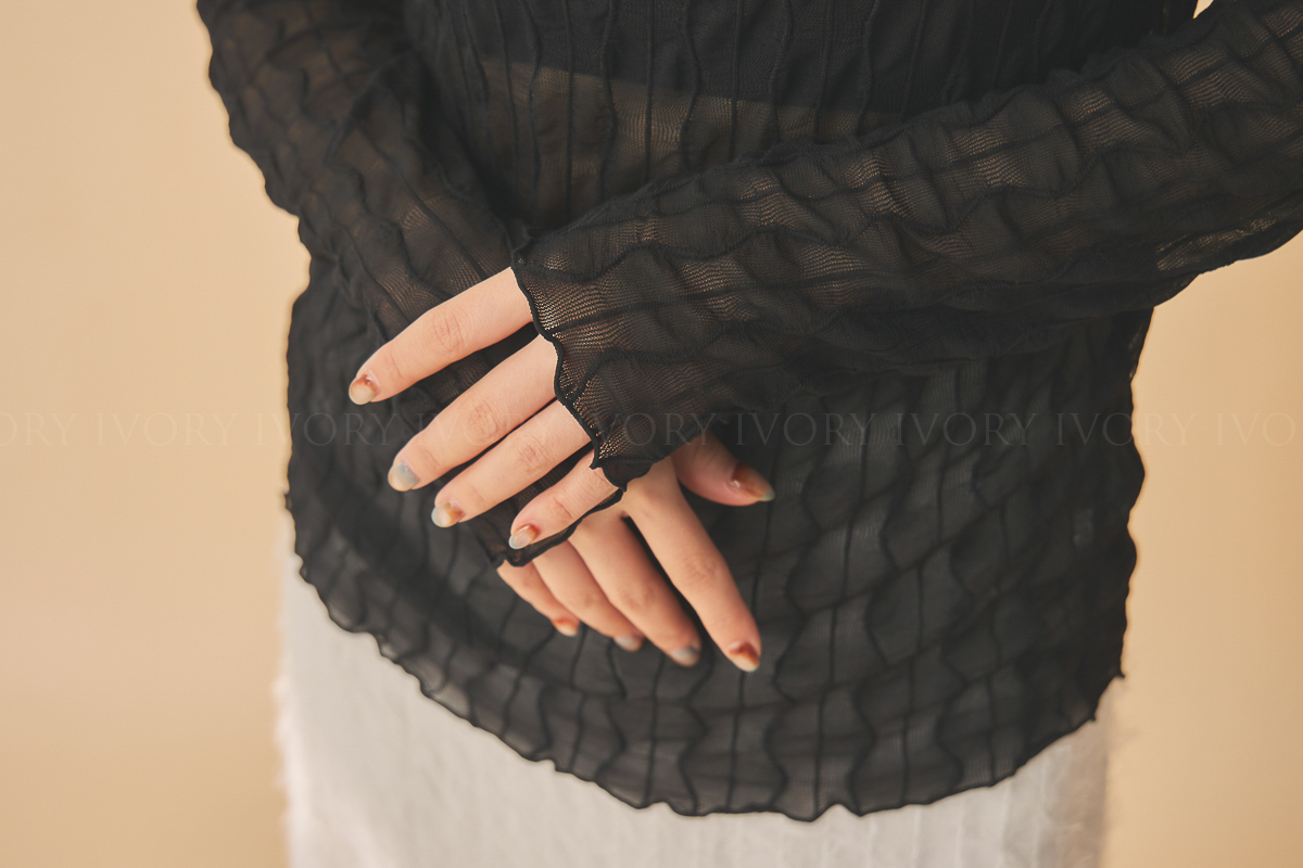 Q51023波浪透紗彈力小立領打底上衣