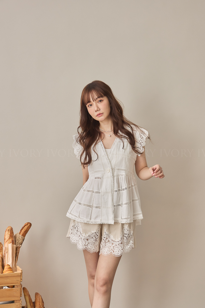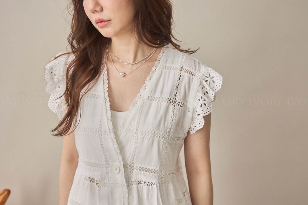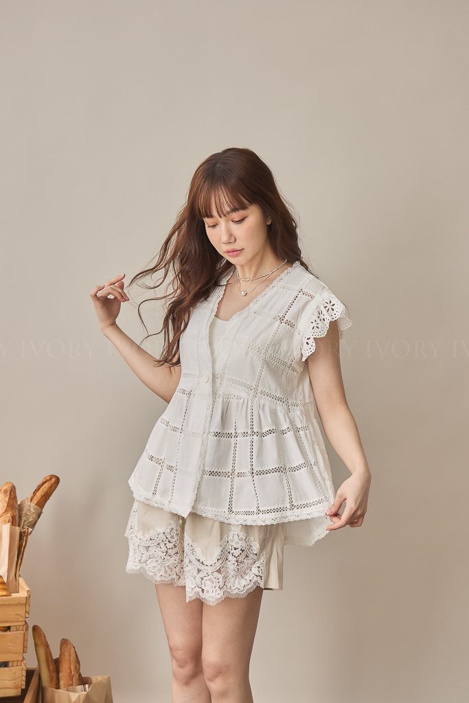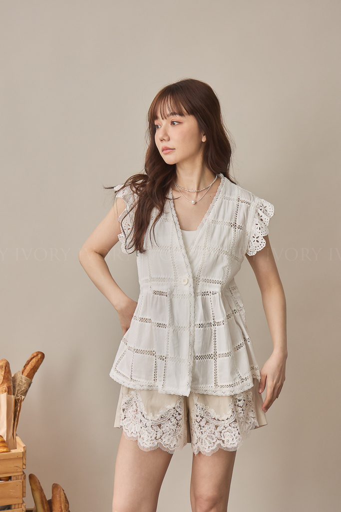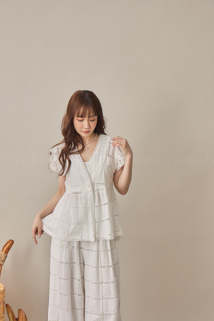 S59013方格緹花布大V領開襟上衣