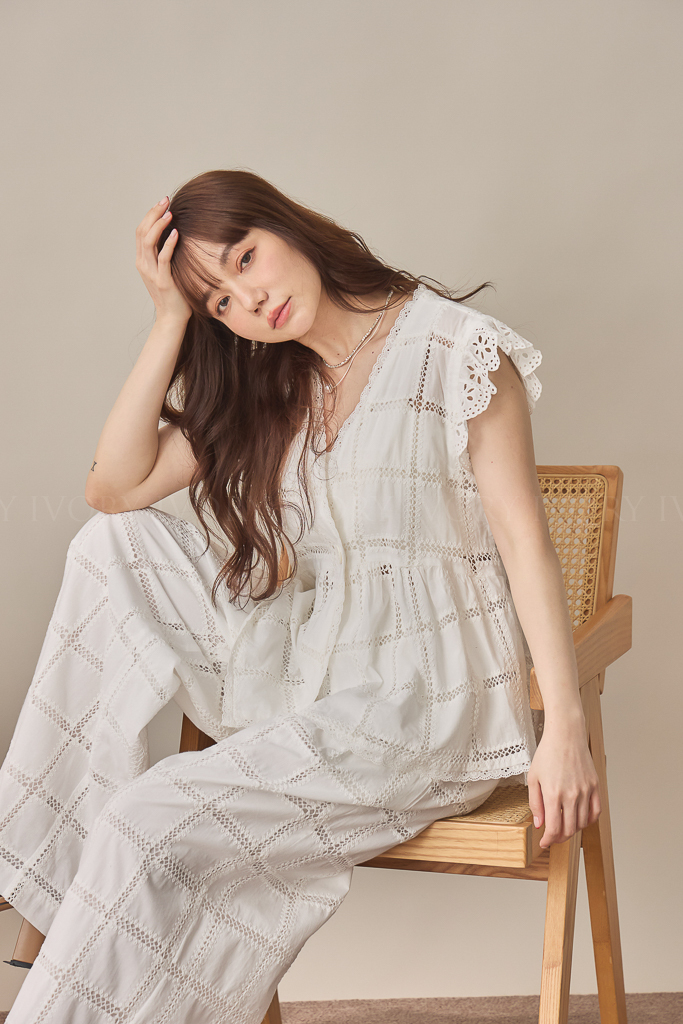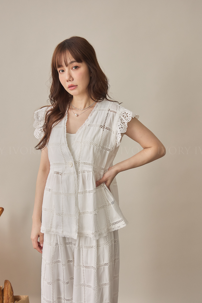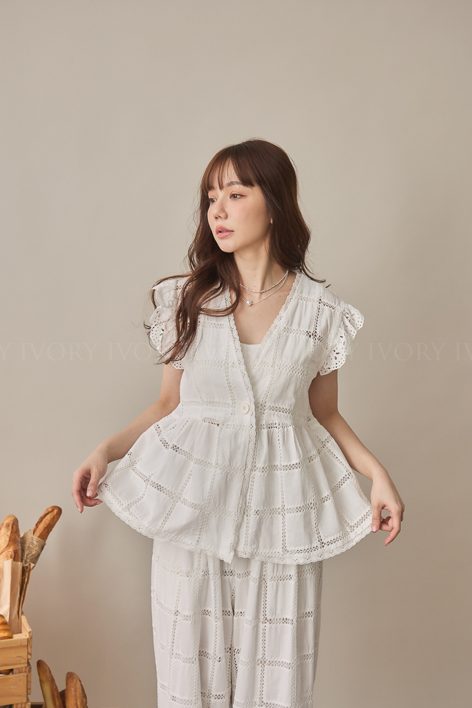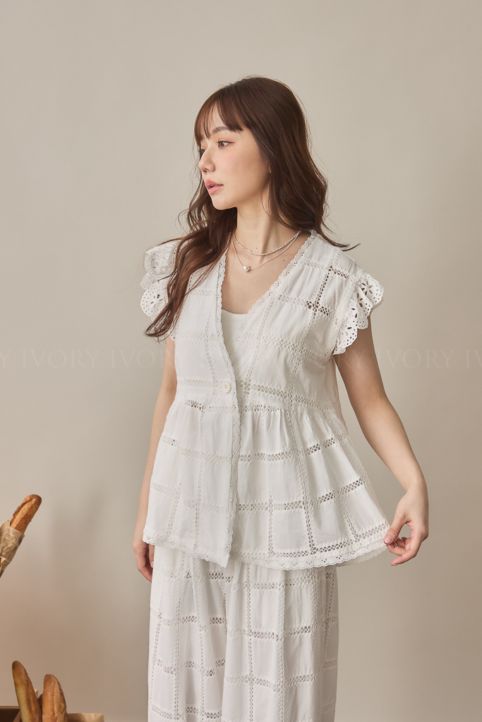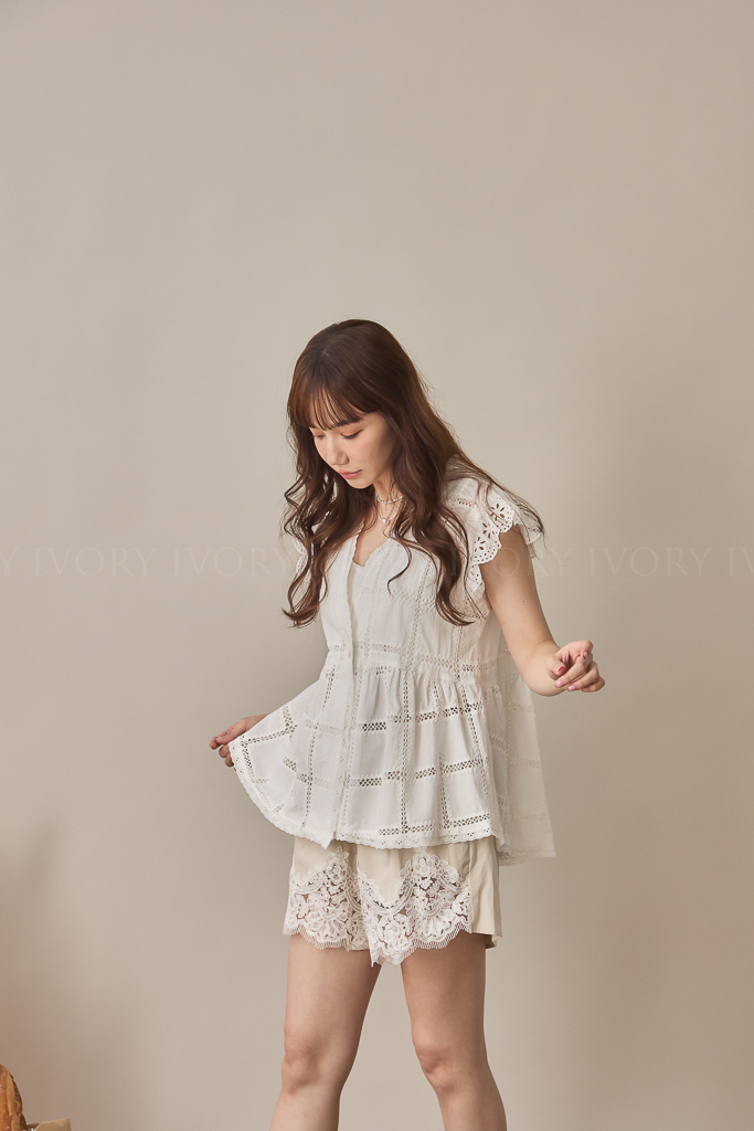 S59013方格緹花布大V領開襟上衣