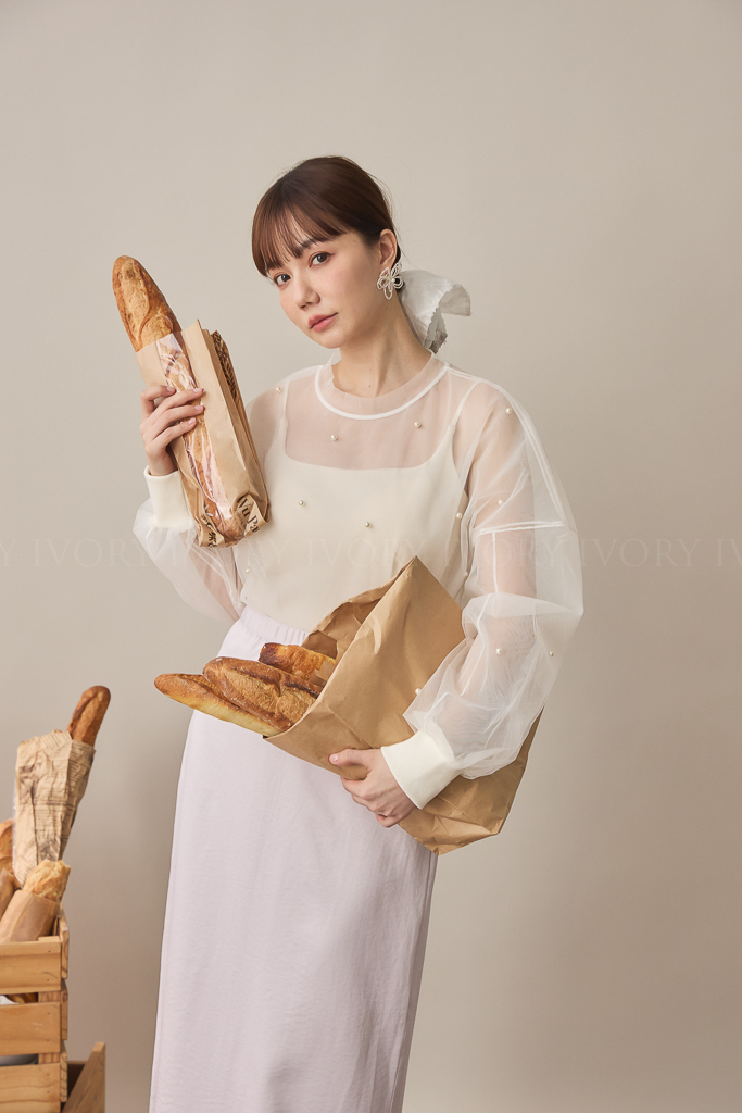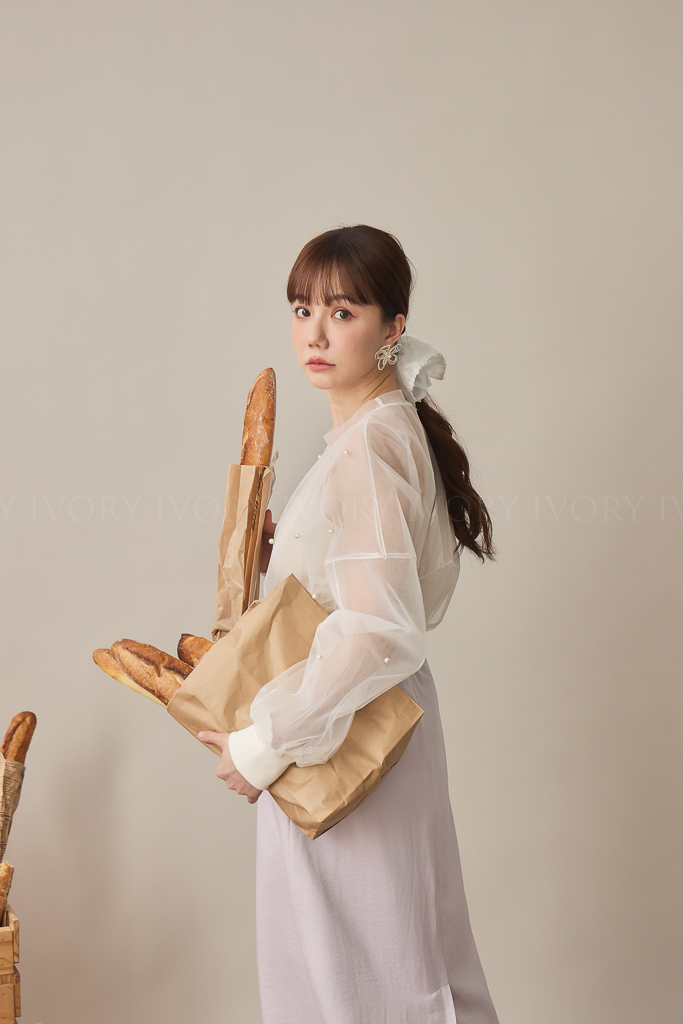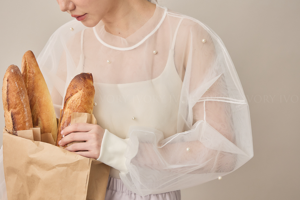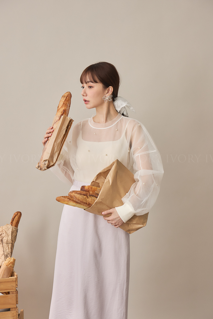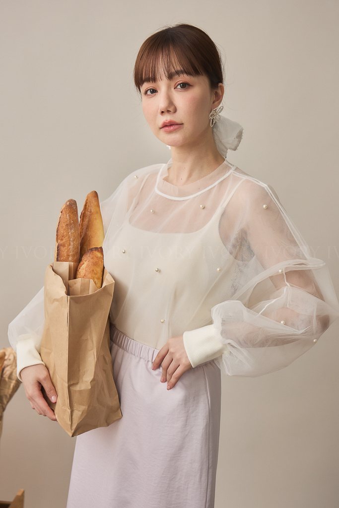S59025雙層網紗珍珠釘釦澎袖上衣