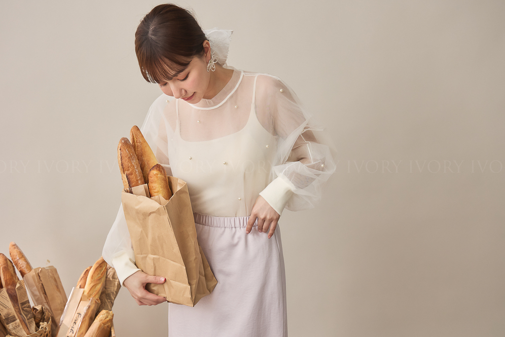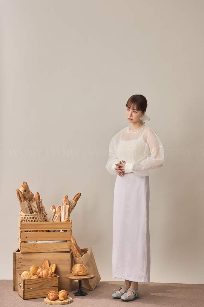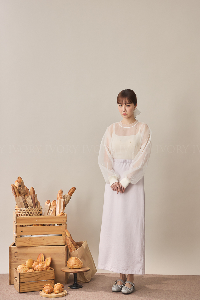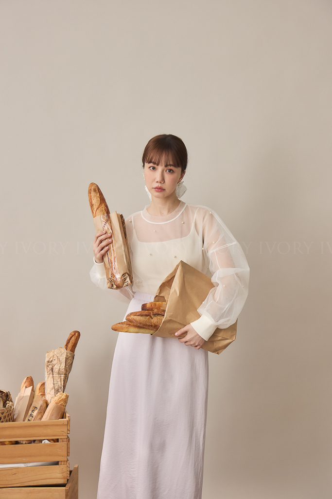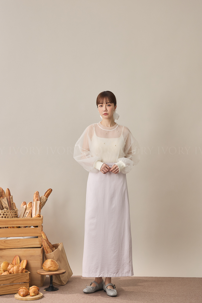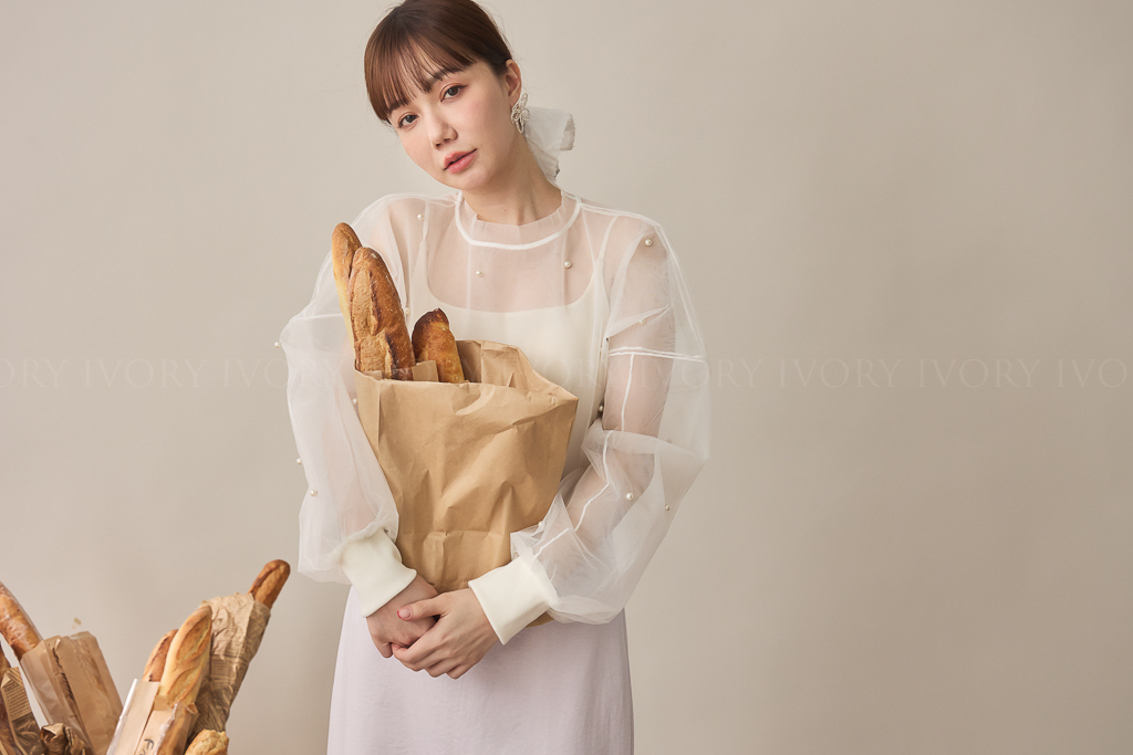 S59025雙層網紗珍珠釘釦澎袖上衣
