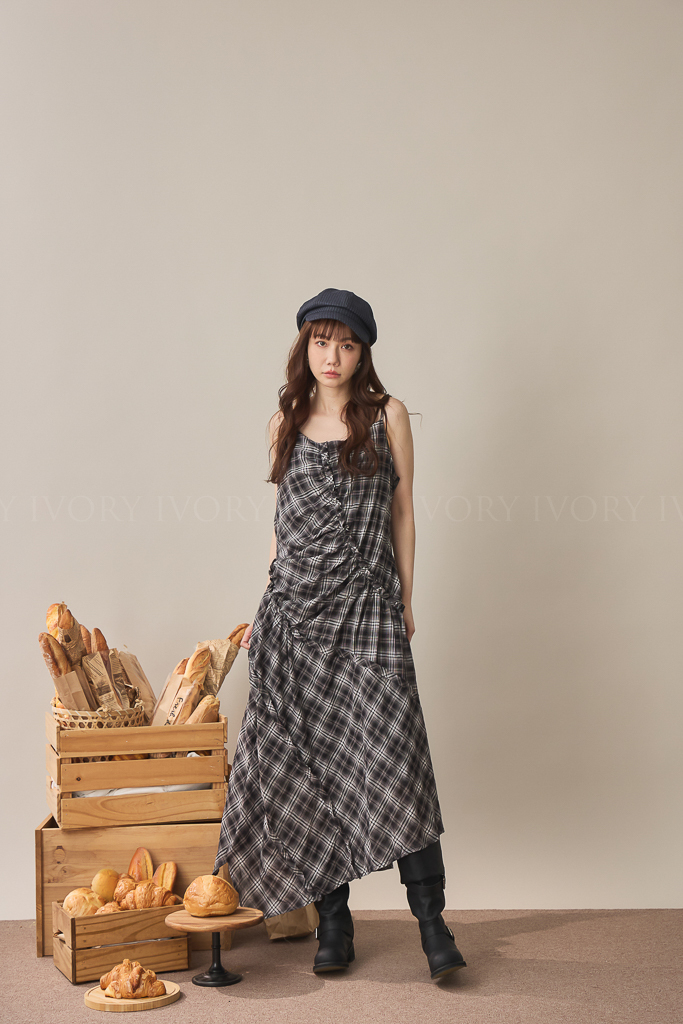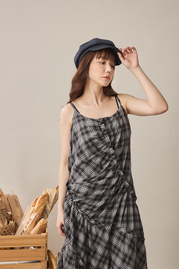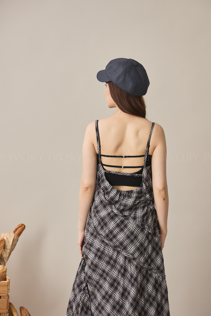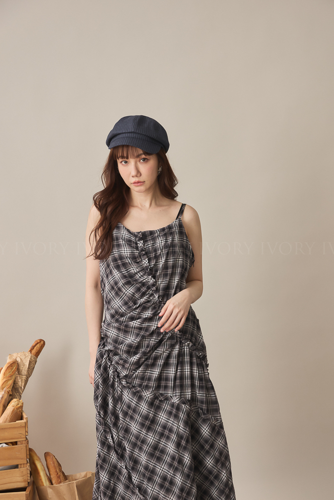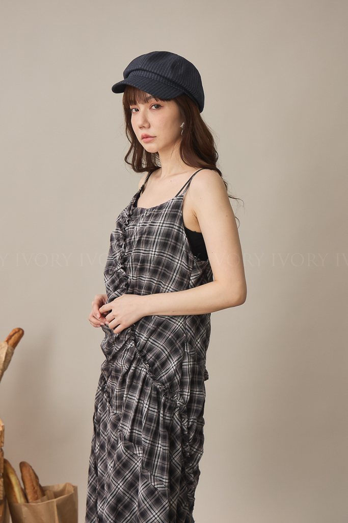 S59045不規則抓皺感格紋細肩背心洋