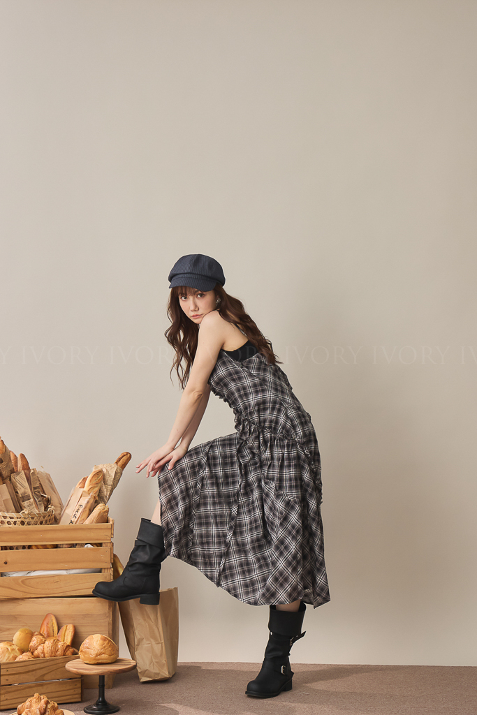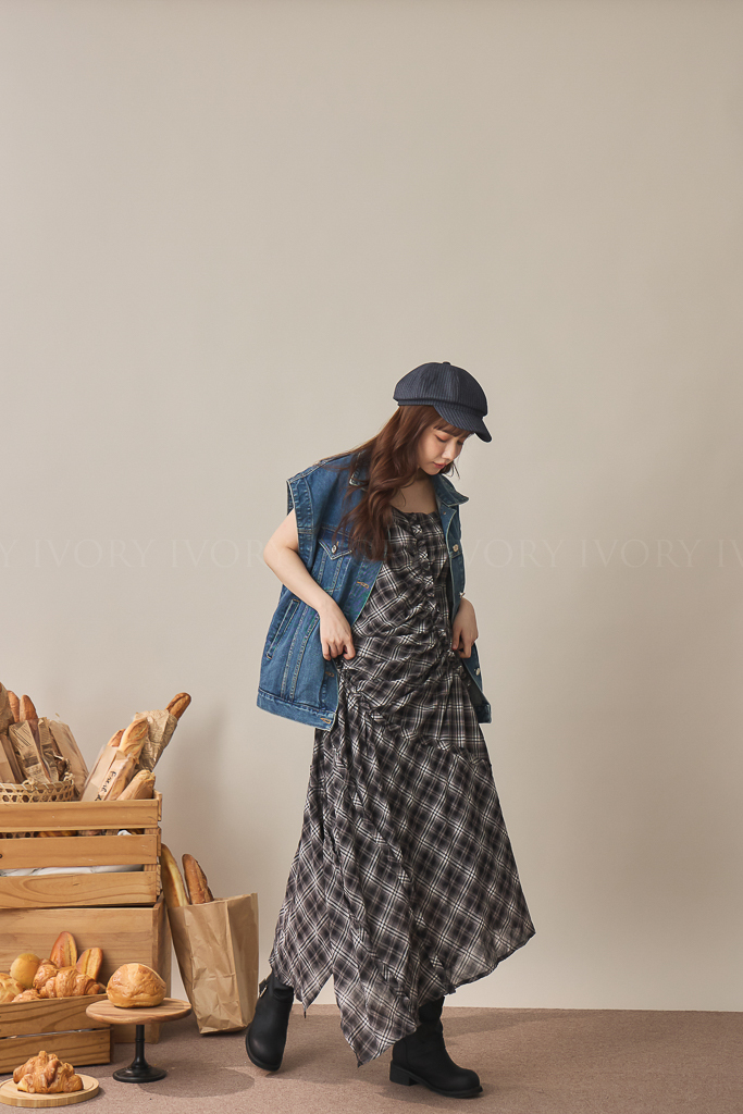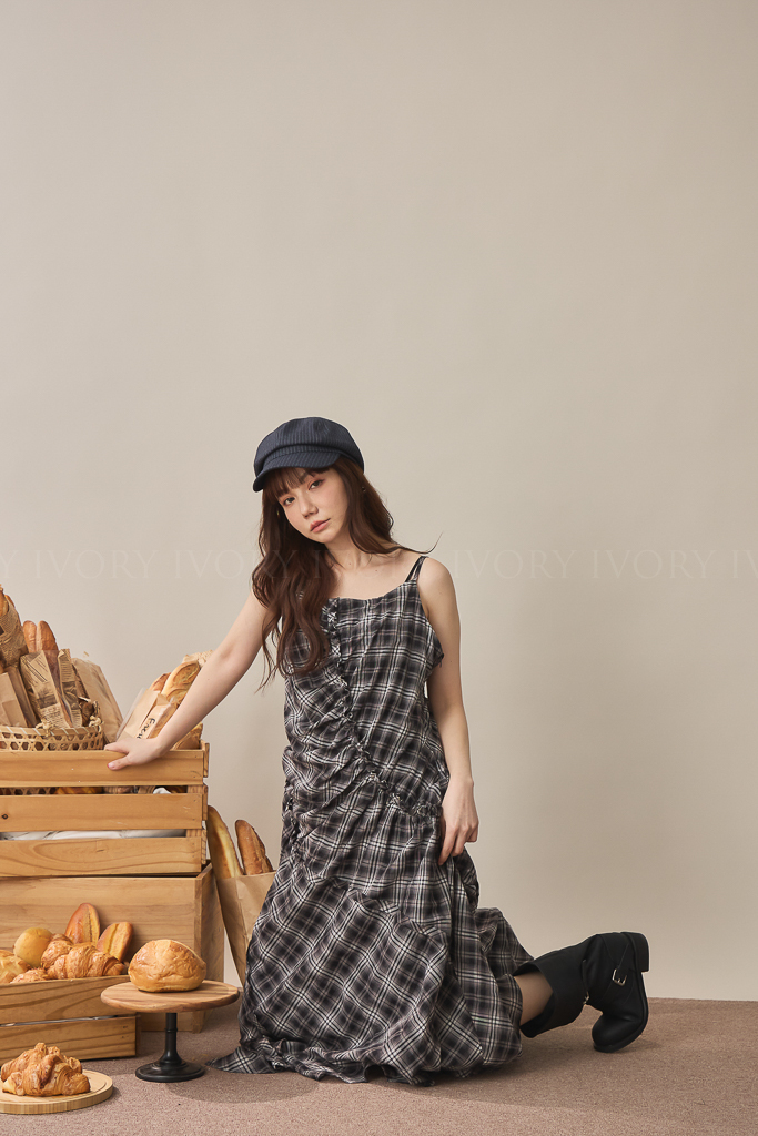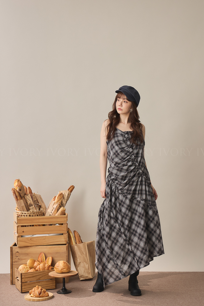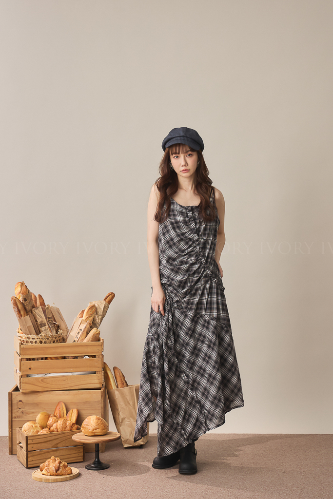 S59045不規則抓皺感格紋細肩背心洋