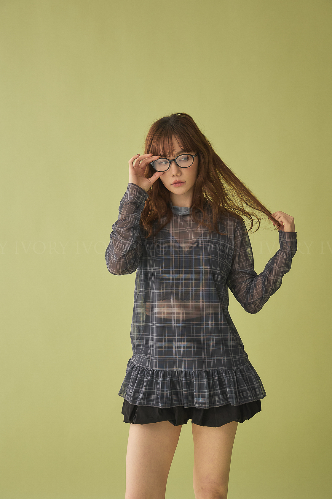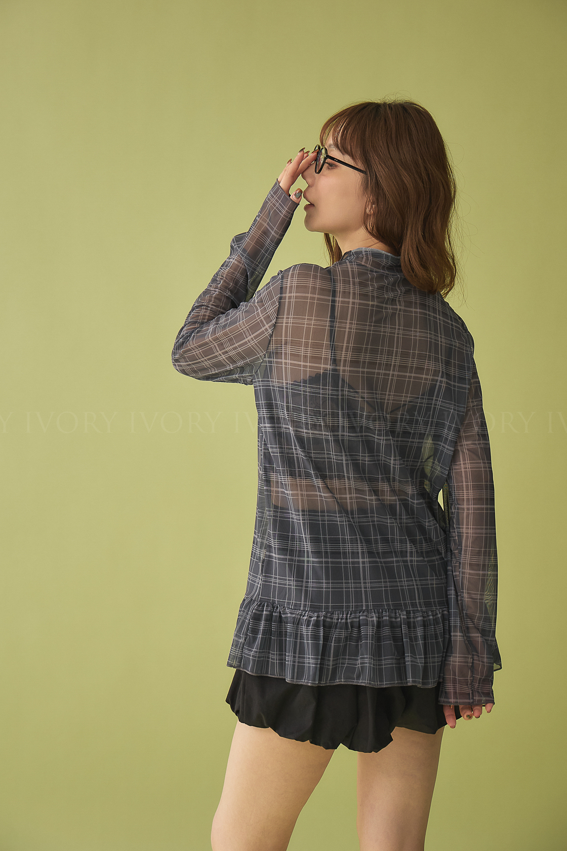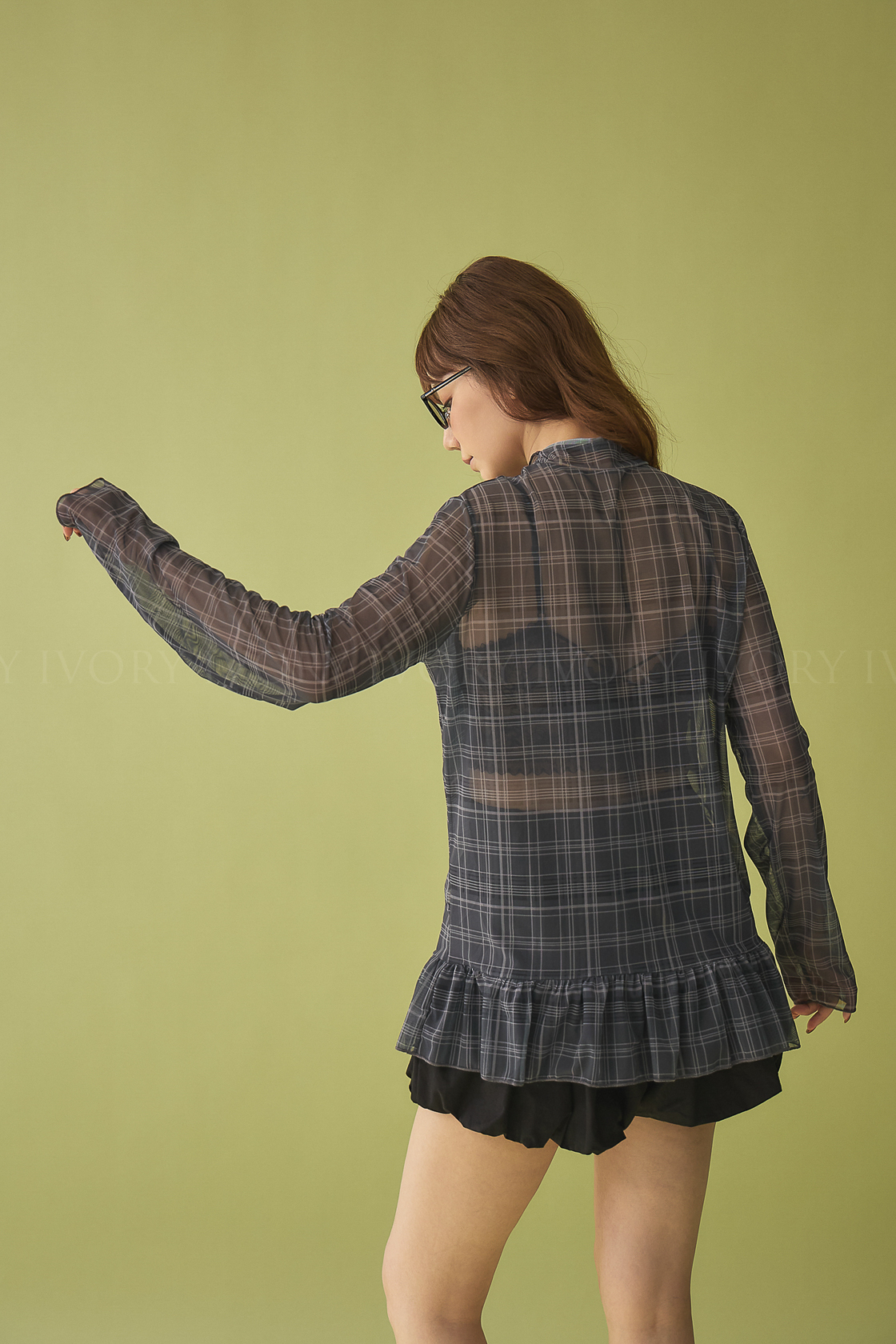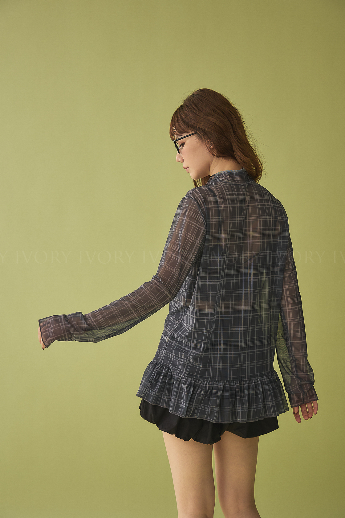 M60324英倫格紋透紗裙擺小立領上衣(可青清單)
